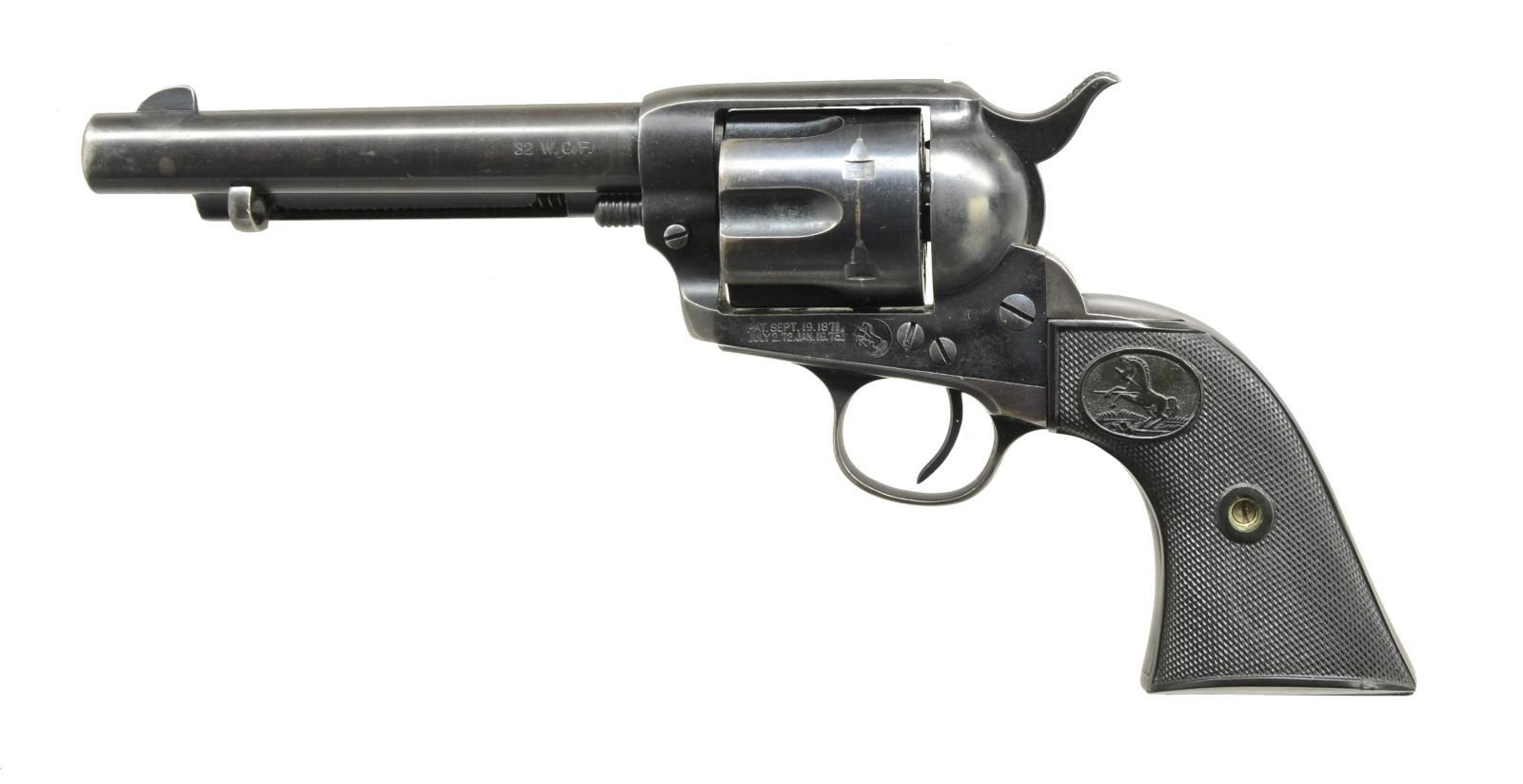 Cal. 32 WCF. S# 221467. Bbl. 5 1/2". 6 Shot fluted cyl. Blue finish. Replacement 2 piece checkered Rampant Colt grips. 1902 Mfg. CONDITION: 70% fading reblued finish showing cyl. drag line & sm. marks. Replacement cyl. pin. Grips show sm. marks. Bore has darkened appearance w/ lightly worn rifling. Action shows hammer & trigger wear. PROVENANCE: Collection of Alan Bradley Shepherd. (20-4018/DS). CURIO. $1,200-1,800.