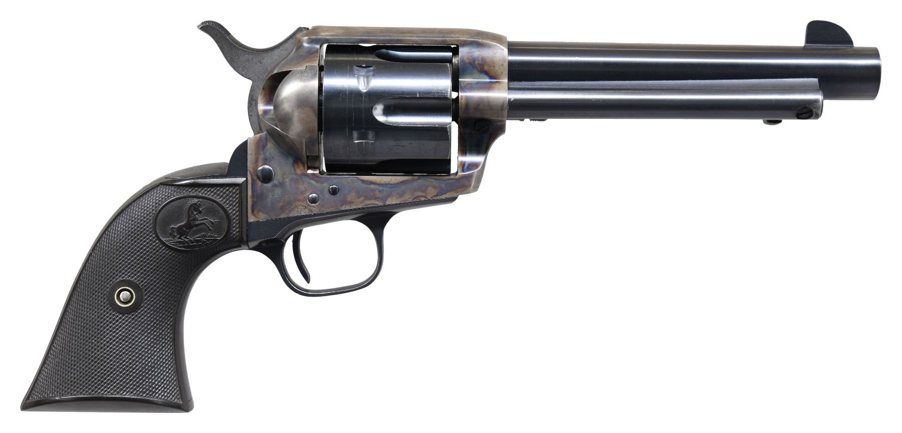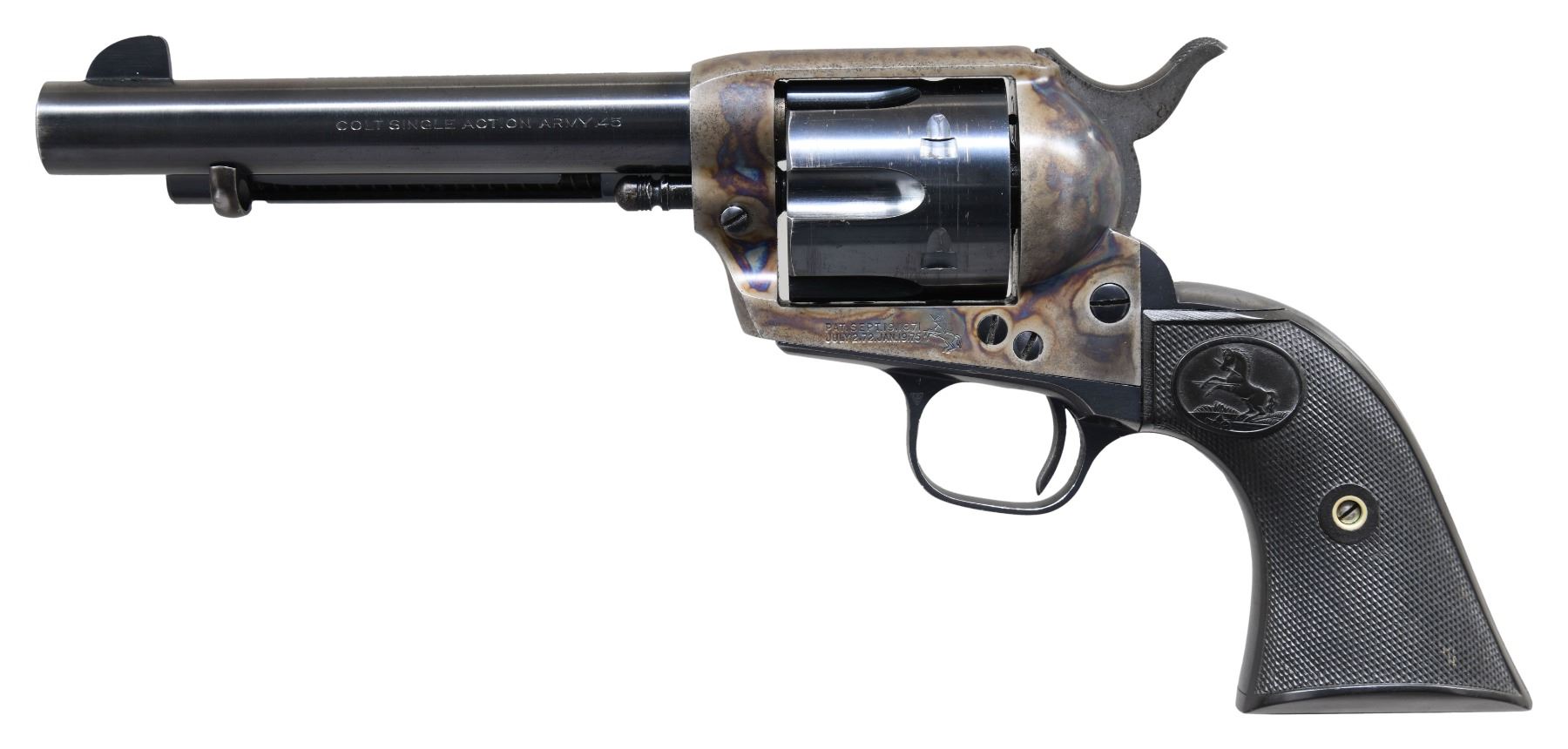 Cal. 45 Colt. S# 357387. Bbl. 5 1/2". Blue & case colored finish. Two piece checkered hard rubber rampant colt grips. Mfg. 1940. CONDITION: 95% original metal finish, showing edge & carry wear w/ a slight cyl. drag line. Cyl. pin shows tool markings. Very good grips. Sound action. Very good bright bore. (25-238/DS). CURIO. $5,500-8,500.