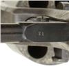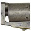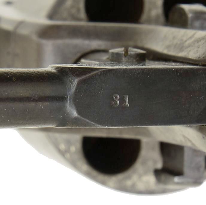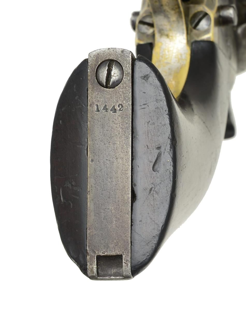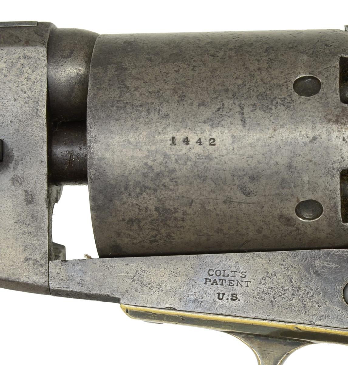 Cal. 44. S# 1442. Bbl. 7 1/2". This is an unusual configuration, which is possibly correct. 1st Models were not made to attach to shoulder stocks & they did not have rnd. trigger bows, but square back. This example has rnd., trigger bow, backstrap is cut for shoulder stock & there are additional 4 screws added to frame. S#s match throughout this gun. Fonts on bbl., frame, cyl., arbor, all appear to have correct early sm. en font. S#s on backstrap & trigger guard are larger but appear consistent w/ later production Colt. Bbl. S# stamped over tiny Colt number 2517. There is a sm. “70” stamped on bottom of bbl. at well & “31” stamped on loading arm. S# on cyl. is also stamped over 2517. The grips have penciled “1442” in channel & appear to retain traces of original Colt varnish. Wedge is numbered “971”. This is an unusual configuration, but most parts appear to be original Colt. CONDITION: good to very good overall. Markings all discernable as described, there is a dovetailed plug on bbl. lug through portion of address. Iron is a mottled gray overall w/ pitting, markings all discernable. Tiny traces of cyl. scene visible, 4 usable safety pins. Trigger guard retains about 1/2 of its silver plate. Grips are sound w/ traces of original factory varnish. Mechanics are fine w/ crisp, rifled bore. PROVENANCE: The Estate Collection of Gary Parietti. (01-19035/JS). ANTIQUE. $4,000-5,000.