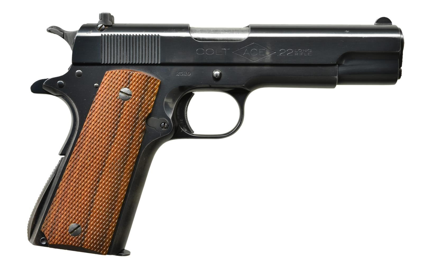Cal. 22 LR. S# 2520. Bbl. 4 3/4" of early design not utilizing floating chamber. Mfg. 1931 (1931-1941 & 1947; approximately 11,000 units). Early features to include stacked fiber washers on spring guide. Properly marked slide w/ half moon front sight and Patridge style adj. rear. Checkered slide stop & thumb safety w/out undercuts. Wide spur hammer w/ borderless checkering. Checkered walnut grips of later production; left plain appearing & right w/ attractive vertical grain. Long tang grip safety, checkered arched mainspring housing & short trigger w/ checkered face. Top of frame by disconnector has provisional "R" mark. Vertical holes for centerfire ejector but w/out horizontal retaining hole. MAGS: very good as professionally refinished, blued 10 rd. w/ formed steel follower & properly marked base. CONDITION: frontstrap has 3 finger aligned areas of thinning finish plus corresponding uniform thinning on safety & housing. Remainder of professional quality refinish is about near excellent w/ hint of occasional high point thinning, light function wear & occasional sm. spot of prior imperfection in finish. Markings very clear w/ very slight thinning visible on the lower portion of the horse plus hint of thinning on right side of slide. Bbl. is blued w/ port area in the white; Muzzle face highly polished blued finish. Extractor slightly proud of slide at rear. Left grip has darkened stain near bottom screw but both in near excellent condition having attachment screws w/ minimal finish. Near excellent bore. (22-4284/NW). CURIO. $2,000-3,000.