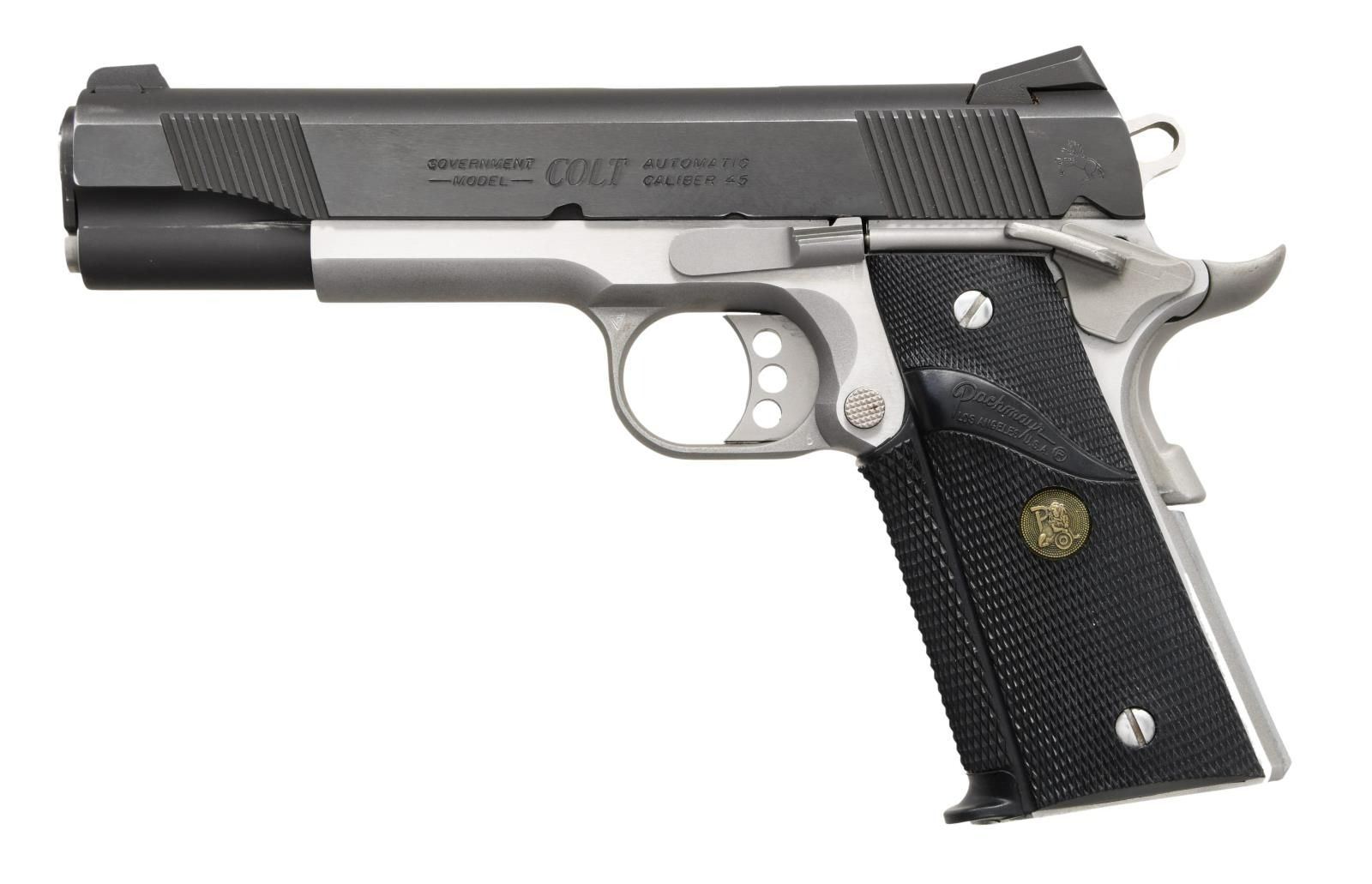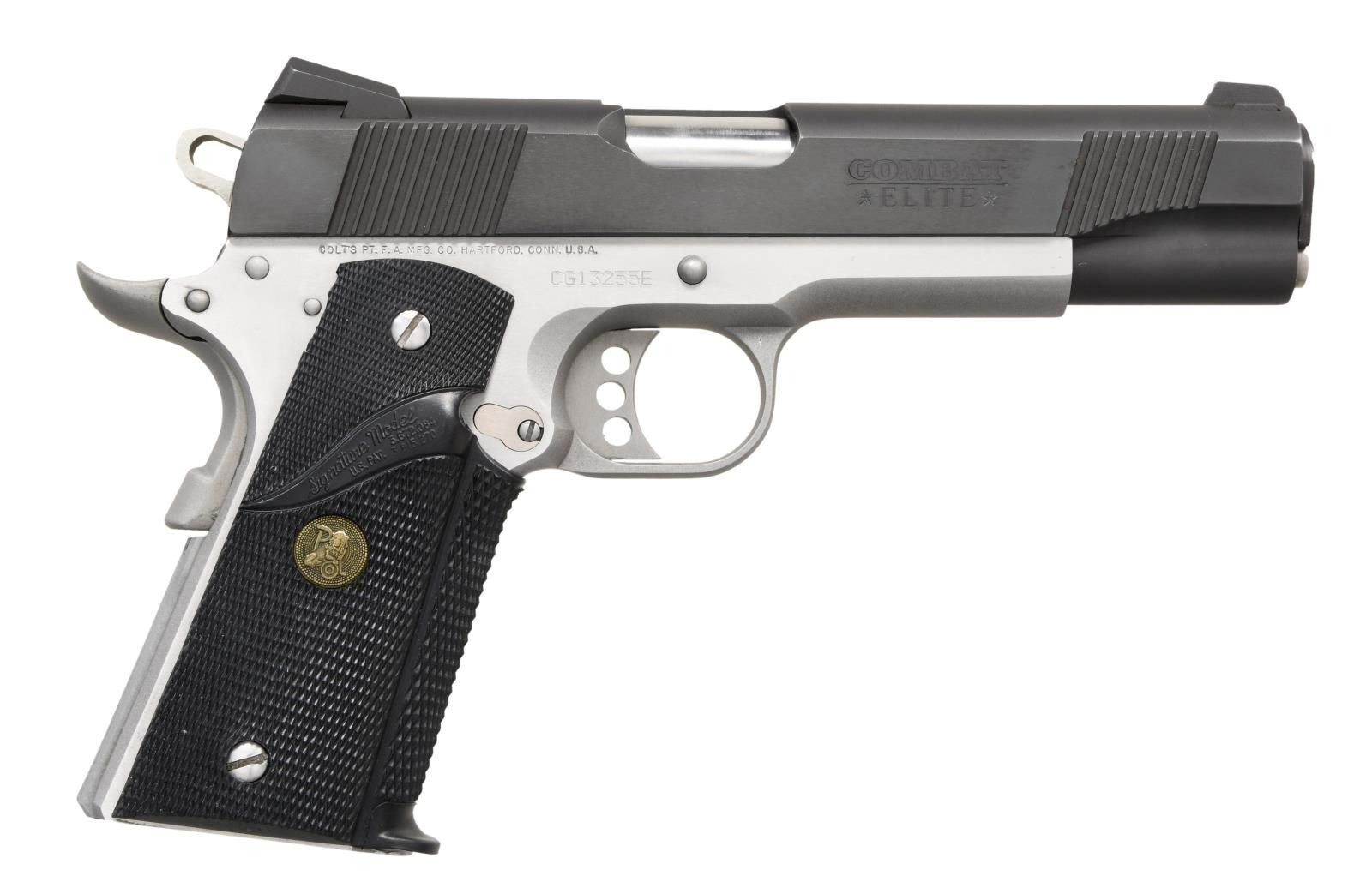 Cal. 45 ACP. S# CG13255E. Bbl. 5" stainless with polished throating plus polished feed ramp. Mfg. 2010 with stainless lower and blued slide having polished sides plus matte edges. Front and rear square cut slanted cocking grooves, lowered and flared ejection port, dovetailed 3 dot sight set (Novak style windage adjustable rear) plus full length guide rod. Skeletonized hammer and aluminum trigger also having over travel adjustment. Beavertailed grip safety with pad, grooved flat mainspring housing, extended thumb safety, high cut front strap and Pachmayr Signature wrap around rubber grips with polished stainless screws. MAGS: 1 factory 8 rd. stainless. UNATTACHED ACCESSORIES: w/box. CONDITION: very good to near excellent overall appearance with hint of high edge wear on slide along with slight function wear. Stainless parts closer to near excellent with near excellent bore and grips. PROVENANCE: The Collection of Gun Sport Ltd owned by Jon R. Thomas. (23-3988/NW). MODERN. $750-1,000.