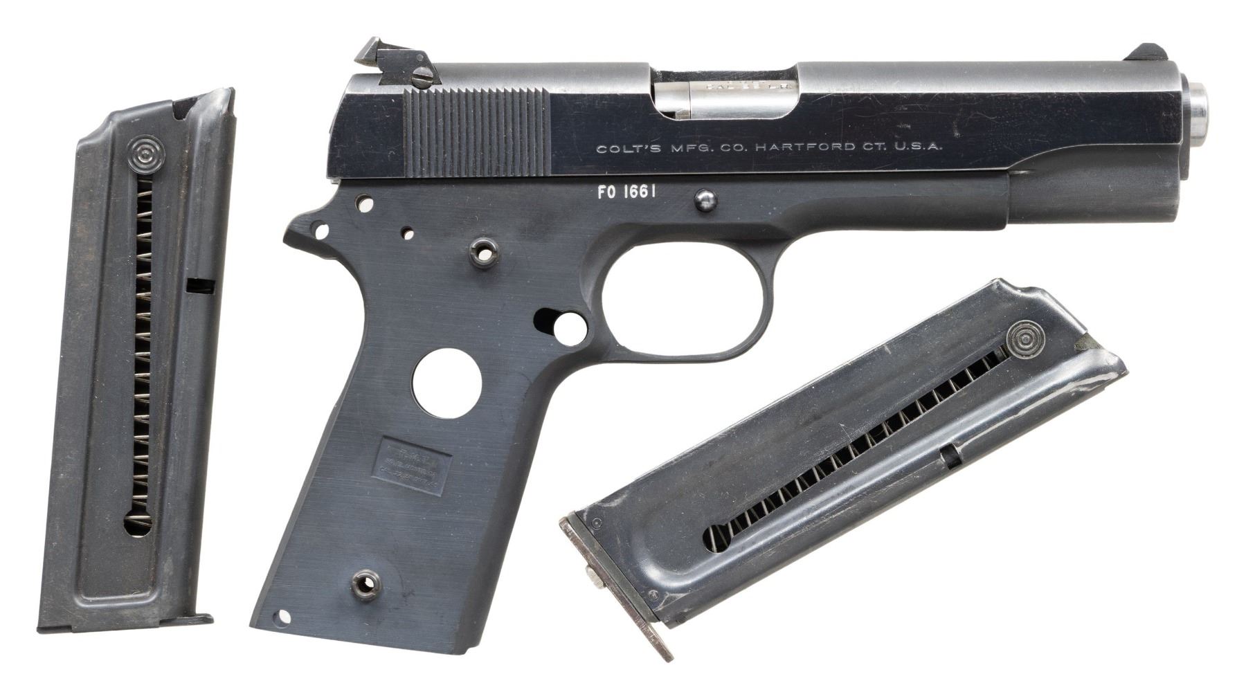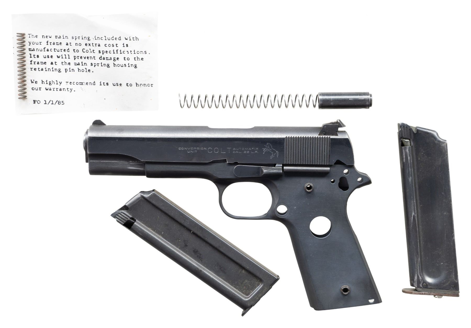 Cal. 22 LR. S# F016610. Partial Colt 22 LR Conversion Unit for 1911 having 5" bbl. with floating chamber, extractor, recoil spring, recoil spring plug, slide lock & mags. Stripped Ranger Machine & Tool 1911A1 frame missing small parts. MAGS: 2 - 10 rd. UNATTACHED ACCESSORIES: extra spring. CONDITION: frame has very good overall appearance. Conversion unit has good blue finish showing scratches & marks. Very good bore. (25-4382/MD). MODERN. $150-250.