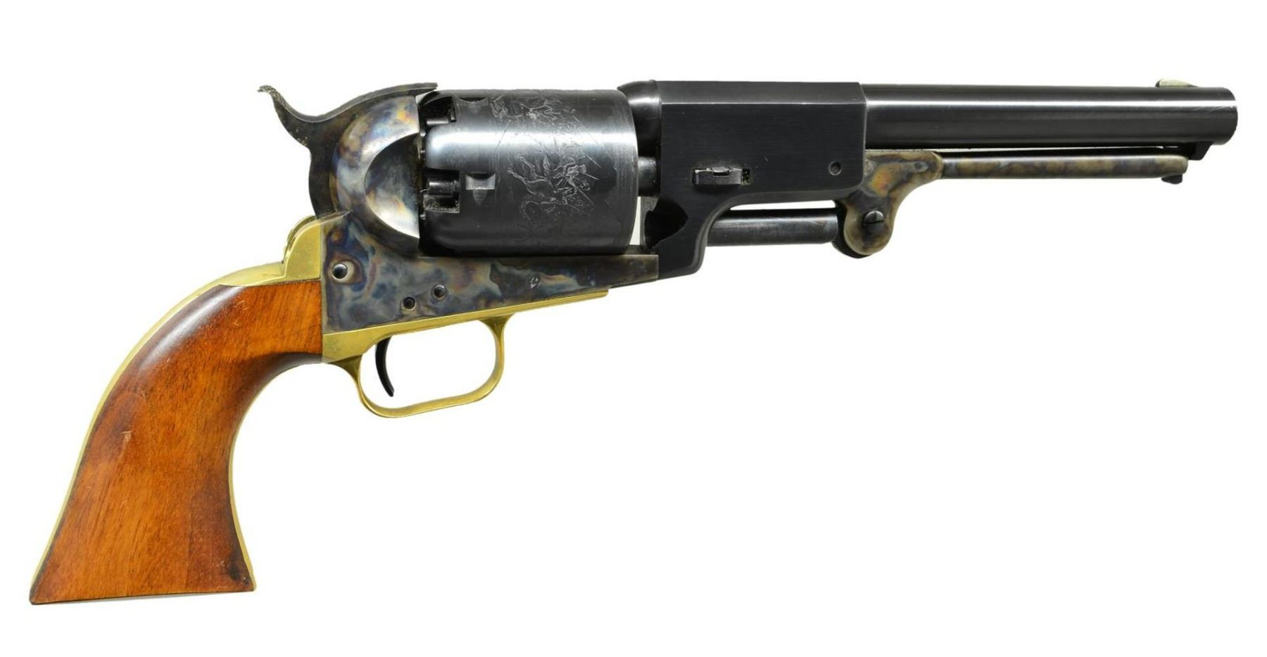 Cal. 44. S# 30961. Bbl. 7 1/2" rnd. with silver blade sight. Mfg. 1980–1982, 2900 units numbered 25100–34500. Brass backstrap and rounded trigger guard with a 1-piece European walnut grip. Case-colored hammer, frame, loading lever, and plunger. 6 rd. unfluted cyl. having Texas Ranger and Indian scene plus rectangular cyl. notches. CONDITION: tarnished brass, very faint occasional grip marks, and a small, bright spot on the cylinder scene; all other aspects are near excellent, appearing unfired. (01-21019/NW). ANTIQUE. $400-600.