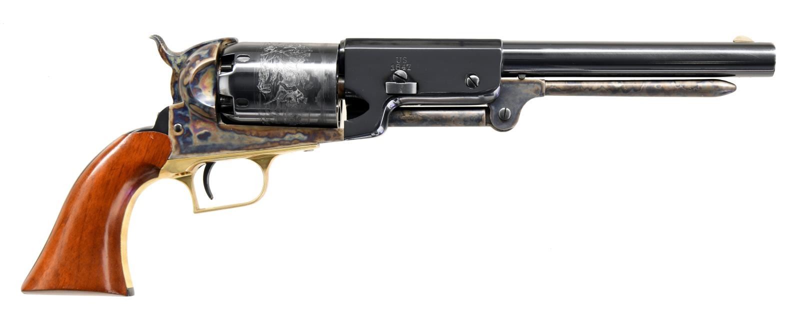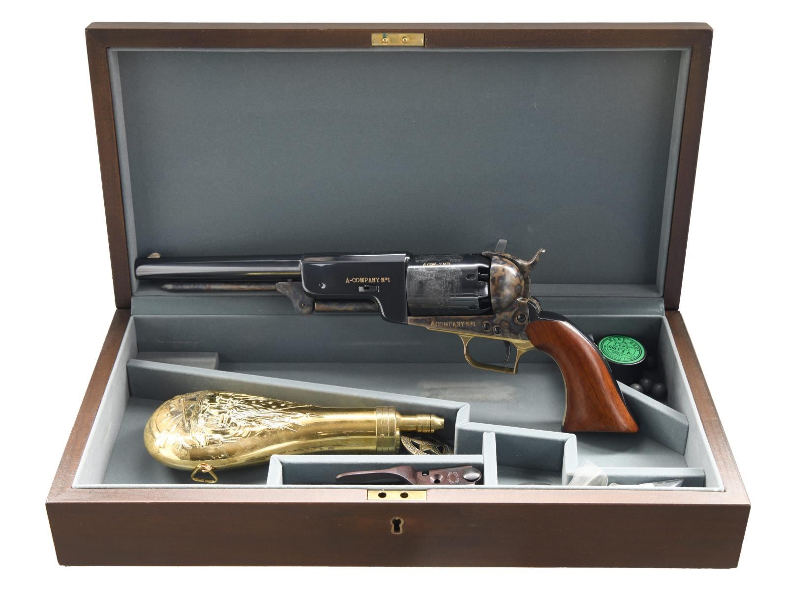 Cal. 44. S# 841. Bbl. 9". Case colored loading lever, frame, hammer & trigger. Brass trigger guard & front strap. Blued cyl. bbl. & back strap. Right side of frame, cyl. & bbl. all marked "A-COMPANY No1" in gold. Cyl. has battle scene engraving. Top of bbl. has NYC Sam Colt address. Back strap has gold Sam Colt signature. Right side of bbl. marked "US/1847". Hammer not turning cyl. & may require attention. Hardwood grips. UNATTACHED ACCESSORIES: factory display case, gold powder flask, bullet mold, nipple tool, percussion cap tin, a few lead balls & key. CONDITION: all aspects rate very good plus or better. PROVENANCE: From the personal collection of Brad Shepherd (01-23781/MJC). ANTIQUE. $600-900.
