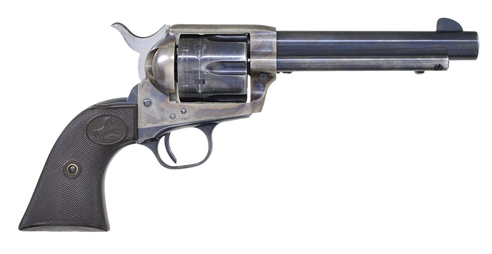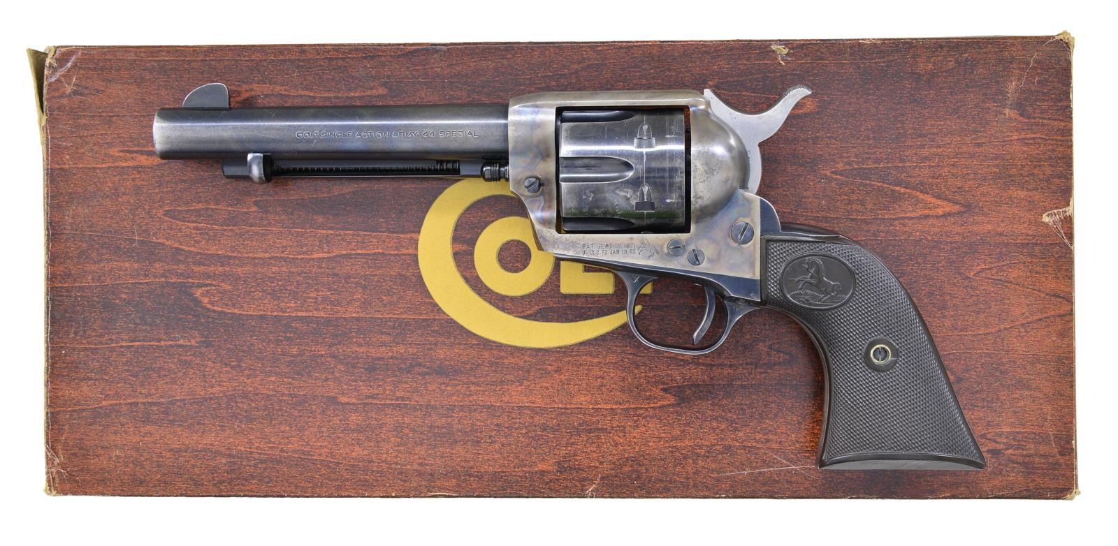 Cal. 44 Spl. / 44-40. S# 24015SA. Bbl. 5 1/2" w/ blade sight plus notched frame at rear. Mfg. 1959 as 44 Spl. having case colored frame w/ balance blued. Black Colt logo checkered hard rubber grips scratch numbered to match frame S#. UNATTACHED ACCESSORIES: Extra properly fitted 44-40 Colt marked cyl. w/ out S#; near excellent appearing seldom used in revolver. Very good wood grained box w/ styrofoam inserts; white label w/ blank info boxes. CONDITION: Very good overall appearance. Spotty finish loss on installed 44 Spl. cyl. along w/ light scratches parallel to cyl. turn line. Holster like thinning at muzzle, on ejector head & on ejector housing; thinning in grip area. Very nice case colors w/ minimal fading. Near excellent bore & grips. (22-3528/NW). CURIO. $1,000-1,500.