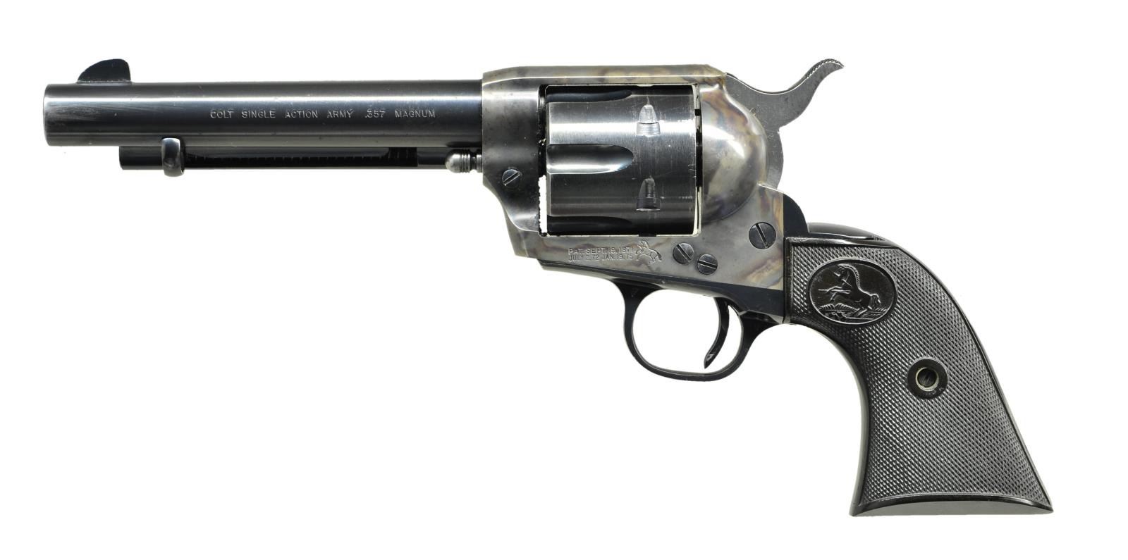 Cal. 357 Mag. S# 46700SA.. Bbl. 5 1/2" w blade sight plus fame notched rear. Mfg. 1968 w/ Colt checkered hard rubber grips having horse logos. Colt patent dates on case colored frame; balance blued. Matching numbered trigger guard, backstrap, grips & cyl. CONDITION: very good overall w/ slight thinning near muzzle & at some high points. Light scratch on bottom of bbl., cyl. turn line, thinning on high points of cyl. along w/ scratch from each cyl. stop notch to rear of cyl. Grips appear near excellent but back of right has epoxy repair to retain its eschuteon. Hammer spring has been noticeably lightened by thinning. Near excellent bore. (22-3529/NW). CURIO. $800-1,200.