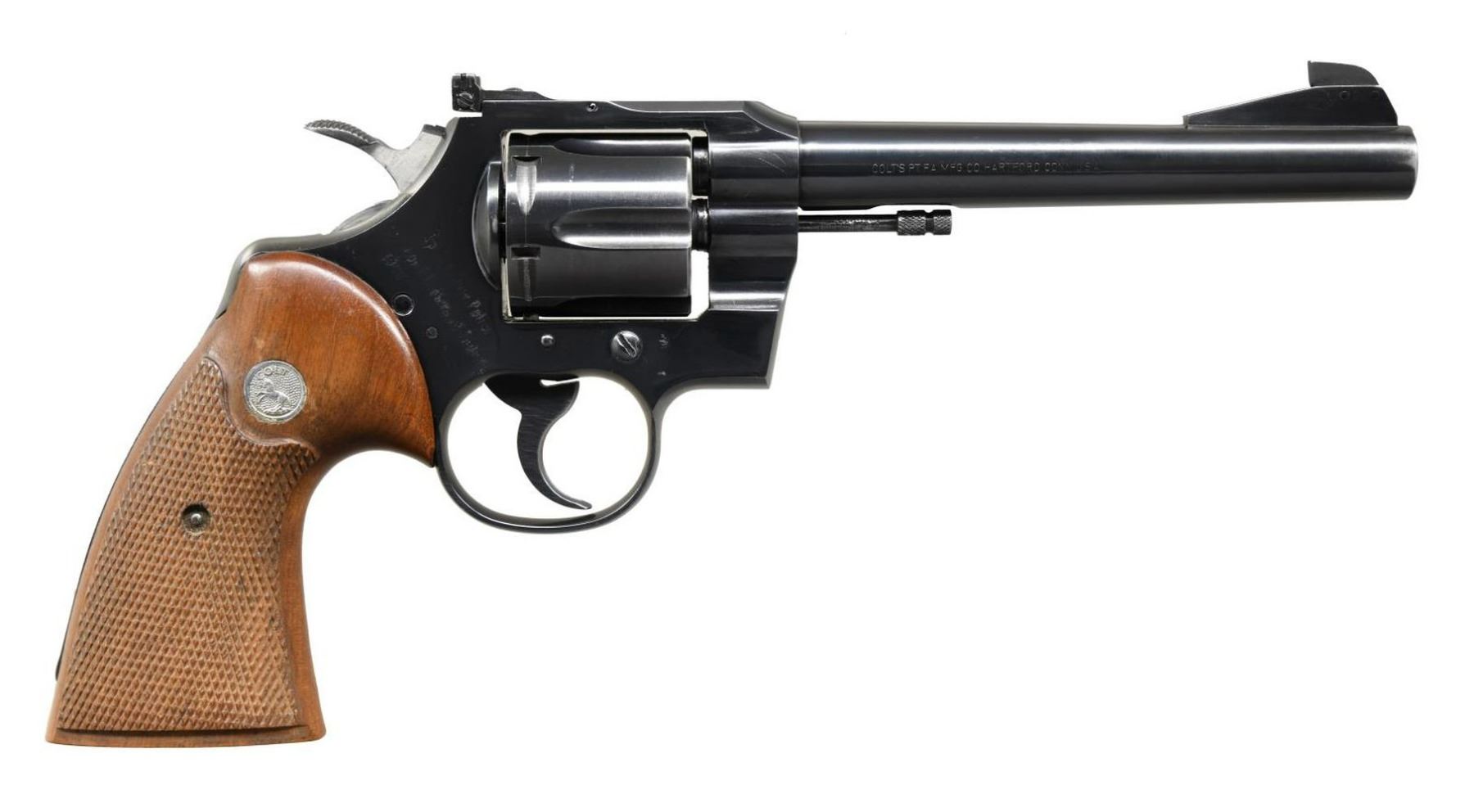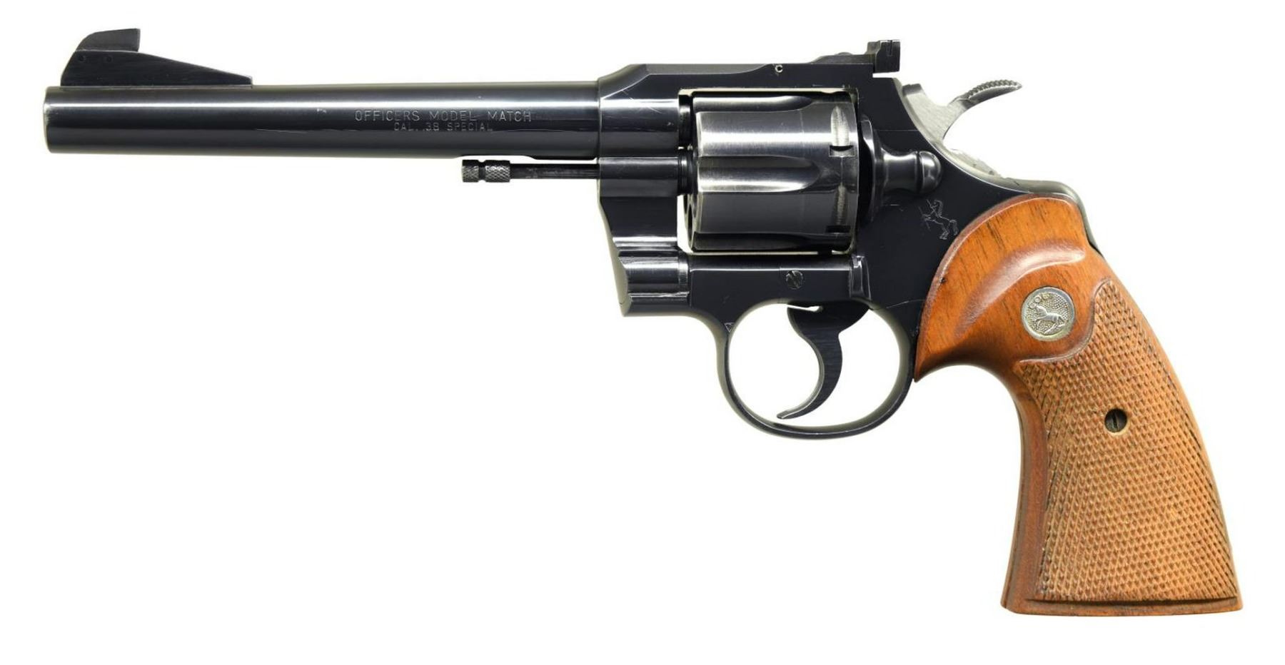 REVOLVER. Cal. 38 Spl. S# 925928. Bbl. 6" tapered heavy with serrated ramped Patridge blade front sight and frame mounted Accro rear. Mfg. 1968 (1953-1969 as 5th issue) with wide spur Python style hammer and satin finished checkered walnut target grips having silver medallions. Right rear of frame engraved "to Ind. State Police / from Ford Dealers of Indiana / 1960". CONDITION: very good to near excellent as refinished having light marks, faint thinning with turn line on cylinder appearing original finish, light marks on ejector rod assembly plus light prior pitting by engraving. Near excellent bore and very good grips having slight separation on front strap at top and bottom. PROVENANCE: The Collection of Gun Sport Ltd owned by Jon R. Thomas. (23-3938/NW). CURIO. $450-600.