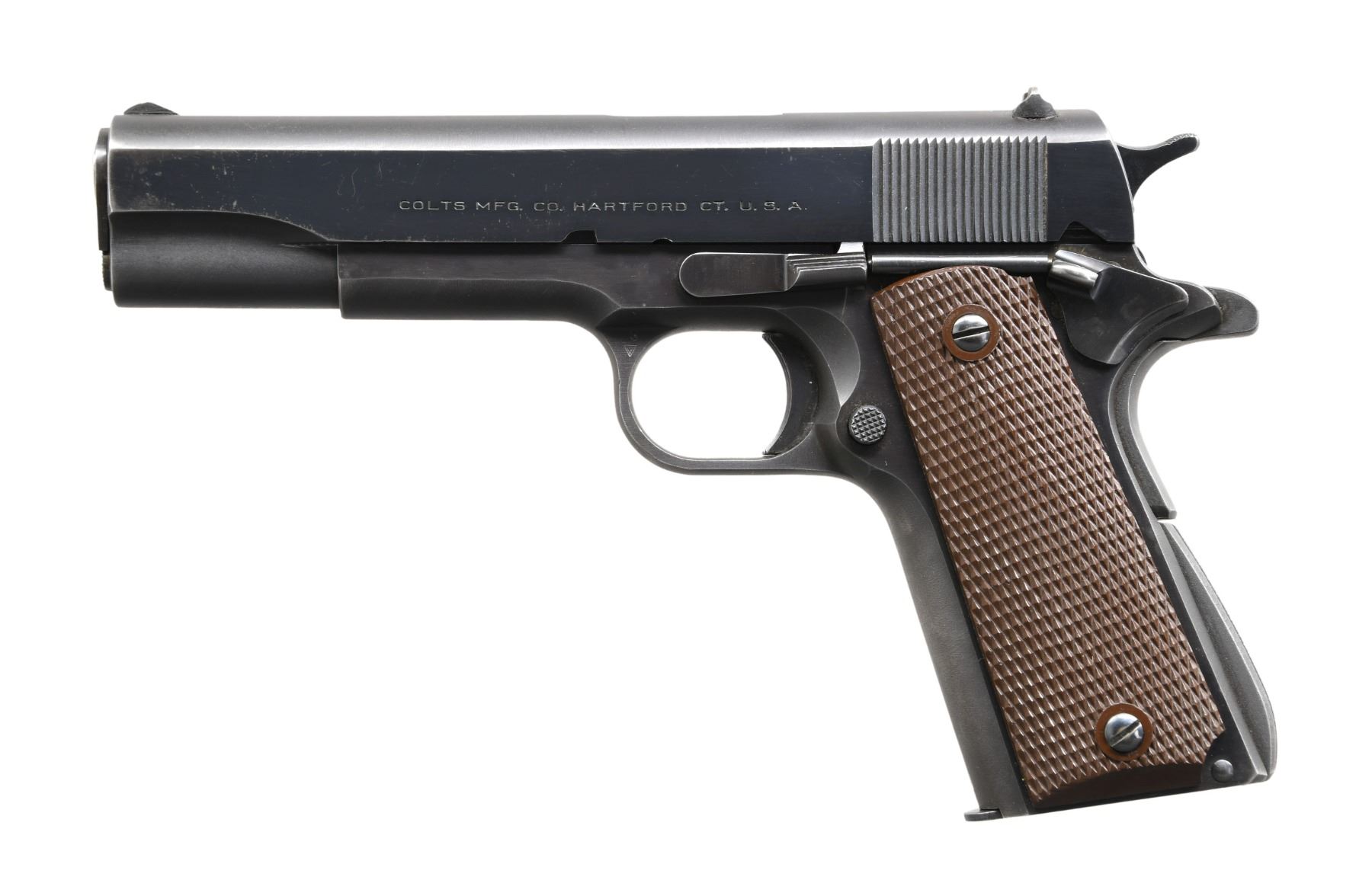 Cal. 38 Super. S# 63368 (1948). Polished blue finish with 5" barrel. 1911A1 profile with fixed sights. Two piece Coltwood style grips. MAGS: 1 - 9 rd. showing wear & cleaning of finish & pitting. CONDITION: pistol has very good original finish showing light handling marks & finish loss on edges. Near excellent grips. Bright bore with strong rifling. (24-5667/MD). CURIO. $1,500-2,000.