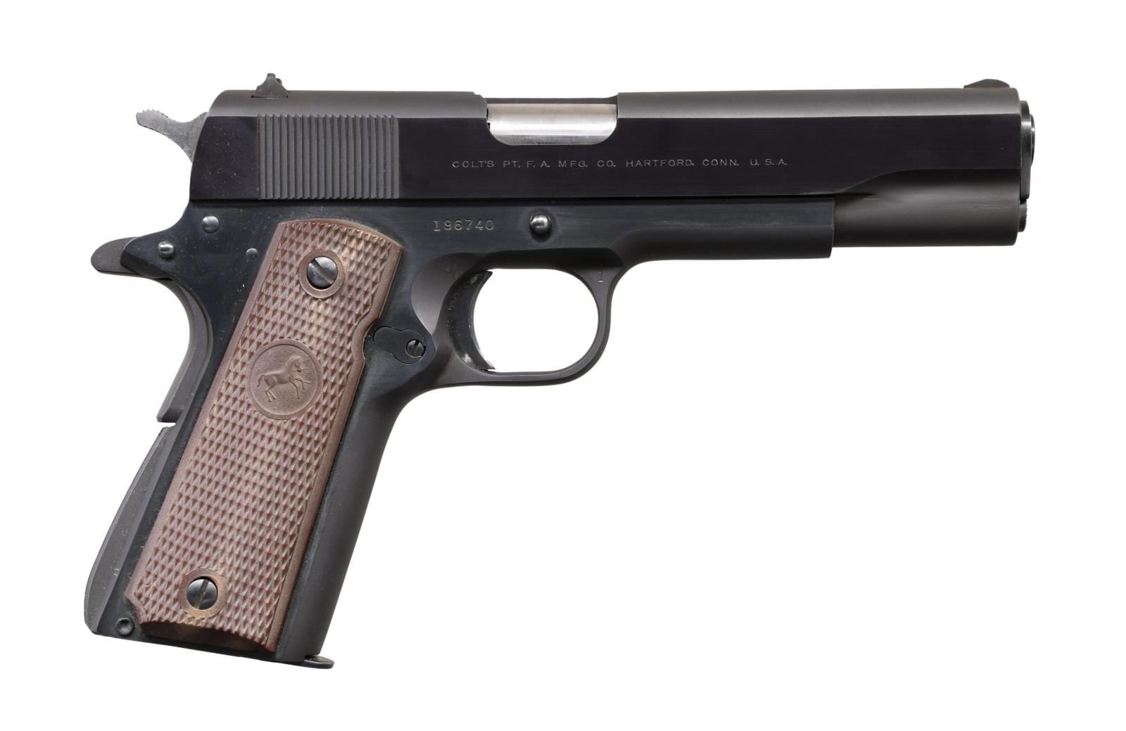 Cal. 38 Super. S# 196740. Bbl. 5". Fixed sights. Blue finish. Two-piece checkered rampant Colt synthetic grips. Mfg. 1968. MAGS: 2 detachable 8 rd. CONDITION: near excellent, retaining over 98% blue. Bright, near-excellent bore. (23-5550/DS). CURIO. $1,200-1,800.