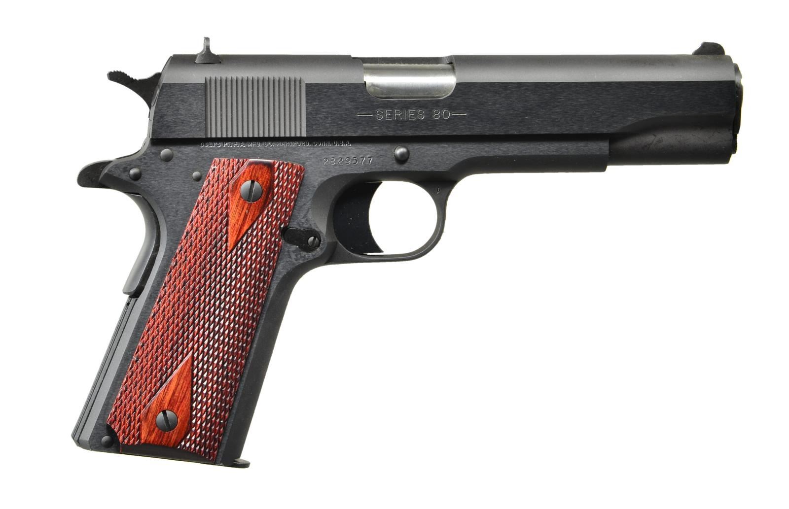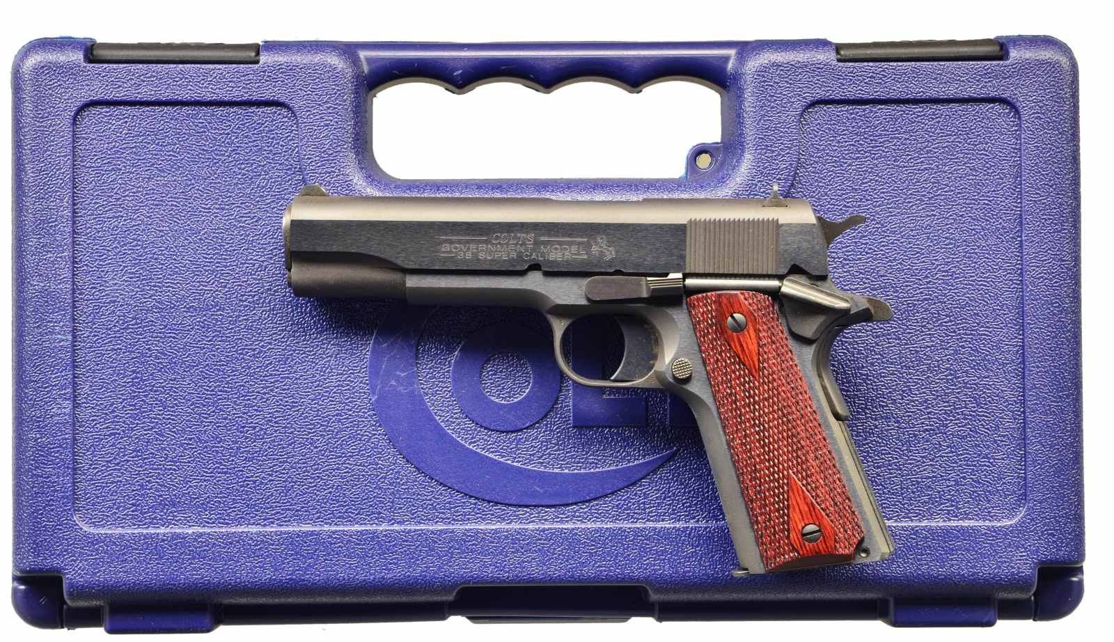 Cal. 38 Super. S# 2829577. Bbl. 5". Mfg. 2010 w/ blued finish & double diamond checkered rosewood grips. High profile 3 dot sights. Flat grooved mainspring housing. MAGS: 3 factory 9 rd. UNATTACHED ACCESSORIES: matching labeled factory blue plastic case & packaging. CONDITION: all aspects near excellent; appears new & unfired. (22-3547/NW). MODERN. $800-1,200.
