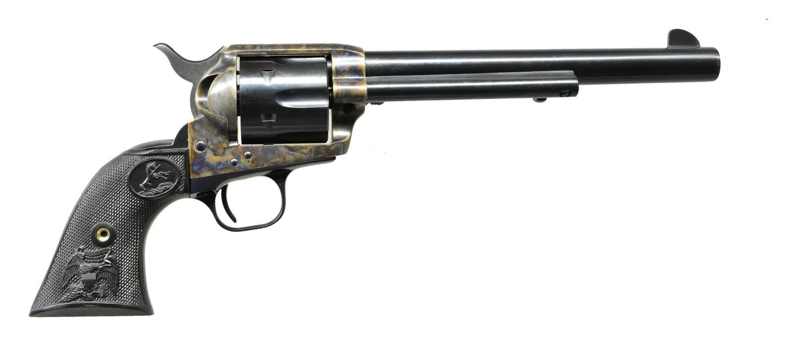 Cal. 44 Spl. S# SA62644. Bbl. 7 1/2" with blade sight. 6 Shot fluted cylinder. Blue and case colored finish with polished hammer sides. 2 Piece black checkered eagle grips. UNATTACHED ACCESSORIES: foam lined wood grain box with hand written matching label. Box contains instruction manual, service station list and congratulations letter. CONDITION: near new. (22-4384/DS). MODERN. $1,750-2,500.