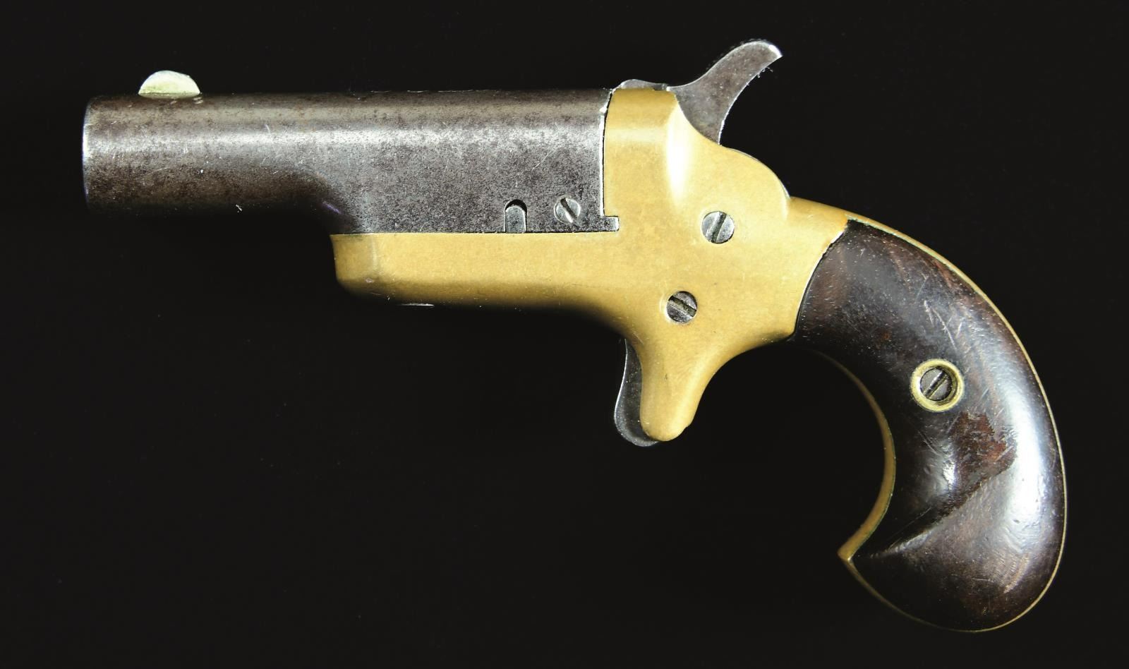 Cal. 41 RF. S# 18093 (located under left grip). Bbl. 2 1/2" w/ semi-circular German silver front sight. Brass action has spur trigger & standard model sloping hammer. 2 piece bird's head walnut grips. CONDITION: bbl. finish has faded to gray w/ scattered pitting. Brass action shows a mild mustard patina. Grips have age darkened worn appearance w/ scratches & marks. Pitted bore retains largely intact rifling. (24-851/DS). CURIO. $400-600.