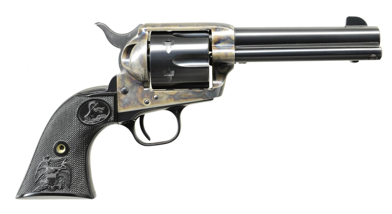 Cal. 44 Spl. / 44-40. S# SA22206. Bbl. 4 3/4" w/ blade sight plus notched frame at rear. Mfg. 1979 as 44 Spl. having case colored frame w/ balance blued. Replacement Colt style grips scratch numbered to match frame S#; checkered black plastic w/ Colt & eagle logos. UNATTACHED ACCESSORIES: Very good original smooth wood grips w/ gold Colt medallions. Extra properly fitted 44-40 marked Colt cyl. w/ S# 4321 plus 36 & 4R; very good w/ turn line & obviously used most often in revolver. Fair original box w/ styrofoam inserts; scuffs, edge wear plus 1 end flap tab missing. CONDITION: Near excellent overall appearance. Hammer sides have been polished. Hammer spring has been shimmed & thinned for lighter action function. Ejector housing screw appears dull nickel or blued having minimal finish. Recoil shield has been filed for smoother operation. Installed 44 Spl. cyl. appears near excellent as do bore & grips. (22-3525/NW). MODERN. $900-1,400.