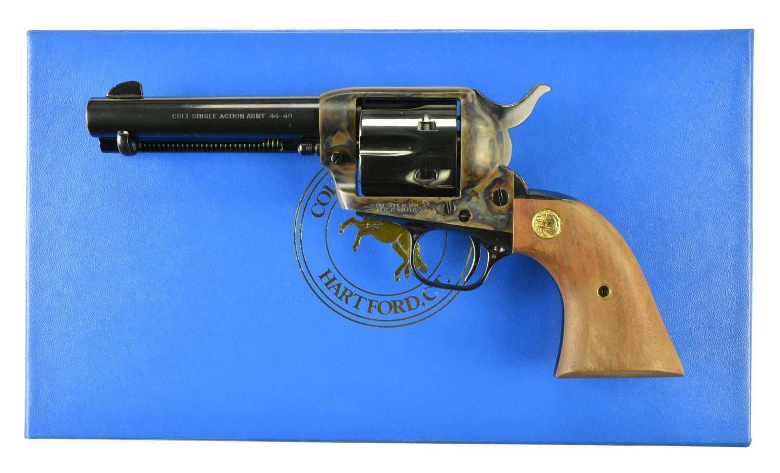 Cal. 44-40. S# S02353A. Bbl. 4 3/4" w/ blade front sight & frame notched rear. Mfg. 1993 w/ case colored frame plus balance blued. Smooth walnut grips w gold Colt medallions. Very desirable Colt for Cowboy Action shooting or collecting. UNATTACHED ACCESSORIES: blue 2 piece box w/ packaging plus outer sleeve. CONDITION: all aspects near excellent appearing new & unfired. (22-3526/NW). MODERN. $1,000-1,500.