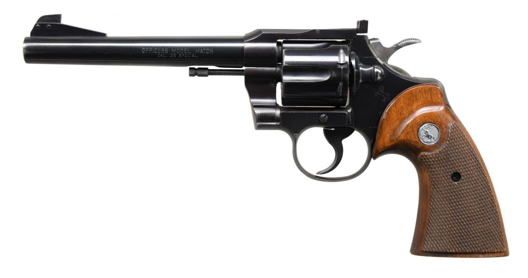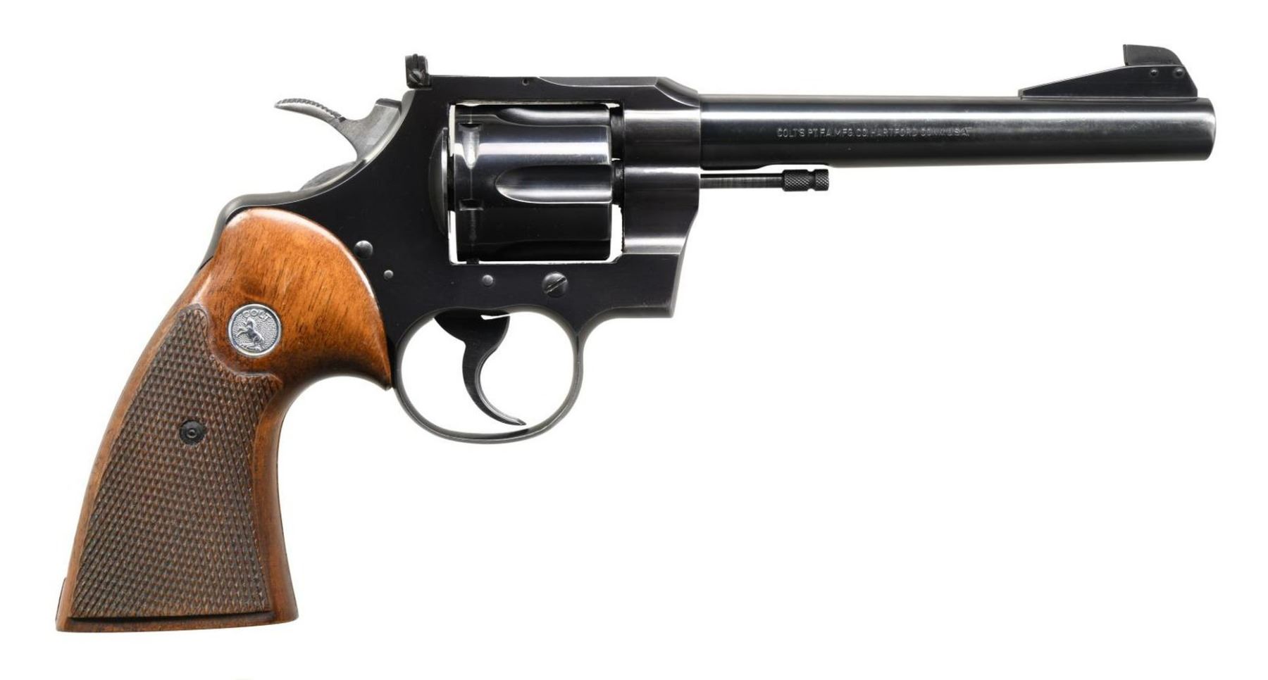 Cal. 38 Spl. S# 916871. Bbl. 6" Patridge pinned onto its serrated ramped base; frame mounted Accro adjustable rear. Mfg. 1967 (1953-1969) with heavy tapered target barrel, rounded cylinder latch, serrated faced trigger plus Python style wide spur hammer and checkered target grips having silver Colt medallions. CONDITION: very good overall appearance with cylinder turn line and high point finish loss. Light function wear plus some faint firing residue. Very good grips with minor marks. Near excellent bore. Timing slightly off but times properly with full trigger pull. (23-5688/NW). CURIO. $450-600.