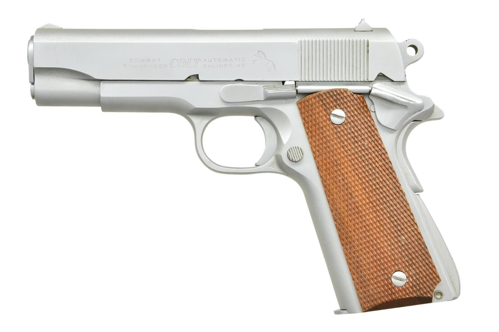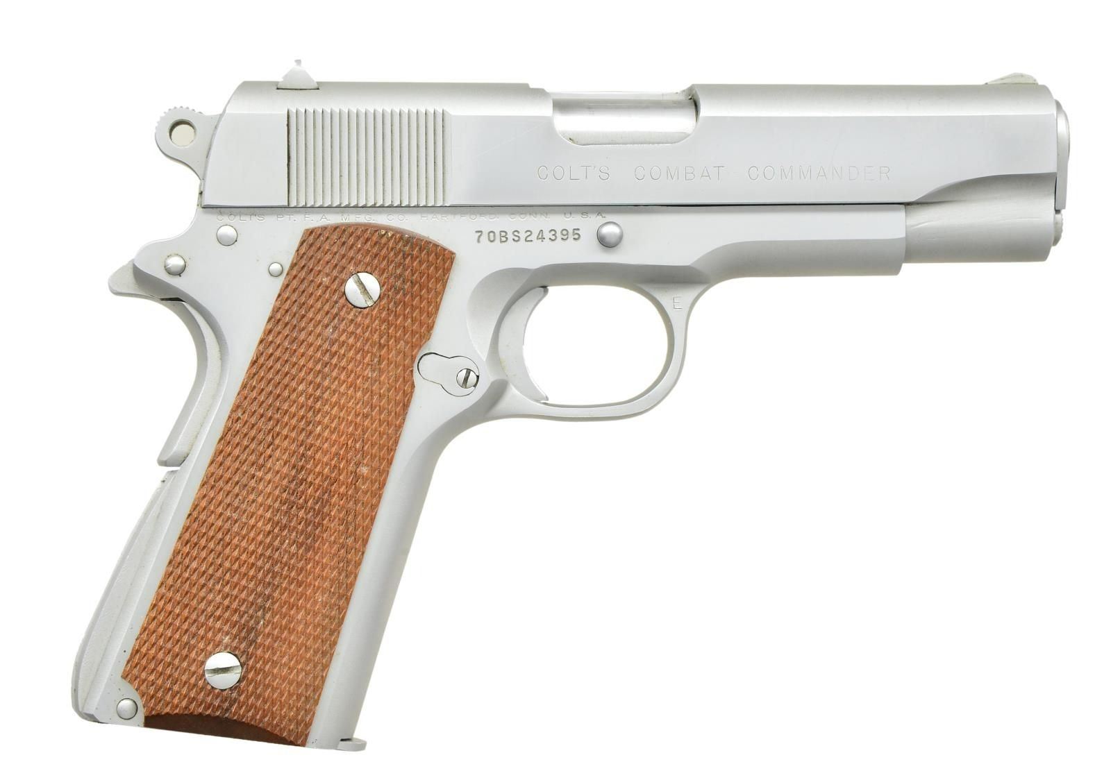 Cal. 45 ACP. S# 70BS24395. Bbl. 4 1/4". Mfg. 1974 (1971-1980) w/ blued finish having period features of: grooved arched mainspring housing, rnd. Commander hammer, fixed sights, serrated controls & fully checkered walnut grips. Refinished w/ satin hard chrome finish that appears to be Armoloy; all parts finished including recoil spring. Armoloy adds about .0002" inch to surfaces plus dramatically increases Rockwell hardness (surpasses a file) giving superior wear resistance along w/ enhanced lubricity. Tests have shown Armoloy's plating to be more resistant to salt spray than stainless. Spring guide has rounded nose similar to that of Gold Cups. Most Armoloyed guns also had bores plated that made for notably easier cleaning; unable to ascertain this one. MAGS: 1 very good factory marked 7 rd. w/ matching plating to include spring & follower. UNATTACHED ACCESSORIES: fair factory wood grained box w/ very good styrofoam inserts; missing labeled end flap. CONDITION: an occasional faint rub mark but generally near excellent including bore & grips. (22-6372/NW). MODERN. $800-1,200.