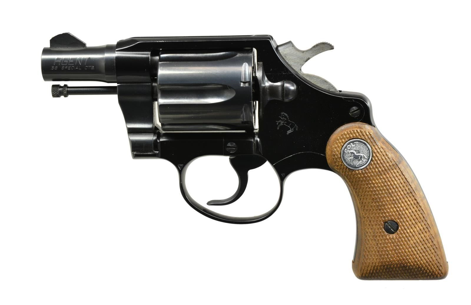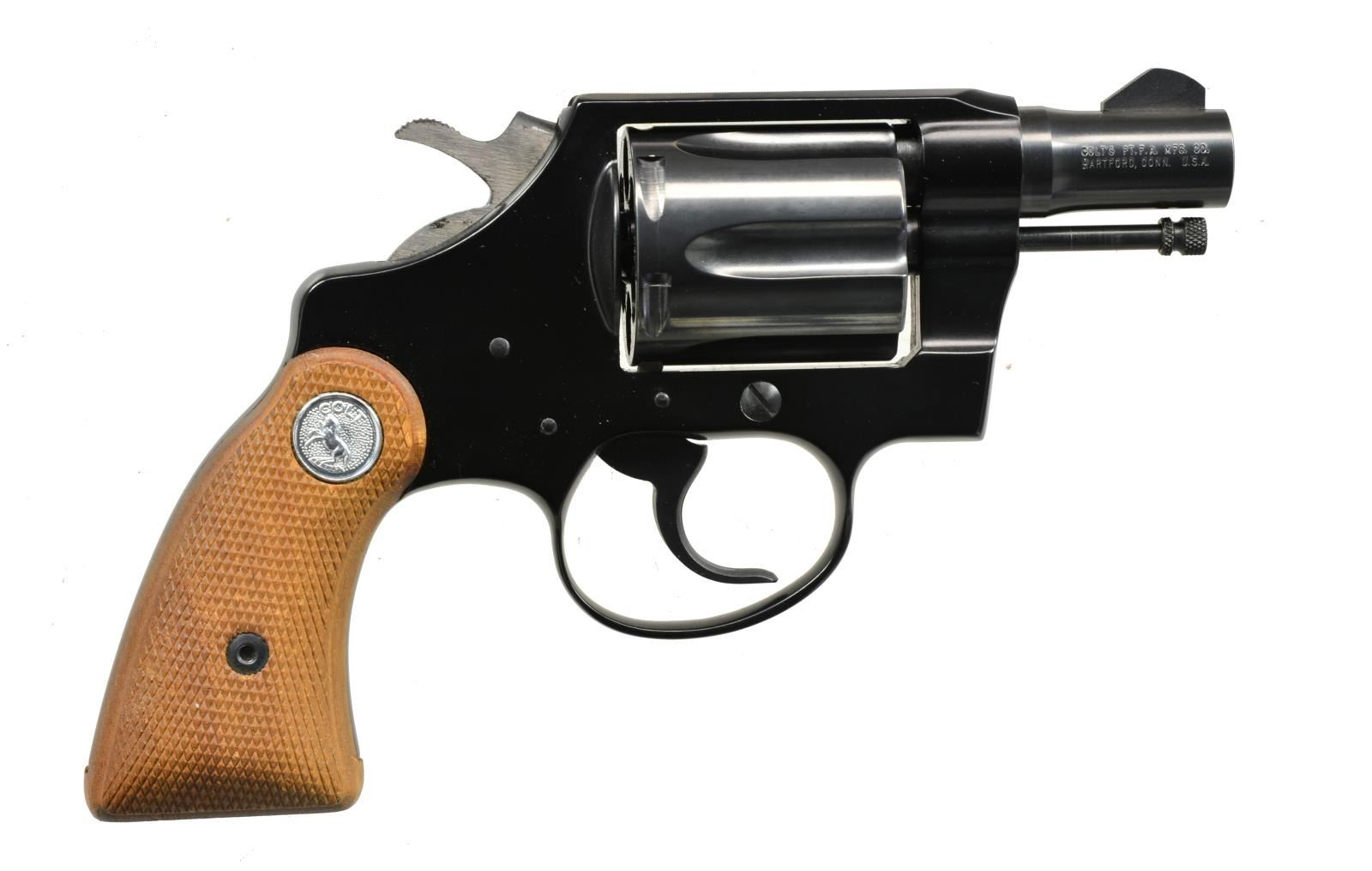 Cal. 38 Spl. S# A60539. Bbl. 2" w/ serrated ramp front sight. 6 Shot fluted cyl. Alloy frame. 2 Piece checkered walnut Rampant Colt grips. 1969 Mfg. CONDITION: near new retaining 99% wood & metal finish. Smooth mechanics. Near excellent bore. PROVENANCE: From the Frederic W. Thrane Collection. (20-2444/DS). CURIO. $500-800.