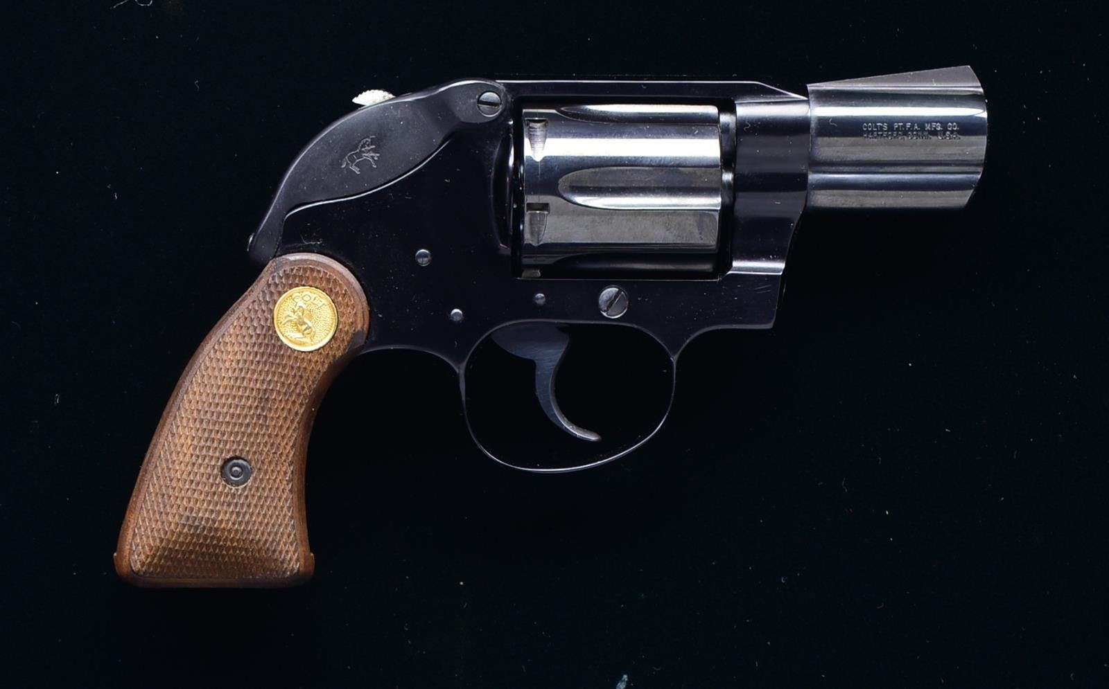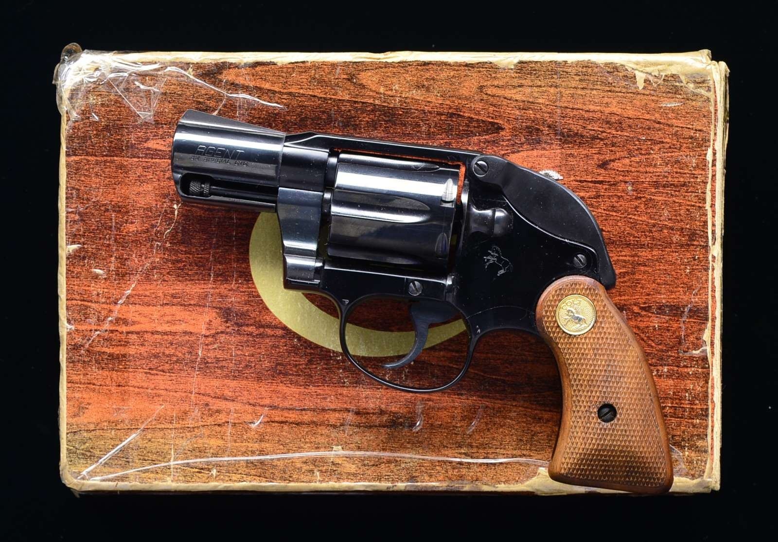 Cal. 38 Spl. S# 69399R. Bbl. 2 1/8" w/ fully shrouded ejector & ramp front sight. 6 Shot fluted steel cyl. Black anodized alloy frame w/ Colt marked shroud around hammer. 2 Piece checkered walnut grips w/ Rampant Colt medallions. 1978 Mfg. UNATTACHED ACCESSORIES: wood grained box w/ foam interior containing hang tag. Box is tattered w/ partially intact properly numbered label. Edges & sides are taped. CONDITION: 99% original finish. Bright near excellent bore. (20-3302/DS). MODERN. $600-800.