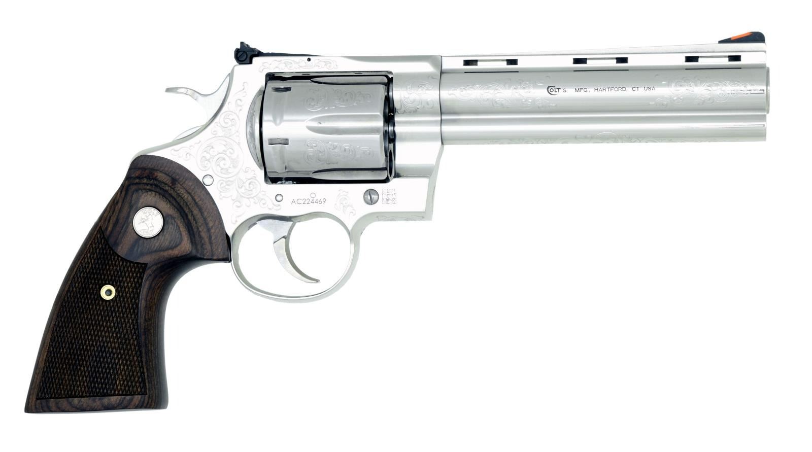 Cal. 44 Magnum. S# AC224469. Bbl. 6" w/ vent rib & full length ejector shroud. Red ramp front sight w/ adj. square notch rear sight. Six shot fluted cyl. Stainless steel construction. Custom shop model MM revolver w/ Armory Style "C" coverage cut engraving. The engraving consists of arabesque scrolls w/ punch dot backgrounds on the frame, bbl. & cyl. Laminated wood checkered grips w/ rampant colt medallions. UNATTACHED ACCESSORIES: blue molded box w/ matching label. Box contains operator's manual, hang-tag, NRA advertisement, Lucas oil advertisement & trigger lock. CONDITION: as new. PROVENANCE: from The Collection of Gun Sport Ltd owned by Jon R. Thomas. (23-4332/DS). MODERN. $2,250-3,000.