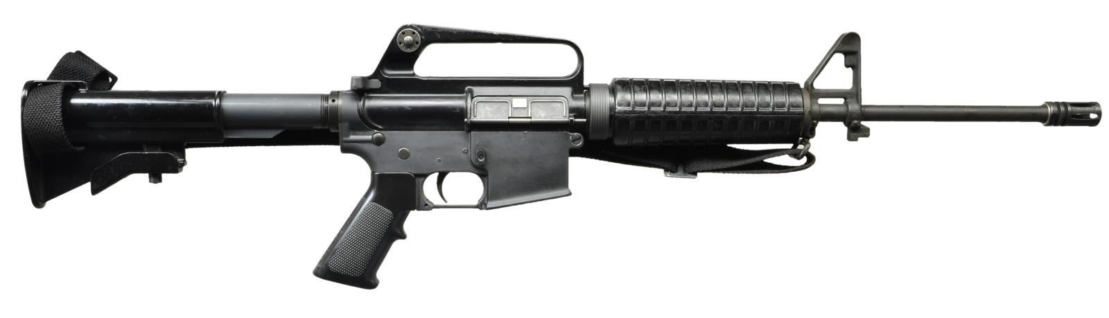 Cal. .223. S# SP210821. Bbl.16" Mfg. 1984-1985. A late model Colt SP1 Carbine w/ aftermarket upper receiver. 16" threaded barrel w/ A1 flash hider. Bayonet lug below protected post front sight. A2 style 6.5" carbine handguards. Strait Delta ring. Carry handle upper w/ E1 protected peep sight. No brass deflector or forward assist. Slab-side lower receiver marked on left side; "COLT AR-15 / CAL. 223 / MODEL SP1 / SER. SP 210821" on mag-well & above trigger; "COLT'S FIREARMS DIVISION / COLT INDUSTRIES / HARTFORD, CONN. / U.S.A." Safety marked "SAFE / FIRE". 2 position collapsible black plastic coated aluminum shoulder stock. Black canvas sling. SP1 style colt bolt carrier. Standard 3.5" carbine buffer. CONDITION: Traditional black finish on lower receiver. Dark black, unmarked upper receiver. Offset front takedown pin. Factory finish on lower receiver complete & consistent w/ little sign of wear. Black upper receiver demonstrates thinning on high spots. Shiny bore w/ strong rifling. Fire control mechanism appears to function correctly when cycled by hand. (22-4114/JZ). MODERN. $1,000-1,500