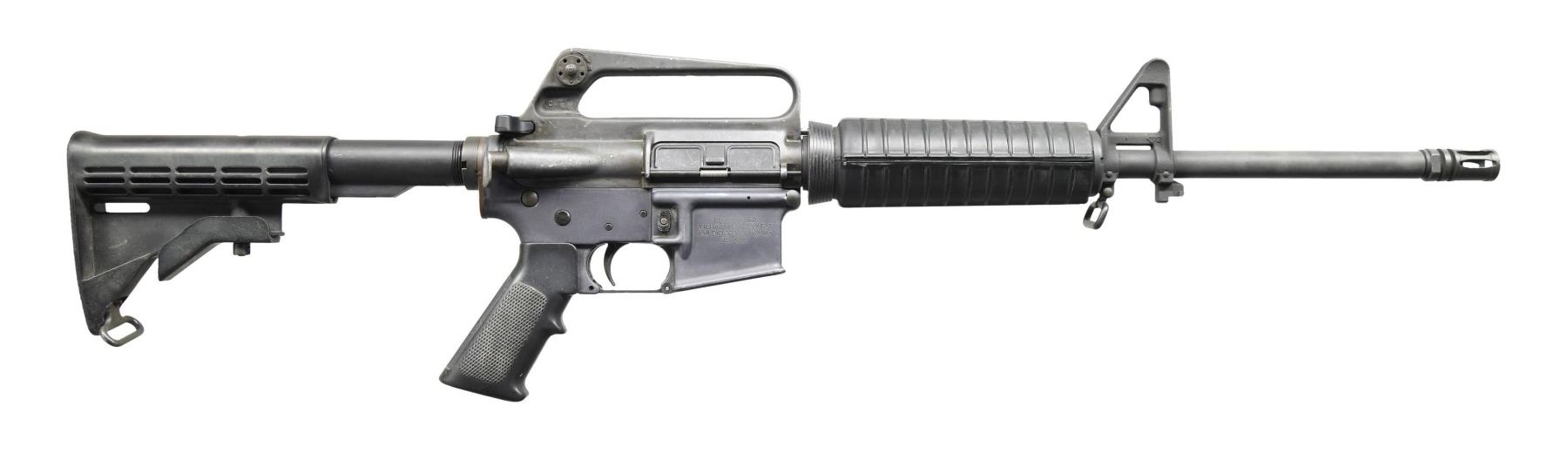 RECEIVER. Cal. 5.56 NATO. S# LBD011495. Bbl. 16". Threaded barrel with A2-style flash hider. Protected post front sight, gas block, and bayonet lug. Round carbine-length handguards retained with tapered delta ring. Colt carry handle upper receiver with teardrop forward assist and no brass deflector. Windage adjustable, dual aperture rear sight. Colt AR-15 A3 lower receiver, marked "TACTICAL / CARBINE / CAL. 223." on left side of mag well and marked "RESTRICTED / MILITARY / GOVERNMENT / LAW ENFORCEMENT / EXPORT / USE ONLY" on right side of mag well. Four-position collapsible shoulder stock. M16 profile bolt carrier. Sling swivels; front and rear. CONDITION: this carbine is a collection of parts from several different eras. Lower receiver retains a dark finish with typical high spot thinning and light scratches. Upper receiver finish is the older gray color with more wear than lower. Finish is thin in places, especially on the right side around forward assist. DPMS barrel retains a dark phosphate finish and retains a bright bore with descent rifling. Fire control mechanism appears to function correctly when cycled by hand. (24-5454/JZ). MODERN. $500-900.
