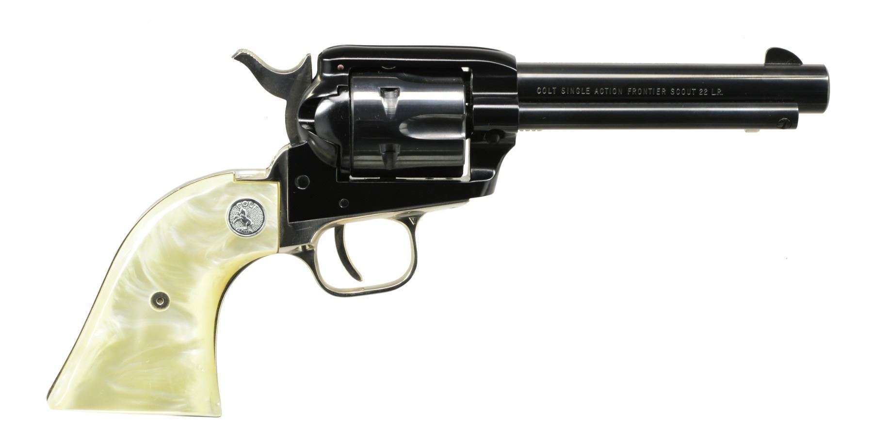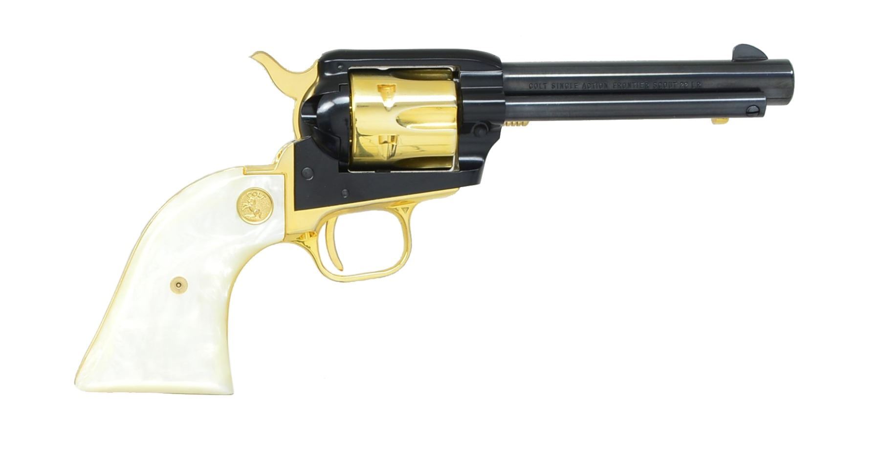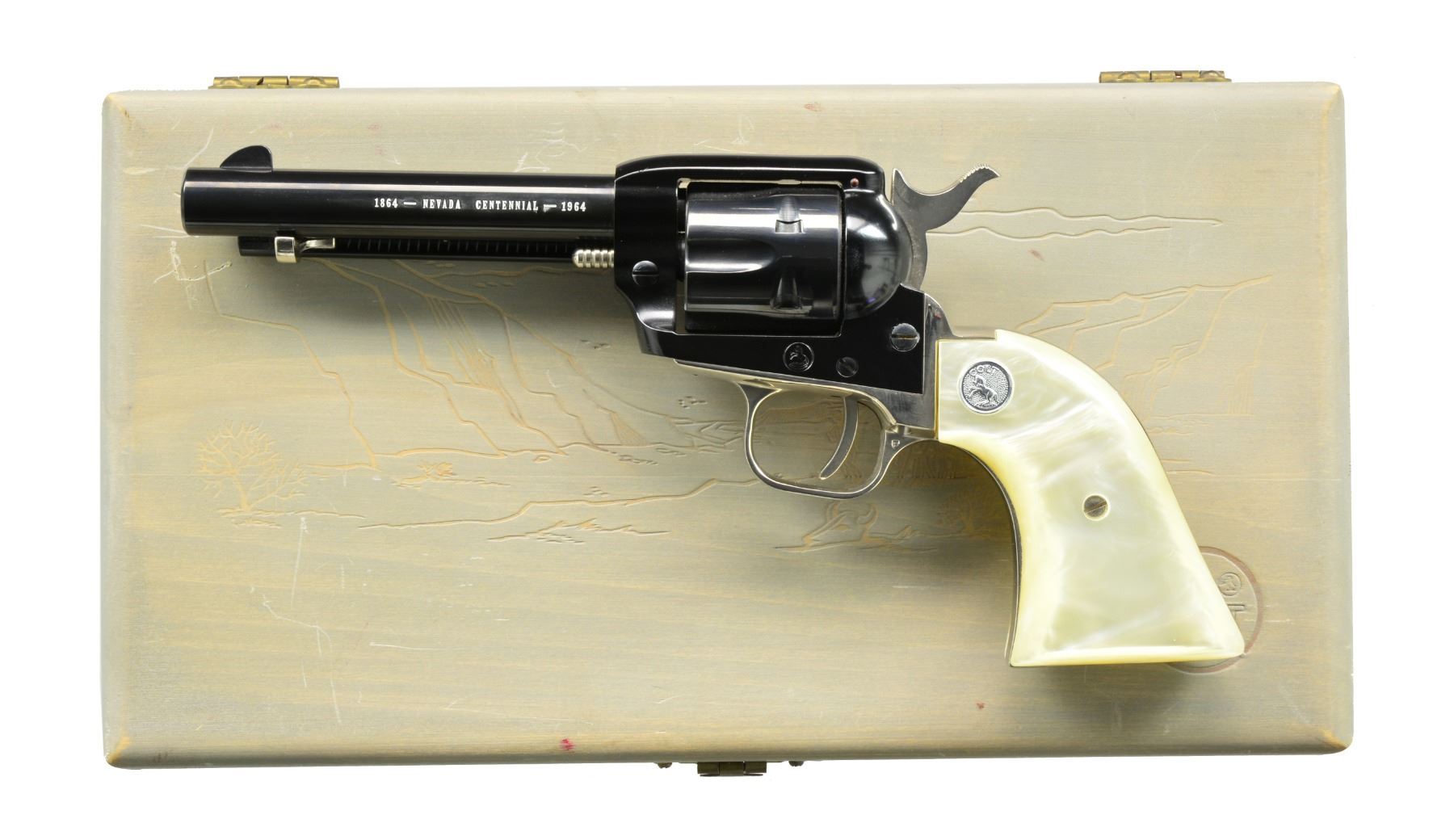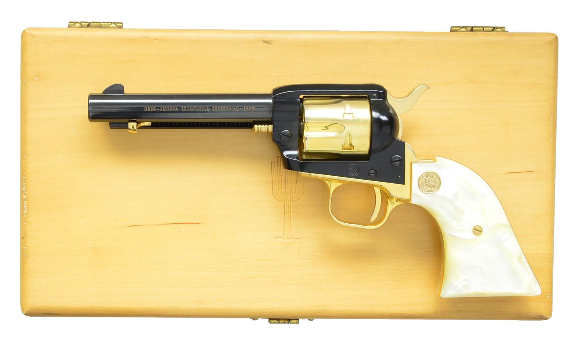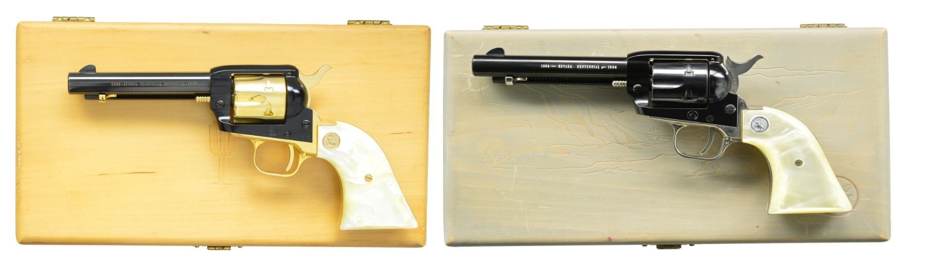 SCOUT SA REVOLVERS. BOTH: cal. 22 LR. Bbls. 4 3/4". 6 Shot fluted cyls. 1) ARIZONA TERRITORY CENTENNIAL 1863-1963. S# AT265. Blued bbl. & ejector housing w/ black anodized frame. Cyl., hammer & grip straps are gold anodized. 2 Piece pearl grips w/ gold Rampant Colt medallions. Limited edition of 5,355 mfg. 1963. UNATTACHED ACCESSORIES: wood presentation box w/ fitted gold cloth interior. CONDITION: as new appears unfired. (20-88/DS). 2) NEVADA CENTENNIAL1864-1964. S# 2637NS. Blued bbl. & cyl. Black anodized frame. Nickel finished hammer, trigger & grip straps. 2 Piece pearl grips w/ silver Rampant Colt medallions. Limited edition of 3,984 mfg. 1964. UNATTACHED ACCESSORIES: antique gray finished presentation box w/ blue & gray cloth interior. CONDITION: as new appears unfired. (20-90/DS). BOTH CURIO. $900-1,300.