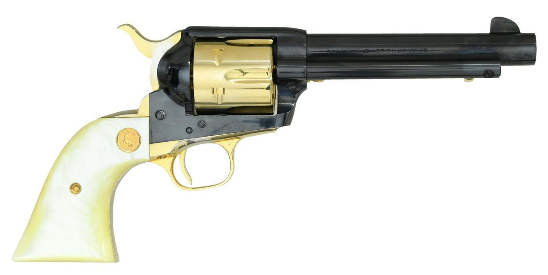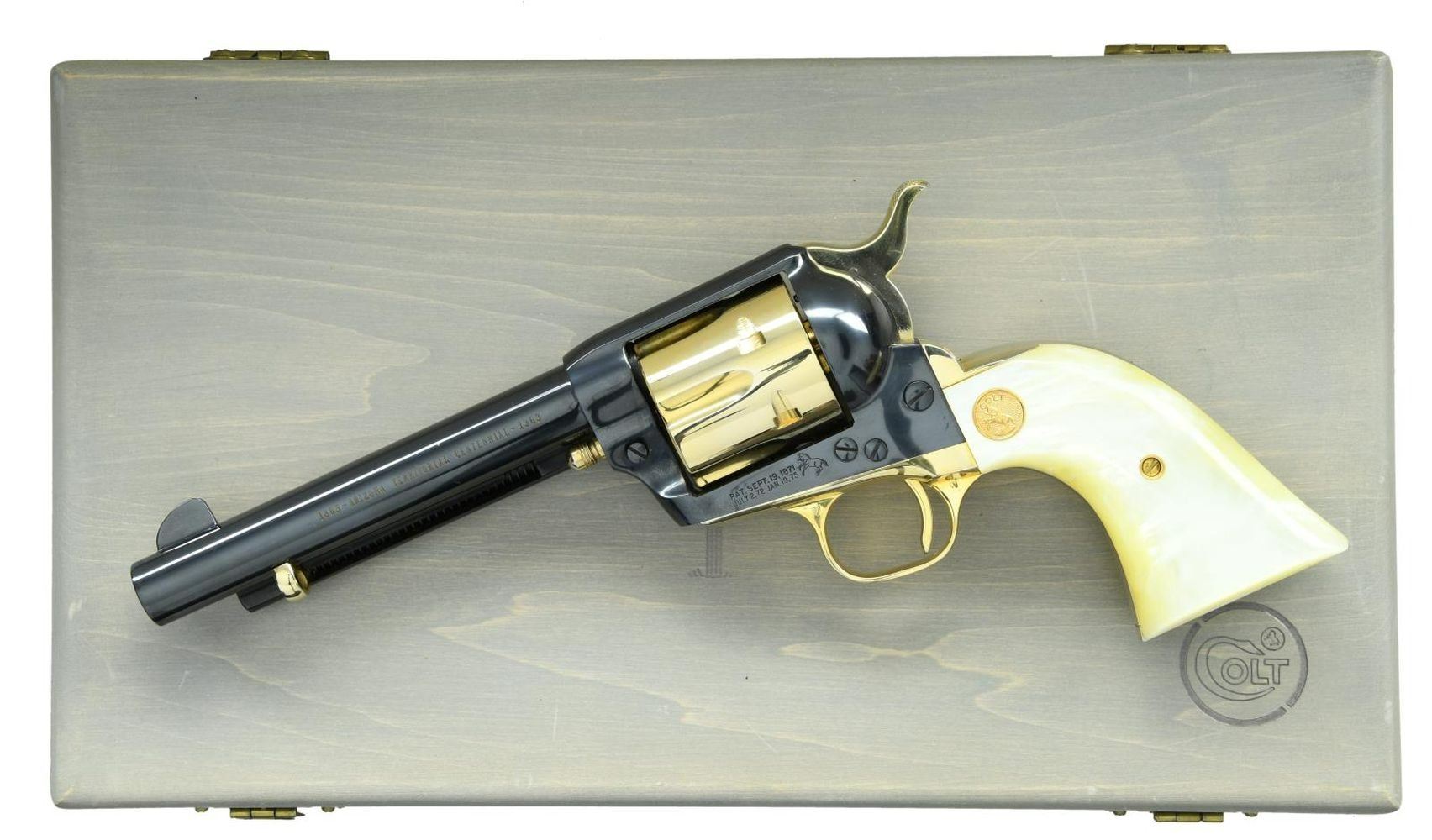 Cal. 45 Colt. S# 870AC. Bbl. 5 1/2" with blade sight plus gold filled "1863 - ARIZONA TERITORIAL CENTENNIAL - 1963" on left side; frame notched rear. Mfg. 1963 within 2 groups of serial numbers (1,280 units total): 100AT-129AT and 24AC-1273AC plus 5,355 Peacemaker 22 Scout models. Blued with gold plated base pin, ejector rod head, cylinder, hammer, trigger plus matching numbered trigger guard and backstrap. Simulated pearl grips with gold grip screw and Colt medallions. Barrel, frame, and its screws are blued. UNATTACHED ACCESSORIES: very good (small, minor marks) grey satin stained wood presentation case with cactus and "Colt" on lid. Gold, velvet and satin interior. Case finish to approximate western weathered lumber. Factory manual and unused warranty card. CONDITION: very good to excellent general appearance. Areas of gold polished to reveal base nickel plating are: backstrap including butt, right side of hammer and frontstrap behind triggerguard. Balance of revolver is near excellent including bore and grips; appears unfired. (23-5620/NW). CURIO. $650-900.