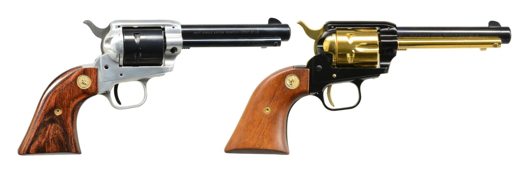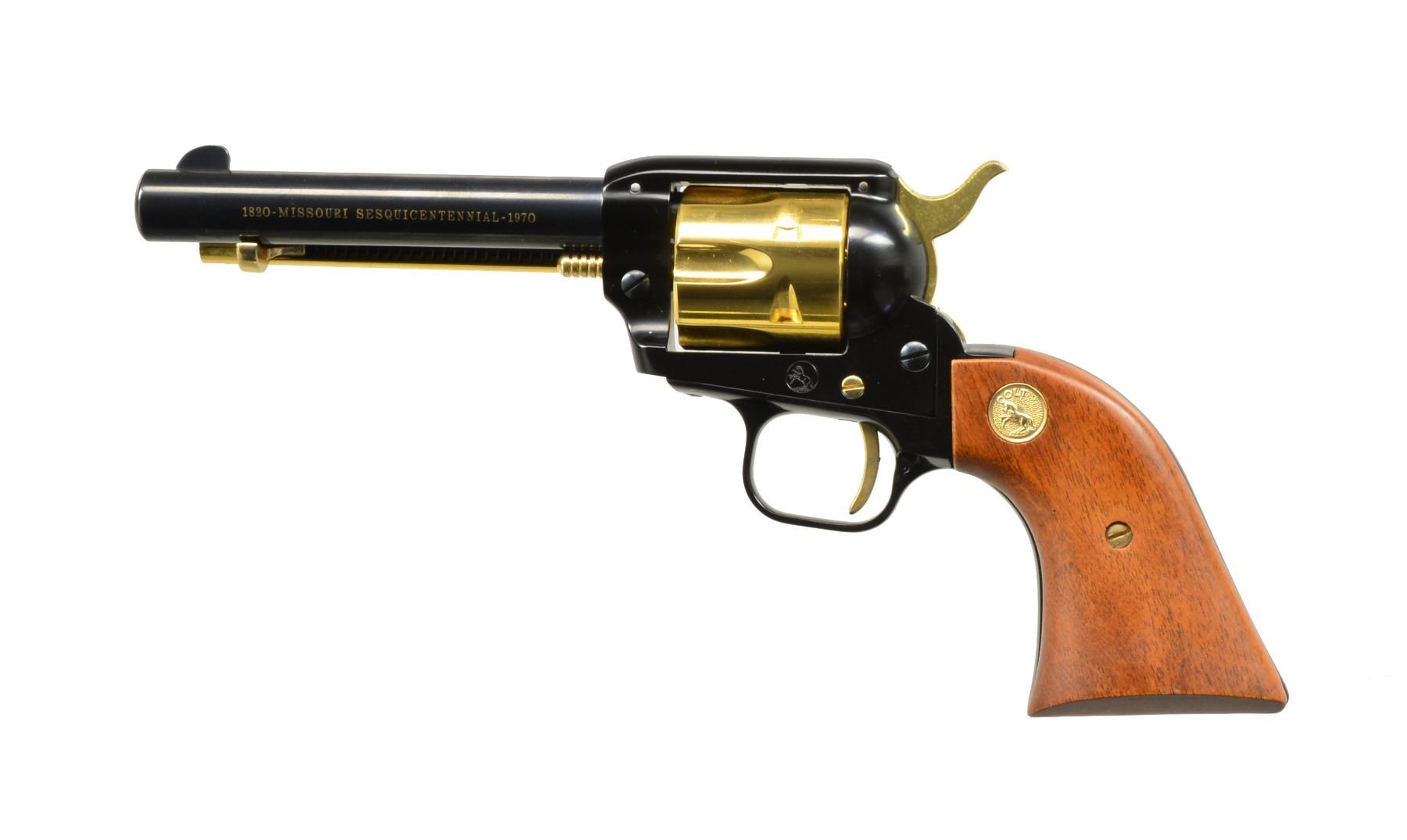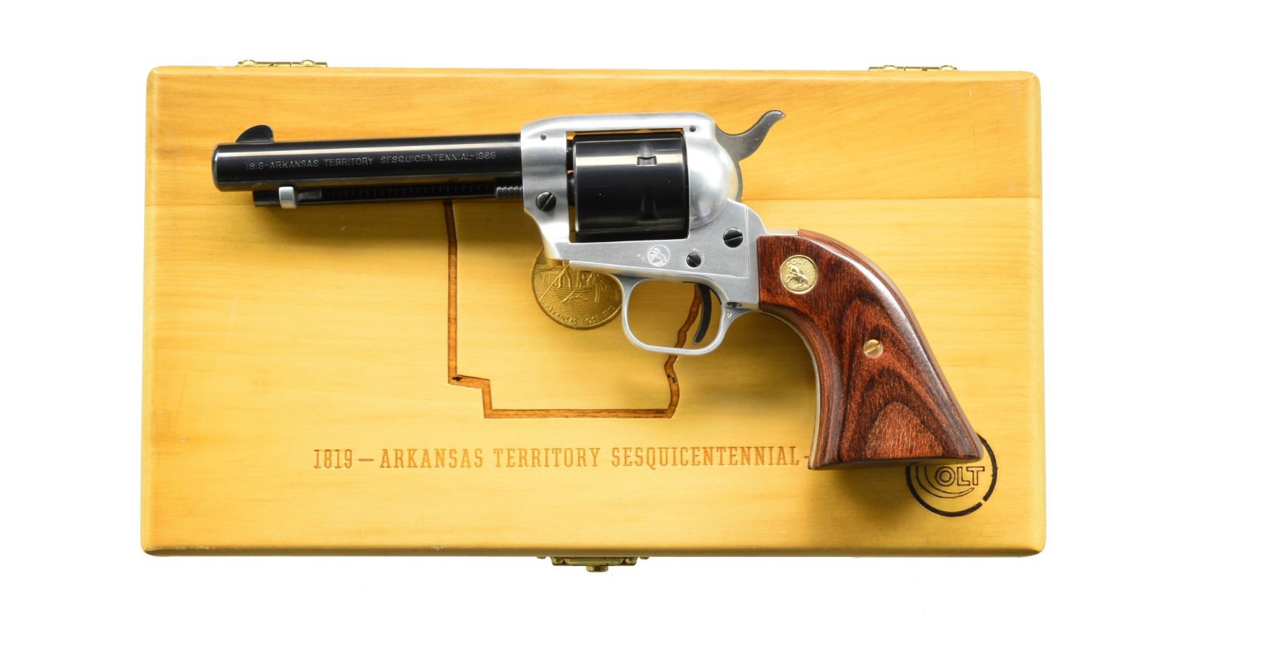 SCOUT SA REVOLVERS. BOTH: cal. 22 LR. Bbls. 4 3/4". 1) ARKANSAS TERRITORY SESQUICENTENNIAL 1819-1969. S# 2400ARK. Bbl., cyl., ejector housing, hammer & trigger are blued. Alloy frame & grip straps have natural finish. 2 Piece laminated wood grips w/ gold Rampant Colt medallions. Limited edition of 3,500 mfg. 1969. UNATTACHED ACCESSORIES: wooden display box w/ red fitted interior having Arkansas medallion on lid. Case key is included. CONDITION: as new. (20-89/DS). 2) MISSOURI SESQUICENTENNIAL. S# 2734MOS. 6 Shot fluted cyl., ejector housing, hammer, trigger & cyl. pin are gold anodized. Blued bbl. Black anodized frame & grip straps. 2 Piece walnut grips having gold Rampant Colt medallions. Limited edition of 3,000 mfg. 1970. UNATTACHED ACCESSORIES: wood display box having plexiglass front & top w/ red velour interior. Case contains Missouri Sesquicentennial medallion & case key. CONDITION: as new. (20-100/DS). BOTH CURIO. $900-1,300.