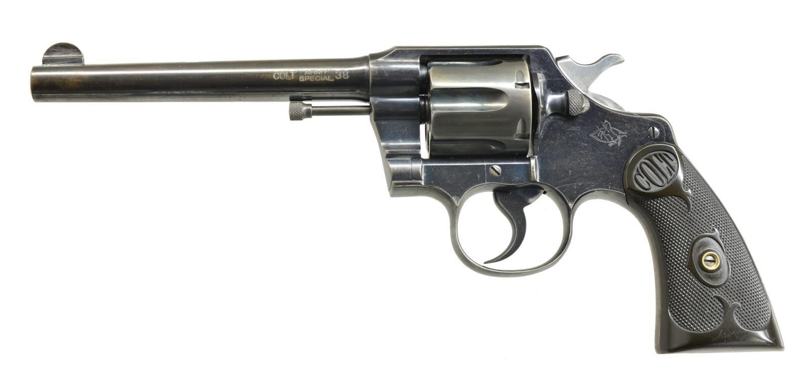 Cal. 38 Spl. S# 303278. Bbl. 6” w/ semicircular sight. 6 Shot fluted cyl. Blue finish. 2 Piece checkered hard rubber grips. 1908 Mfg. CONDITION: 60% lightly faded blue showing touch up on cyl. & bbl. Grips show light wear. Bright bore w/ strong rifling. (20-3721/DS). CURIO. $500-800.