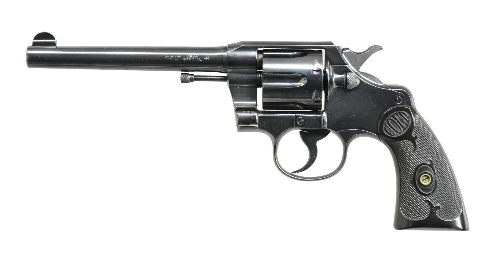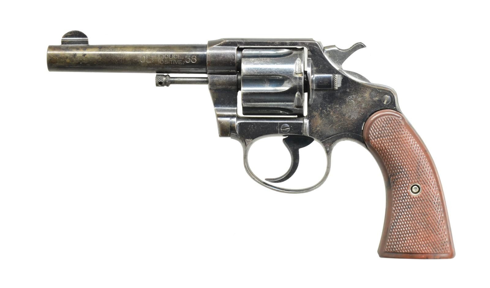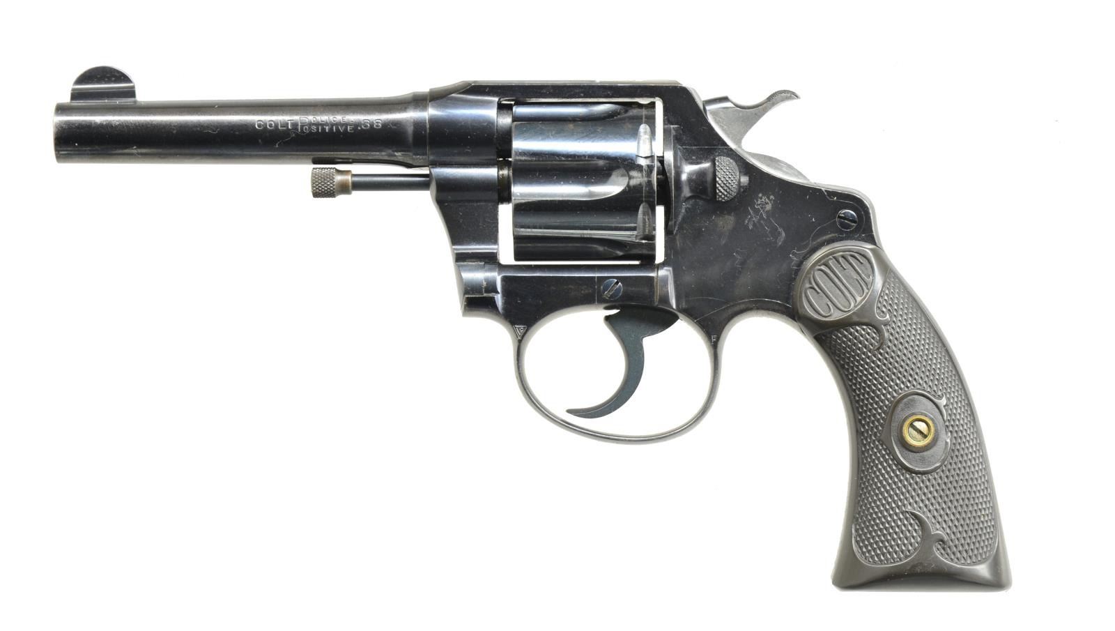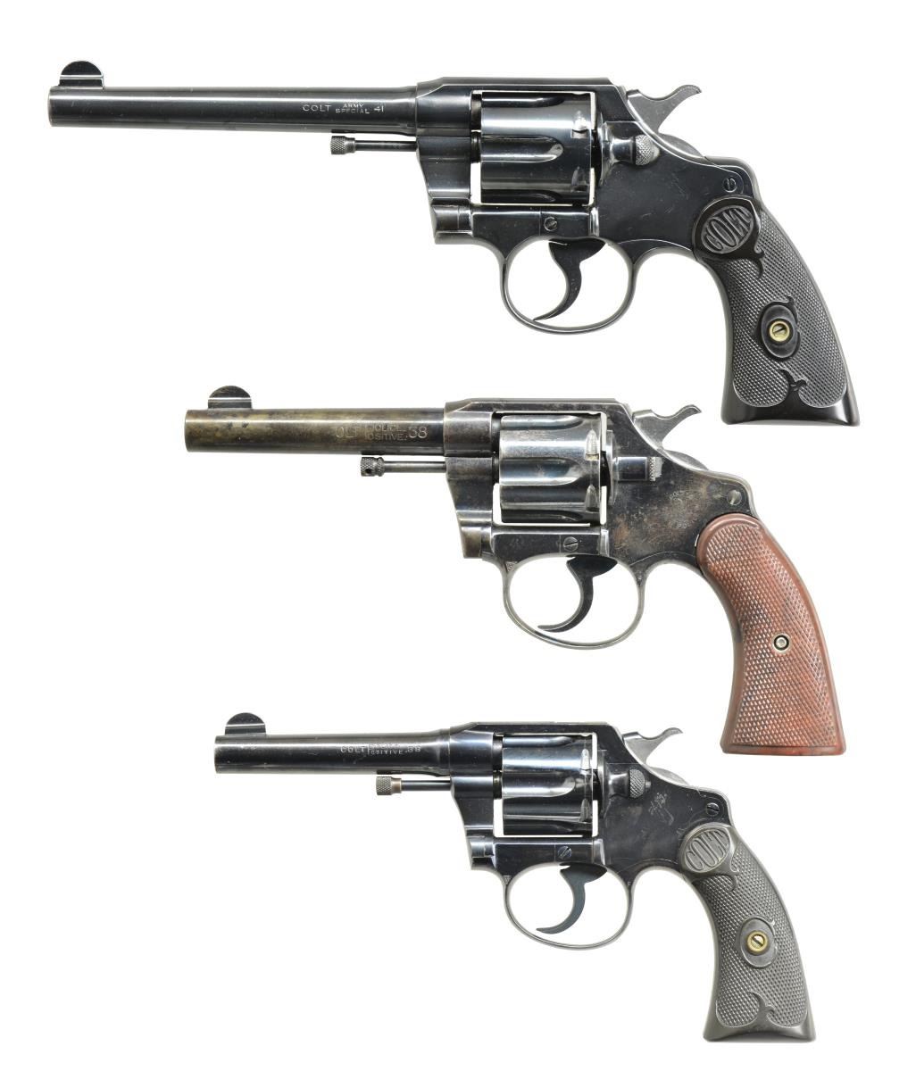 1) ARMY SPECIAL. Cal. 41 Colt. S# 421706. Bbl. 6" w/ semicircular front sight. 6 Shot fluted cyl. 2 Piece checkered hard rubber grips. 1916 Mfg. CONDITION: 98% reblued finish showing some remaining pitting. Grips show light marks. Bright bore w/ sound rifling. (20-3735/DS). 2) POLICE POSITIVE. Cal. 38 Colt. S# 19013. Bbl. 4" w/ semicircular front sight. 6 Shot fluted cyl. Blue finish. 2 Piece checkered plastic replacement grips. 1909 Mfg. CONDITION: 50% faded blue showing spots of corrosion. Good grips. Bore retains lightly worn rifling showing scattered spots of pitting. (20-3776/DS). 3) POLICE POSITIVE. Cal. 38 Colt. S# 80758. Bbl. 4" w/ semicircular front sight. 6 Shot fluted cyl. Blue finish. 2 Piece checkered hard rubber grips. 1915 Mfg. CONDITION: over 90% original blue showing scattered spots of corrosion. Grips show light wear. Bore is generally bright w/ sound rifling showing a few scattered spots of very light pitting. (20-3779/DS). ALL CURIO. $750-1,250.