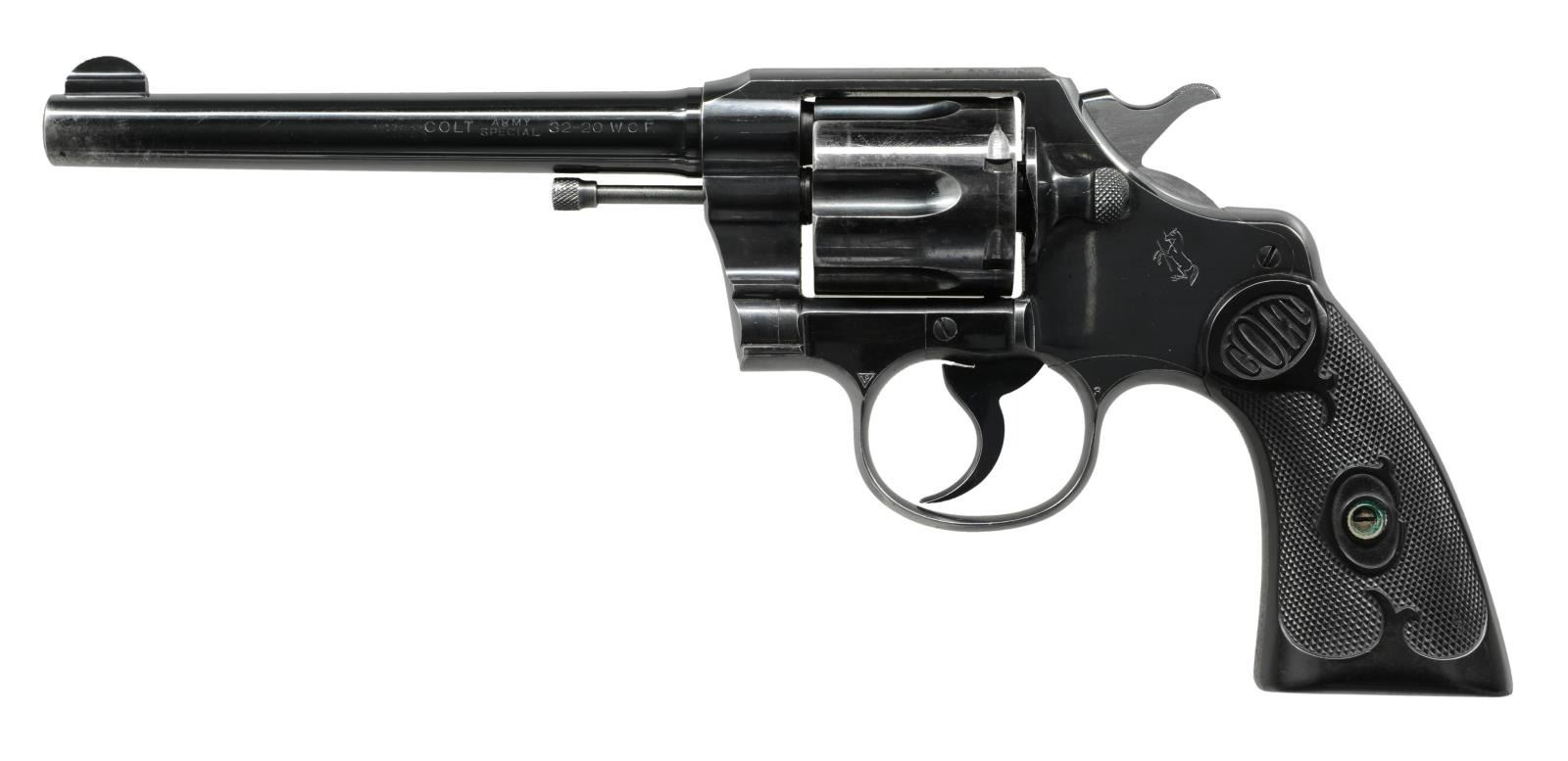 Cal. .32-20 W.C.F. S# 371788. Bbl 6". Army Special revolver manufactured by Colt in 1914. The left side of the barrel is stamped "COLT" followed by "ARMY/ SPECIAL" and the caliber designation, with Colt's 2 line address across the top. Left side of frame is stamped with the Rampant Colt logo and "VP" proof. Metal components exhibit a lustrous high polish blue finish, with the frame being mounted with 2 piece Colt checkered hard rubber grips. Matching numbers are present on the frame, cylinder crane, as well as on the interior of the left grip panel. UNATTACHED ACCESSORIES: Colt factory letter indicating that this revolver was 1 of 10 shipping to T.B. Davis Arms Company in Portland, ME on September 5th, 1914. CONDITION: metal components retain large amounts of their original factory blue finish, exhibiting some areas of wear and thinning that show through to gray patina, scattered superficial handling marks, as well as a few spots of mild surface oxidation. Grip straps retain a mostly gray patina w/ scattered spots of surface oxidation. Very bright bore, exhibiting some spots of light pitting and oxidation towards the muzzle. Grips show a few handling marks, but are otherwise very good. (23-1720/MLW). CURIO. $400-600.