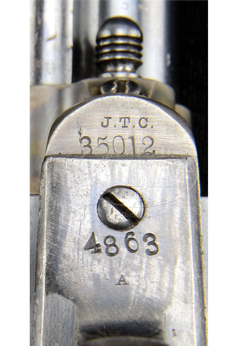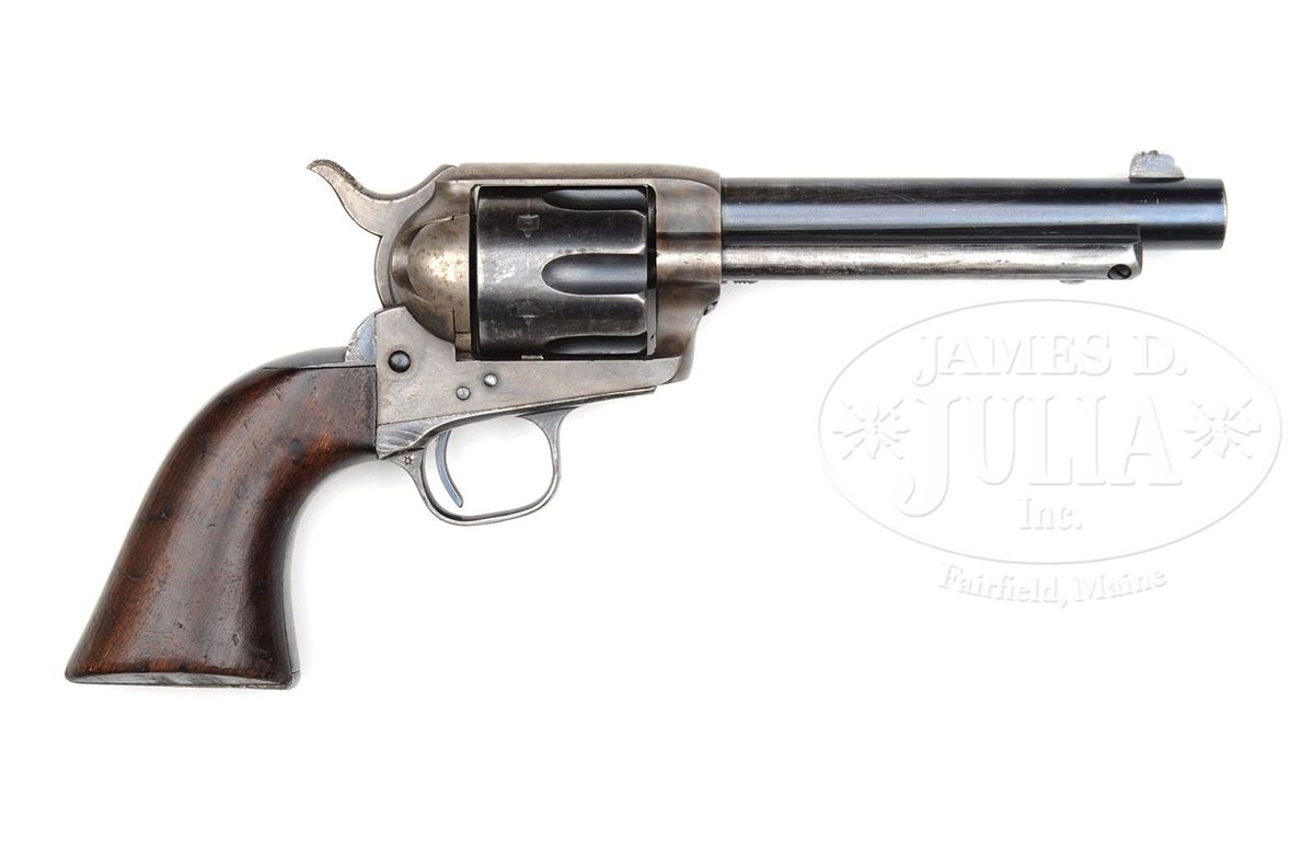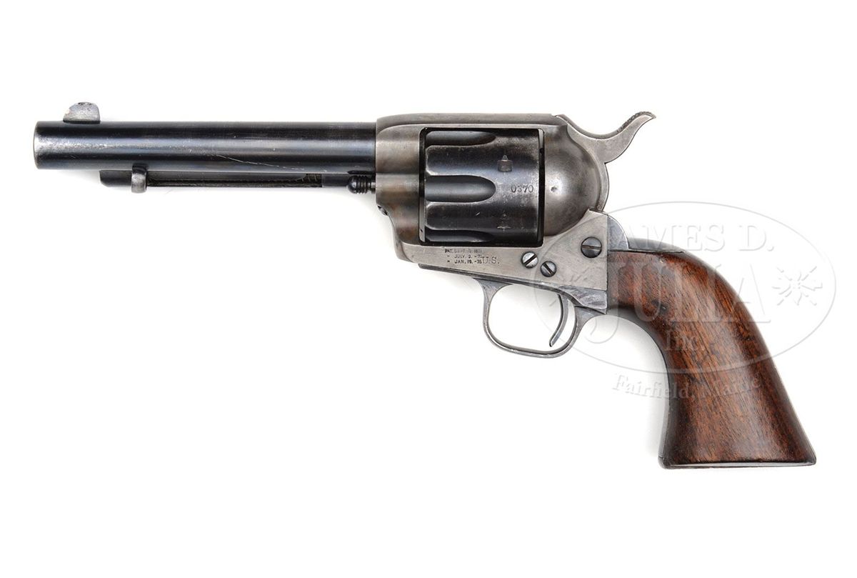 SN 35012. Cal. 45 Colt. Blue & color case hardened with 5-1/2" bbl, slightly thinned front sight and 1-line block letter address. Left side of frame has 3-line patent dates and a small "U.S.". Mounted with a 1-pc walnut grip that has last four digits "2360" or possibly "2368" in backstrap channel. Frame is marked with the "J.T.C." (John T. Cleveland) sub-inspector initials and is numbered "35012". Buttstrap is not inspected and has SN "54475". Cyl is Ainsworth inspected and has last four digits "0370" on the outer diameter. Bbl is numbered "4297" and is "DFC" (David F. Clark) inspected. The most interesting part is the trigger guard which is Ainsworth inspected and has the full SN "4863". This trigger guard was from Lot 5 which was for 1,000 Cavalry revolvers in the serial range 4500-5504, from which 755 revolvers were issued to the 7th Cavalry under Lt. Col. Custer in the second quarter of 1874. The other 250 or so revolvers were issued to the 1st Cavalry, another historic fighting Cavalry regiment. Odds are very that this trigger guard was on a revolver that fought at the Little Big Horn. CONDITION: Fine, mixed numbers as noted. Bbl retains about 85-88% glossy Colt blue with feathers on both sides of front sight and upper side of the ejector housing stud; frame retains strong case colors in the most sheltered areas with smoky case colors and silvery patina elsewhere; hammer retains smoky case colors turned silver on top & back edges; cyl retains strong blue in the flutes at about 60% thin orig blue on outer diameter; trigger guard & backstrap retain traces of blue, being mostly a silver/gray patina; ejector housing retains strong blue in the gullets, thin & turning silver on outer radius. Grip is sound showing moderate to heavy wear, having been cleaned & re-oiled and retains a hand worn patina. Mechanics are fine, bright shiny bore. 4-48787 JR344