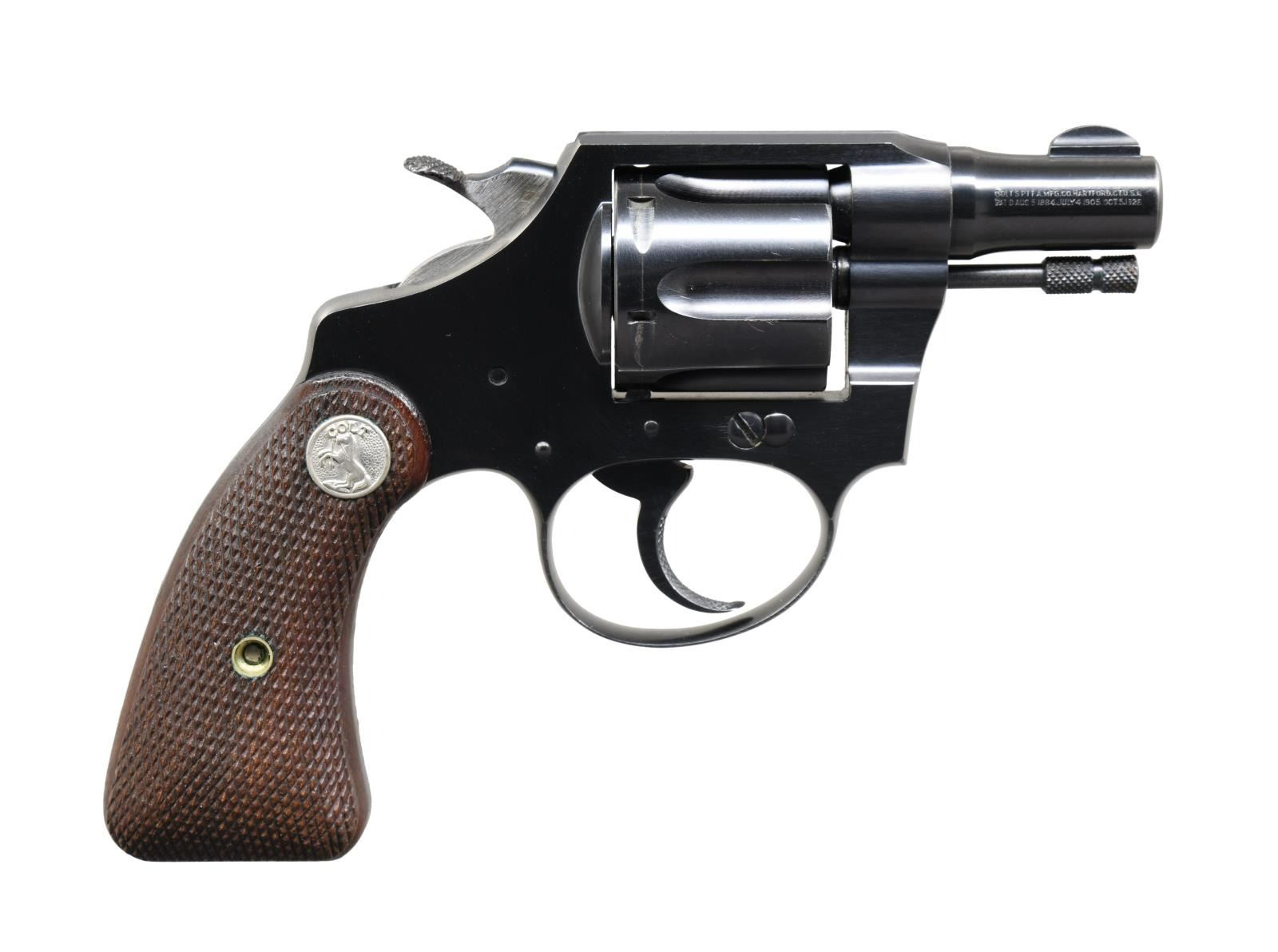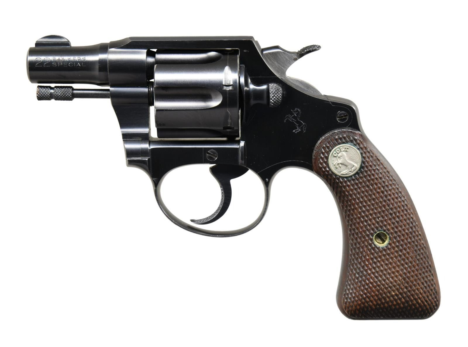 Cal. 22 LR. S# 369008. Bbl. 2" w/ semi-circular sight. Six shot fluted cyl. Blue finish w/ matted top strap. Hammer has polished sides. 2 piece checkered walnut round butt grips w/ silver rampant colt medallions. Mfg. 1934. CONDITION: over 97% original blue showing cyl. drag line. Grips show light wear. Very good bore. (24-986/DS). CURIO. $2,000-3,000.