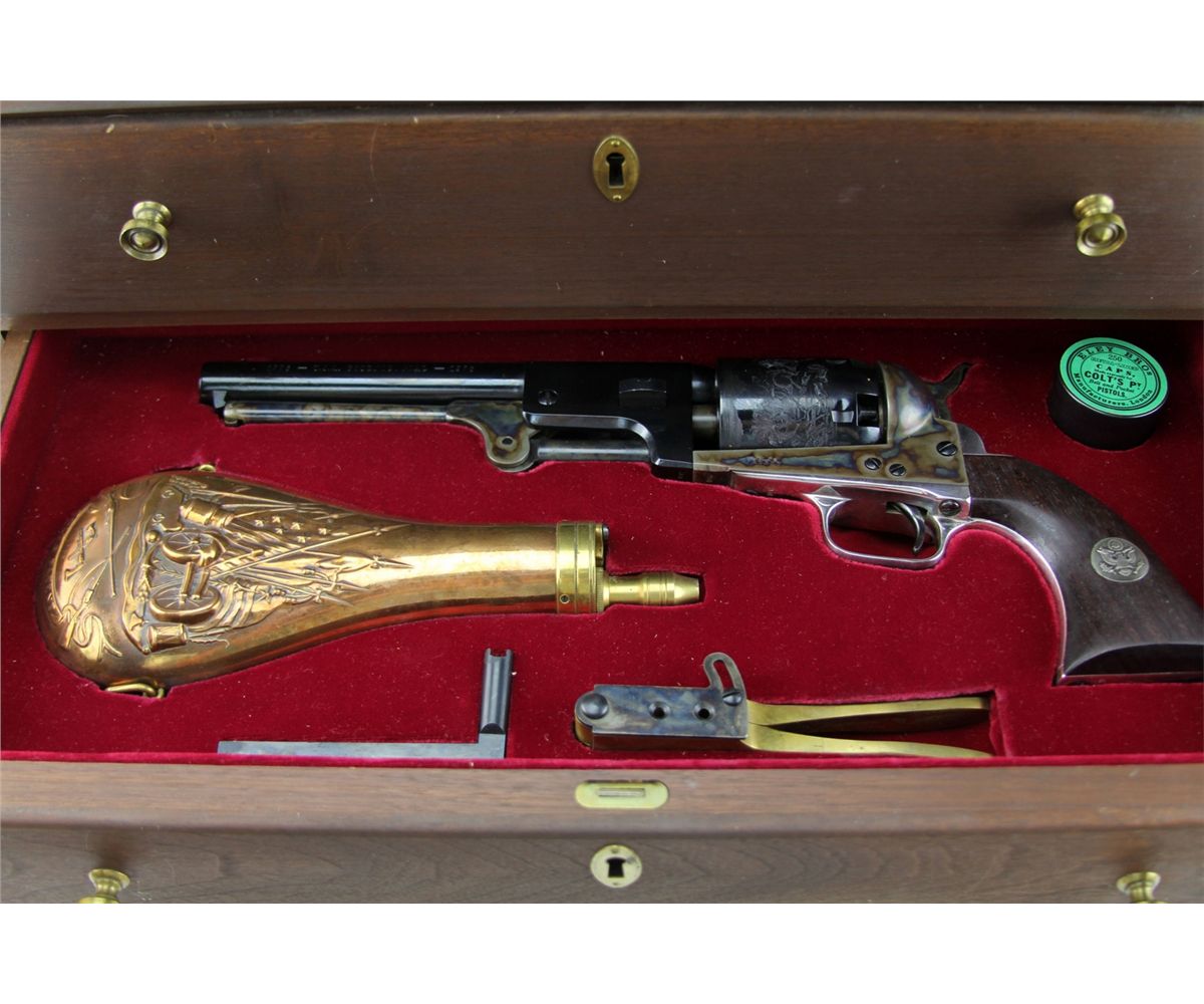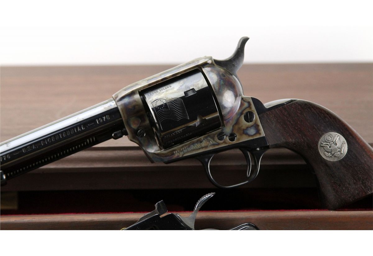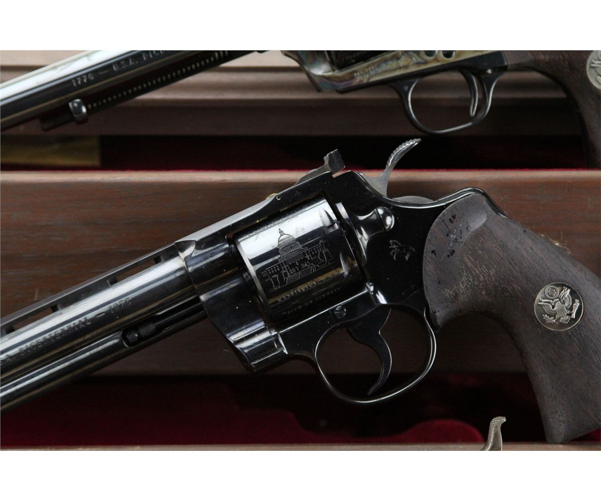 COLT BICENTENNIAL REVOLVER MEMORIAL SET Colt Bicentennial Memorial set featuring three revolvers: the .45 Cal sing action Army, .357 Python and the .44 Percussion Dragoon. Set includes three drawer display case and: Armsmear book, decorative powder flask, 250 caps, bullet mold and maintenance tool. All three revolvers have the US Army symbol embedded in wooden grips, blued barrels and chambers. The Army and Dragoon have toned receivers, the Python is blued. All revolvers come with boxes, papers. The chambers on all three are engraved with various designs, receivers and barrels bear Colt Manufacture marks. Size: 6 inch / 7.5 inch / 7.5 inch. Serial Number: 0692PY / 0692PM / 0692DG. Type: Revolver Manufacturer: Colt Serial Number: 0692PY / 0692PM / 0692DG Condition: Excellent.