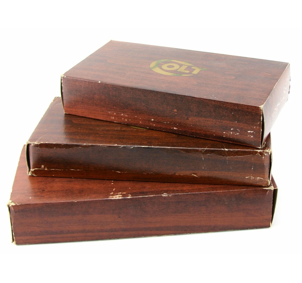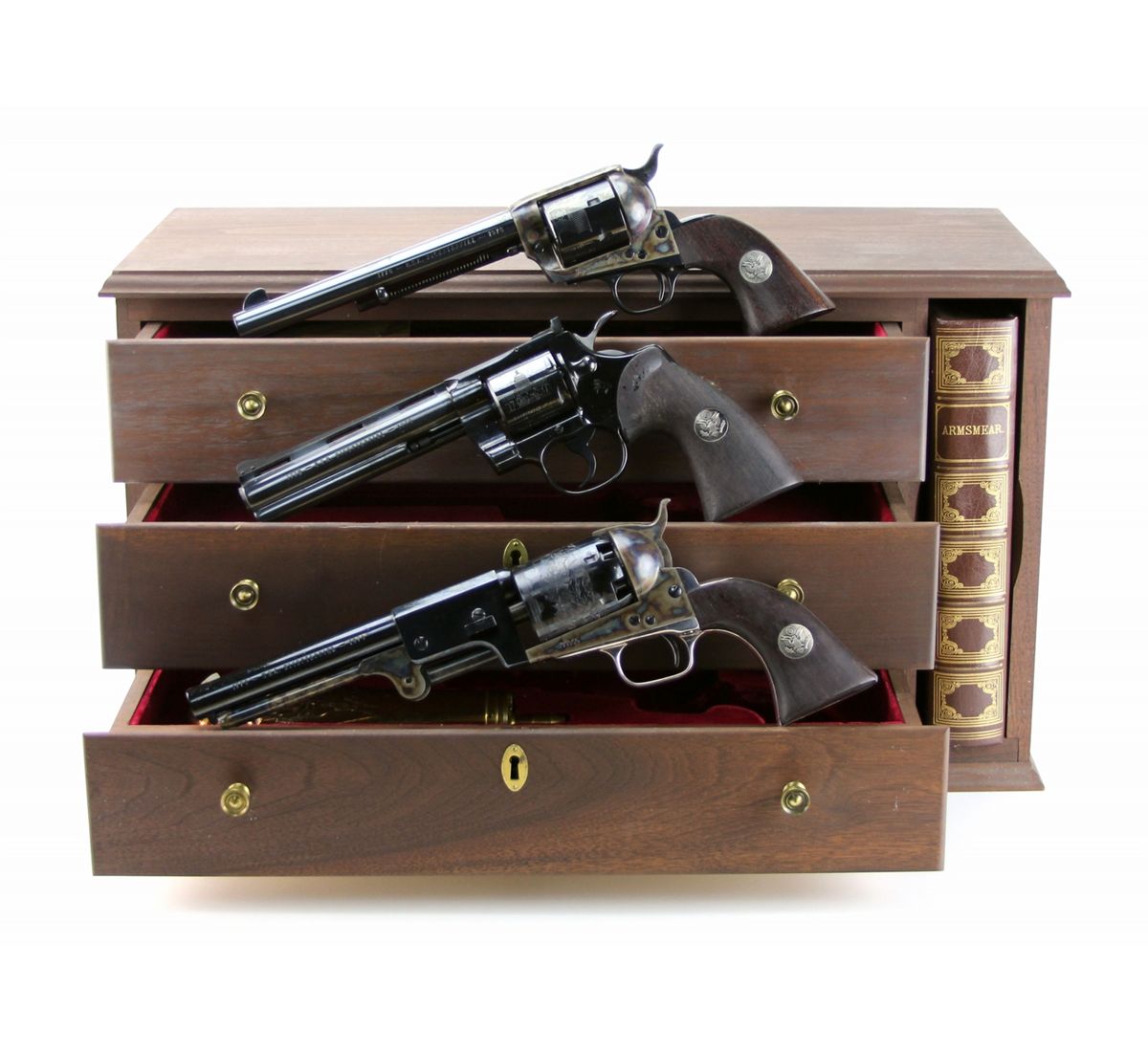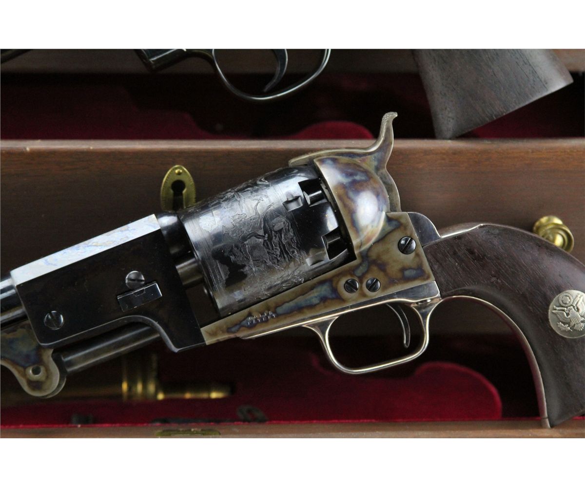 COLT BICENTENNIAL REVOLVER MEMORIAL SET Colt Bicentennial Memorial set featuring three revolvers: the .45 Cal sing action Army, .357 Python and the .44 Percussion Dragoon. Set includes three drawer display case and: Armsmear book, decorative powder flask, 250 caps, bullet mold and maintenance tool. All three revolvers have the US Army symbol embedded in wooden grips, blued barrels and chambers. The Army and Dragoon have toned receivers, the Python is blued. All revolvers come with boxes, papers. The chambers on all three are engraved with various designs, receivers and barrels bear Colt Manufacture marks. Size: 6 inch / 7.5 inch / 7.5 inch. Serial Number: 0692PY / 0692PM / 0692DG. Type: Revolver Manufacturer: Colt Serial Number: 0692PY / 0692PM / 0692DG Condition: Excellent.