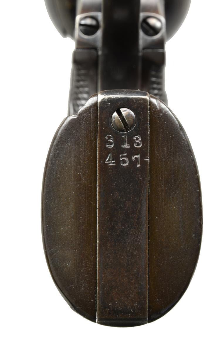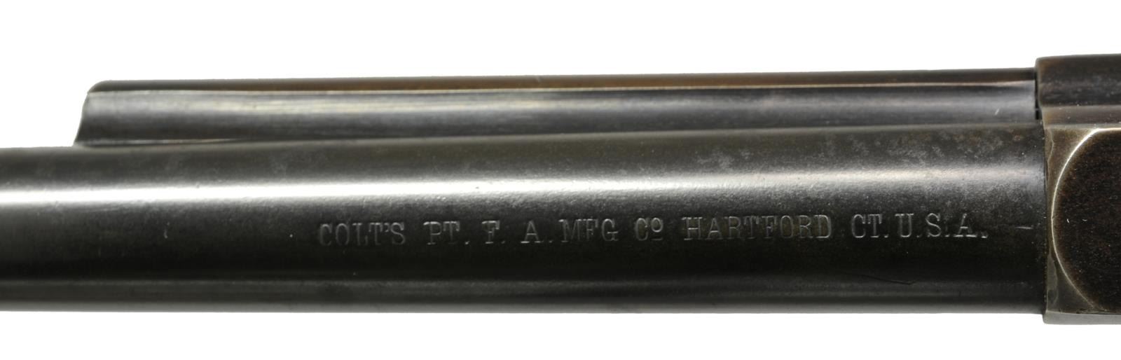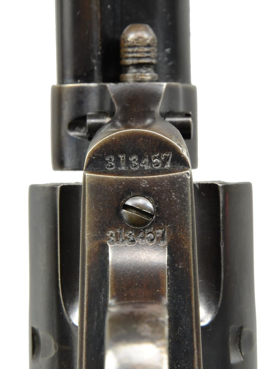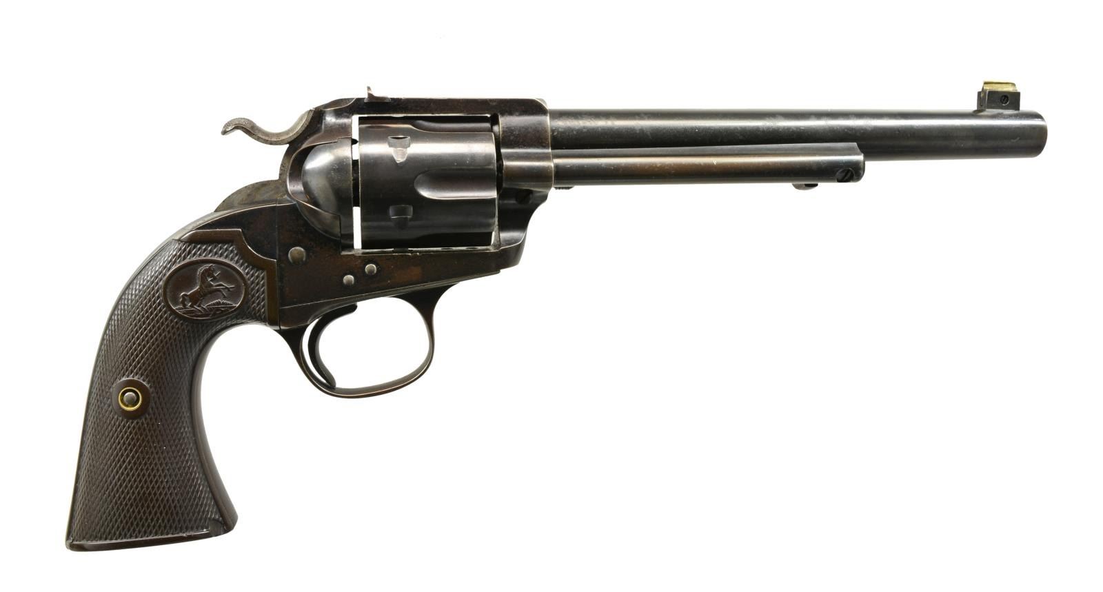 Cal. 32 WCF (32-20). S# 313457. Bbl. 7 1/2" marked "(BISLEY MODEL)" on left side. Replacement brass pinned blade front sight w/ U notch rear sight. 6 Shot fluted cyl. Blue finish w/ case colored hammer. 2 Piece checkered hard rubber Rampant Colt grips. UNATTACHED ACCESSORIES: Colt Mfg. Co. letter stating the following information "Serial Number: 313457 / Caliber: .32/20 / Barrel Length: 7 1/2" / Finish: Blue / Type of Stocks: Not Listed / Shipped to: Durham, Carrigan & Hayden Company / Address: San Francisso, California / Date of Shipment: December 3, 1910 / Number of Same Type Guns in Shipment: 1". CONDITION: 75% dull blue fading to brown showing spots of light pitting. Hammer retains traces of case colors in protected areas. Grips show light checkering wear w/ handling marks & 1 chip at butt. Sound mechanics. Bore has frosted appearance w/ worn rifling showing light pitting. (20-1740). CURIO. $6,000-9,000.