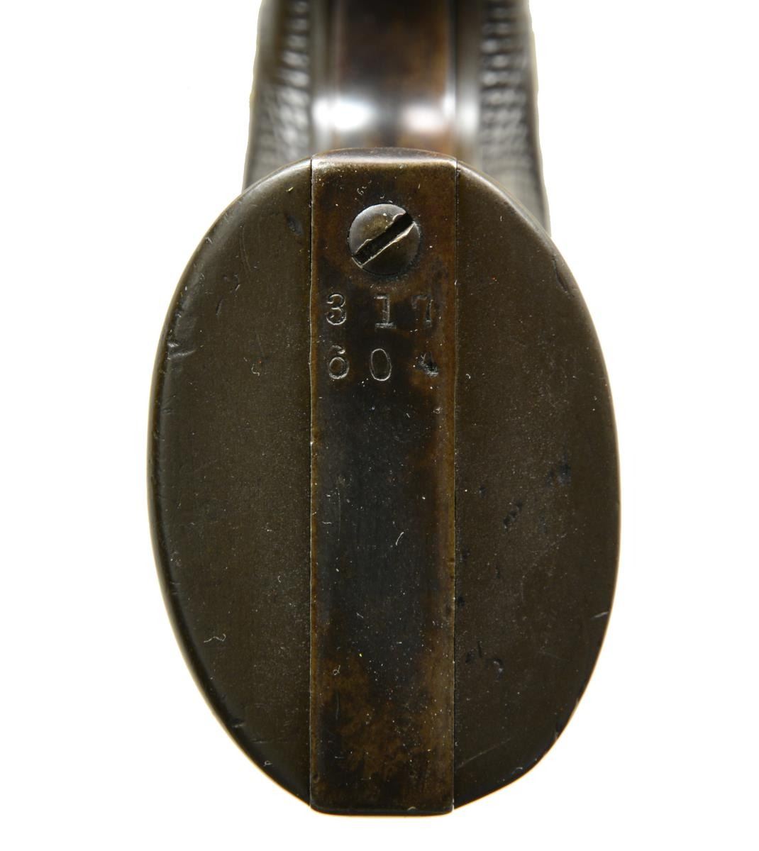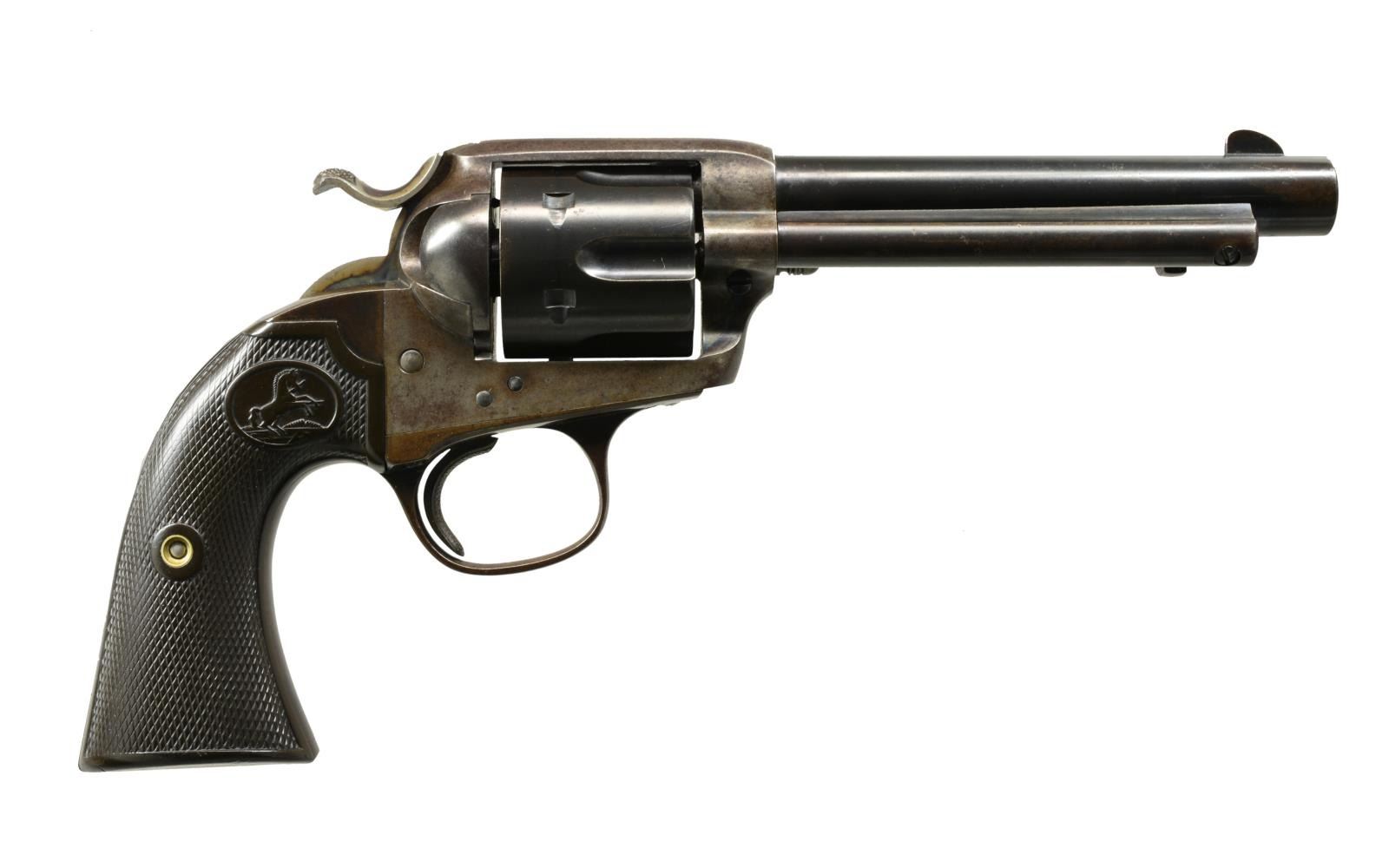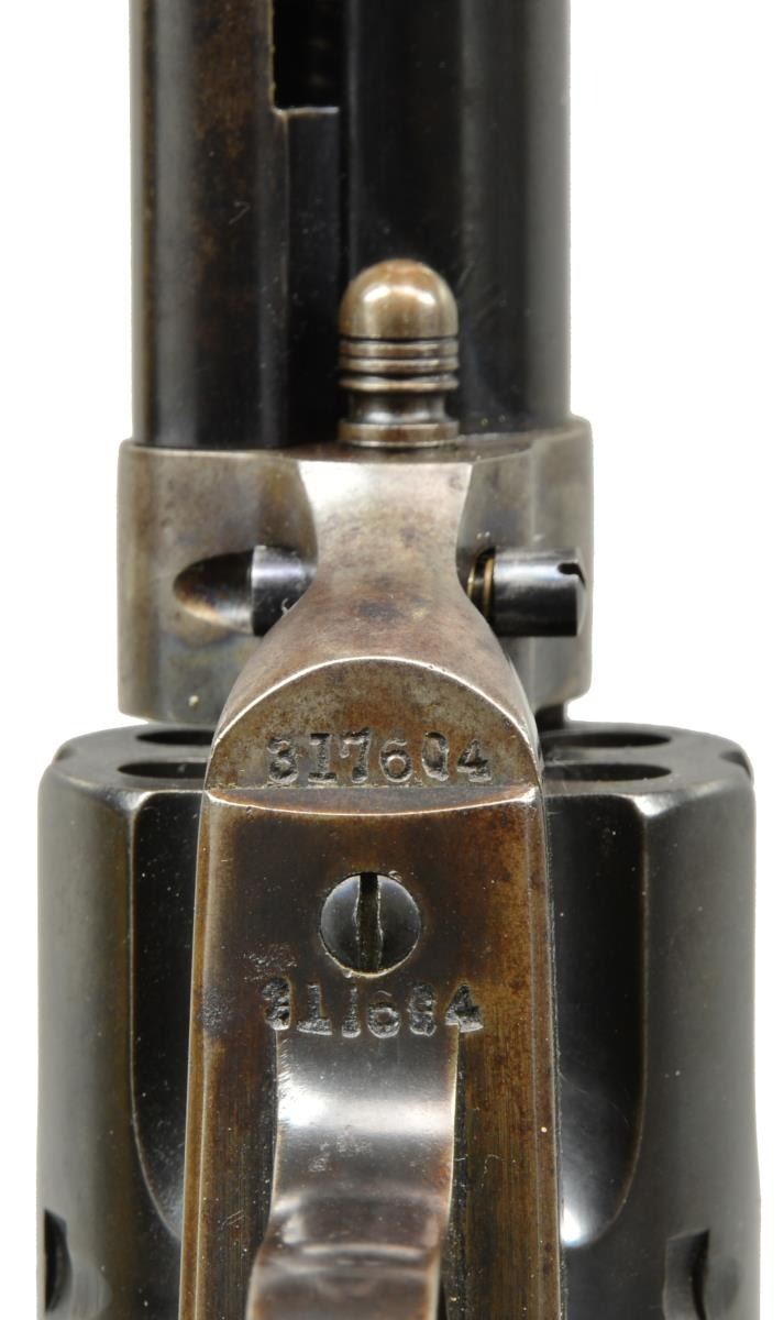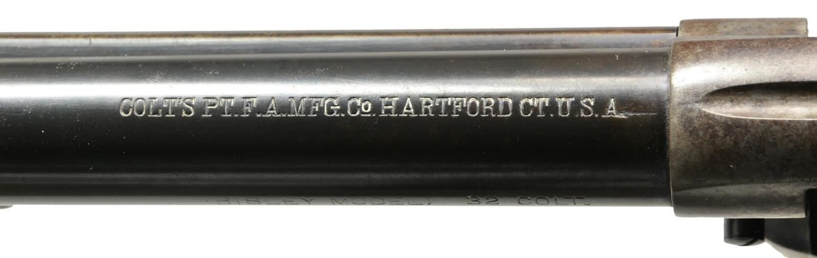 Cal. 32 Colt. S# 317604. Bbl. 5 1/2" w/ blade front sight. 6 Shot fluted cyl. Blue finish w/ case colored action. Trigger has aftermarket hand checkering. 2 Piece checkered hard rubber Rampant Colt grips. 1911 Mfg. CONDITION: bbl., cyl. & grip straps retain 70% dull fading blue fading to brown. Frame is fading to mottled gray brown retaining a sm. amount of case colors in protected areas. Hammer retains 70% lightly faded case colors. Grips have worn checkering. Sound mechanics. Bore retains strong rifling showing sm. spots of very light roughness. (20-1739). CURIO. $3,000-5,000.