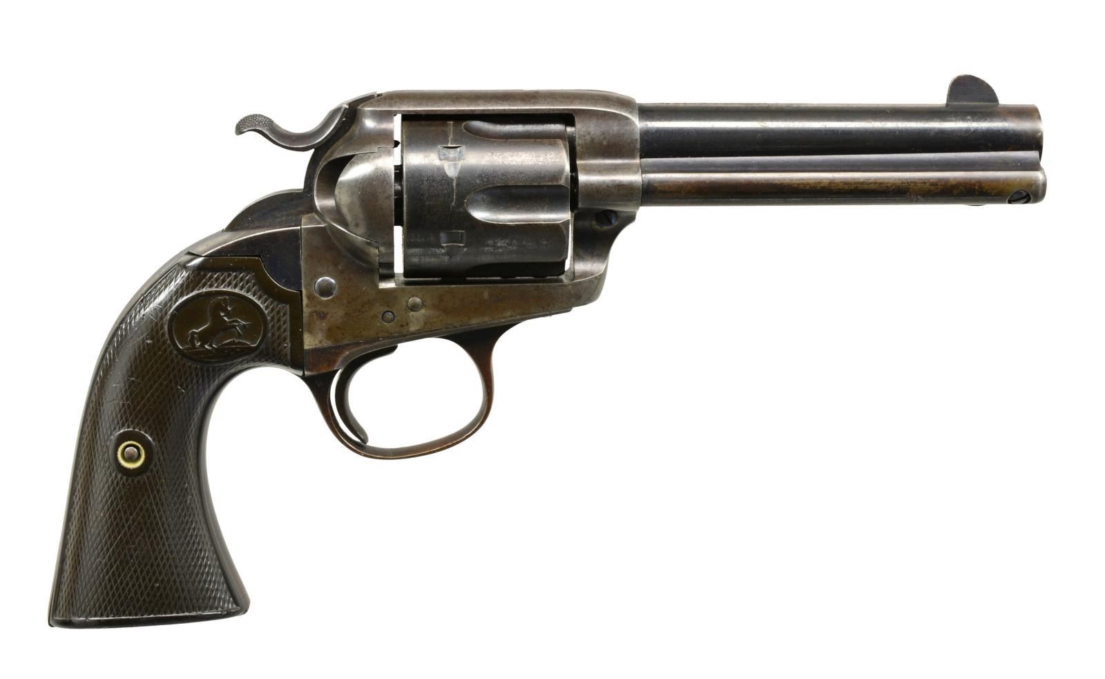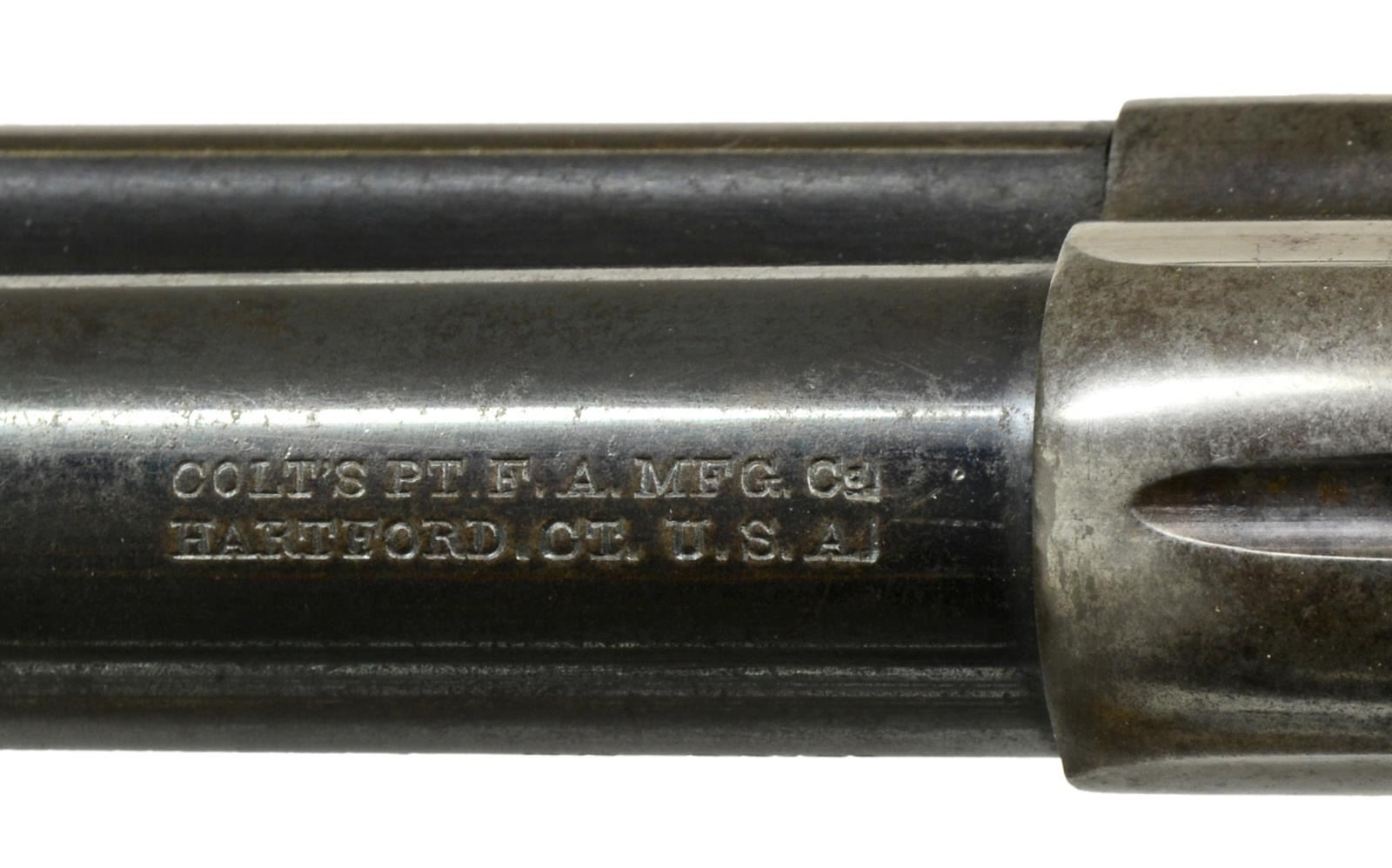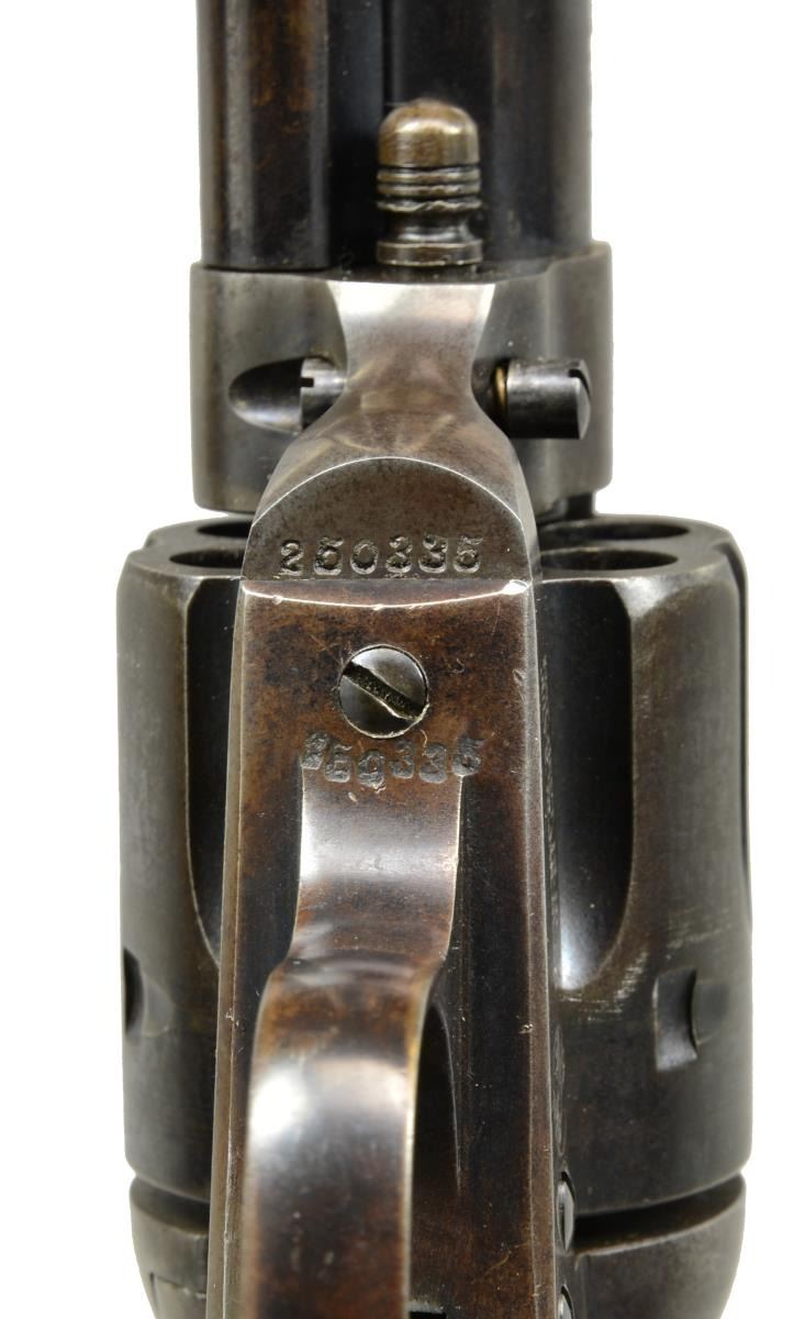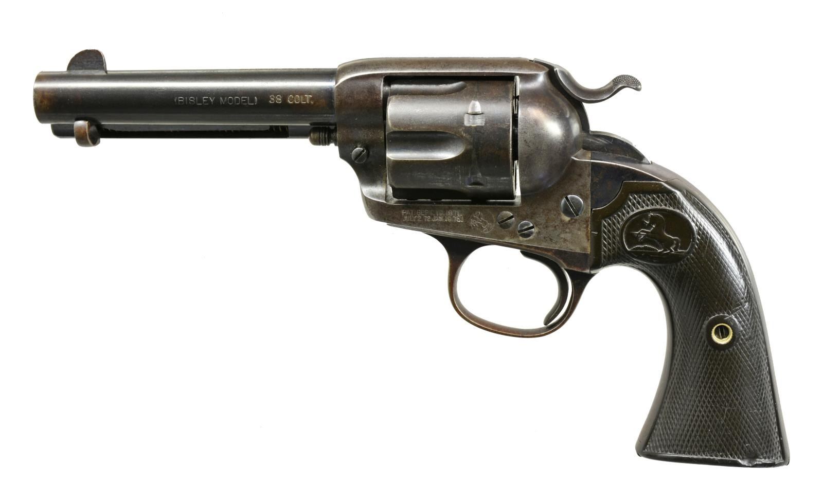 Cal. 38 Colt. S# 250335. Bbl. 4 3/4" w/ blade front sight. Left side marked "{BISLEY MODEL}". 6 Shot fluted cyl. Blue finish w/ case colored frame & hammer. 2 Piece checkered hard rubber Rampant Colt grips. UNATTACHED ACCESSORIES: Colt Mfg. Co. letter stating the following information "Serial Number: 250335 / Caliber: Illegible 38 Colt? / Barrel LEngth: 4 3/4" / Finish: Blue / Type of Stocks: Not Listed / Shipped to Markt & Company / Address: New York, New York / Date of Shipment: November 25,1903. / Number of Same Type Guns in Shipment: 2". CONDITION: 40% dull blue fading to brown w/ scattered light corrosion & sm. dents at butt. Frame & hammer fading to brown retaining case colors only in protected areas. Grips show heavy wear w/ scratches & handling marks having sm. chips at butt. Sound mechanics. Bore is bright w/ strong rifling showing sm. spots of pitting. (20-1746). CURIO. $3,000-4,000.
