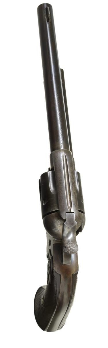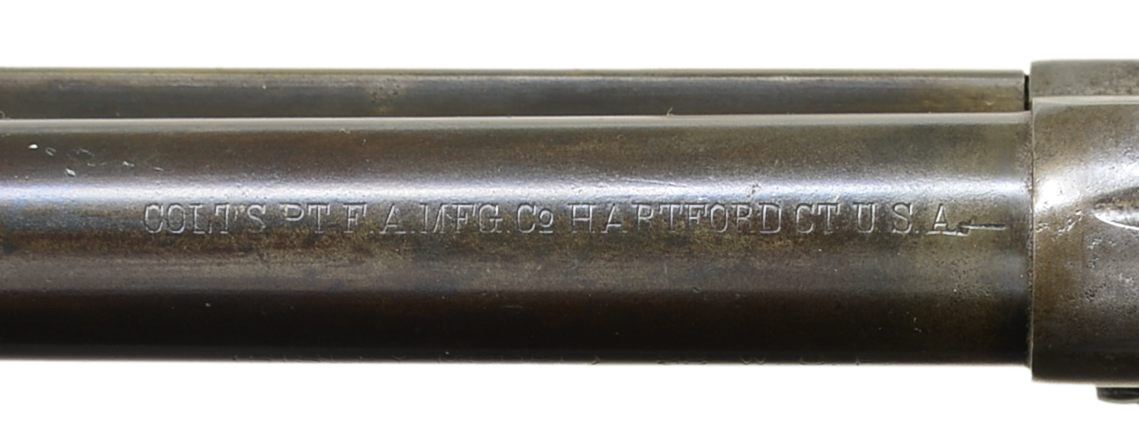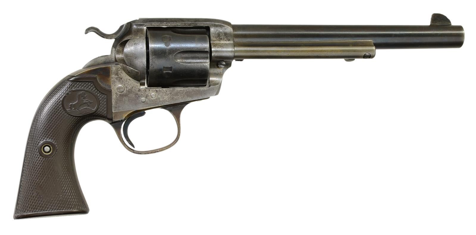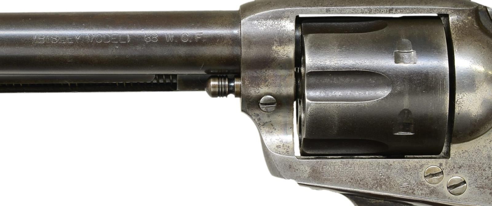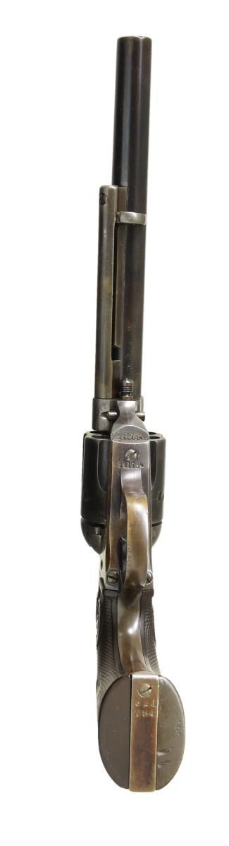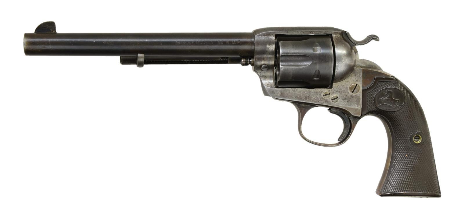 Cal. 38 W.C.F. (38-40). S# 321784. Bbl. 7 1/2". 6 Shot fluted cyl. Blue finish w/ case colored frame. 2 Piece checkered hard rubber Rampant Colt grips. Mfg. 1912. CONDITION: bbl., cyl. & grip straps have faded blue w/ a brown appearance from touch up finish showing sm. scattered dents & handling marks. Frame has faded to a mottled silver brown. Grips show moderate wear w/ spots of flattened checkering & sm. dents at butt. Sound mechanics. Bore retains lightly worn rifling w/ areas of very light pitting. (20-1747). CURIO. $2,000-4,000.