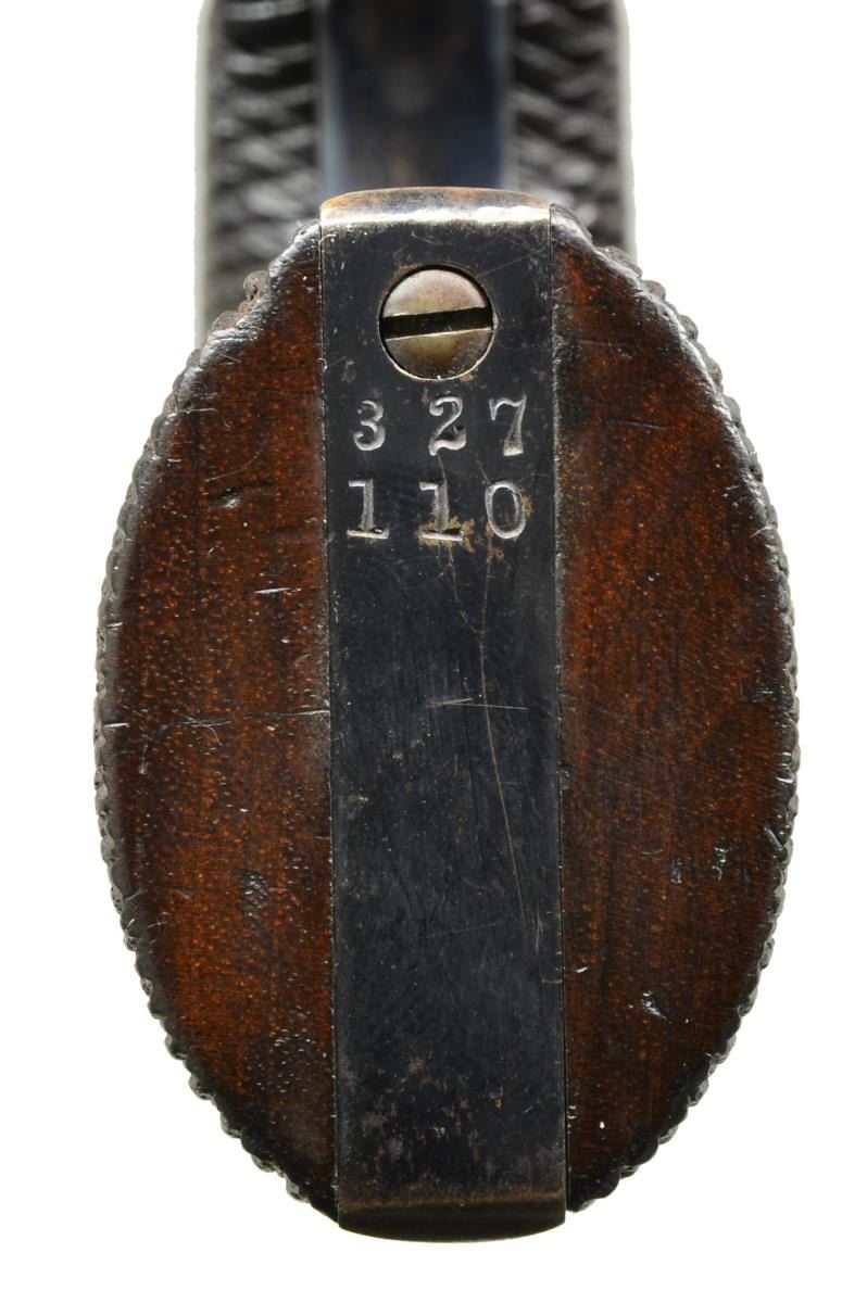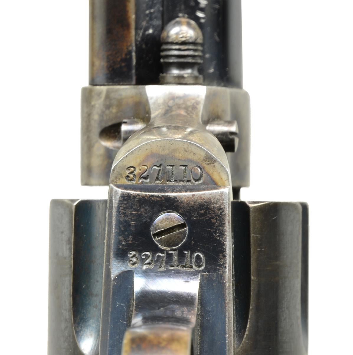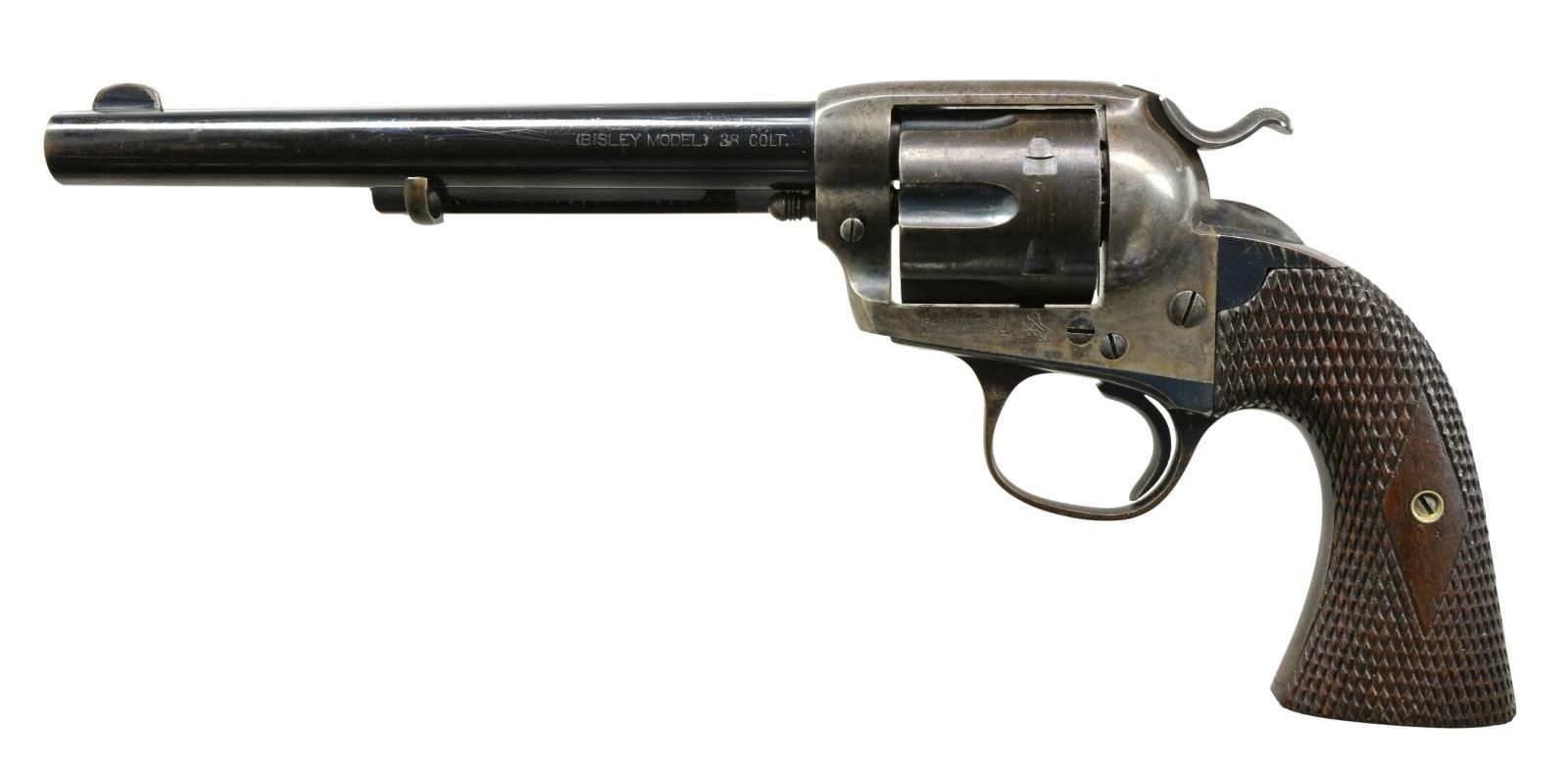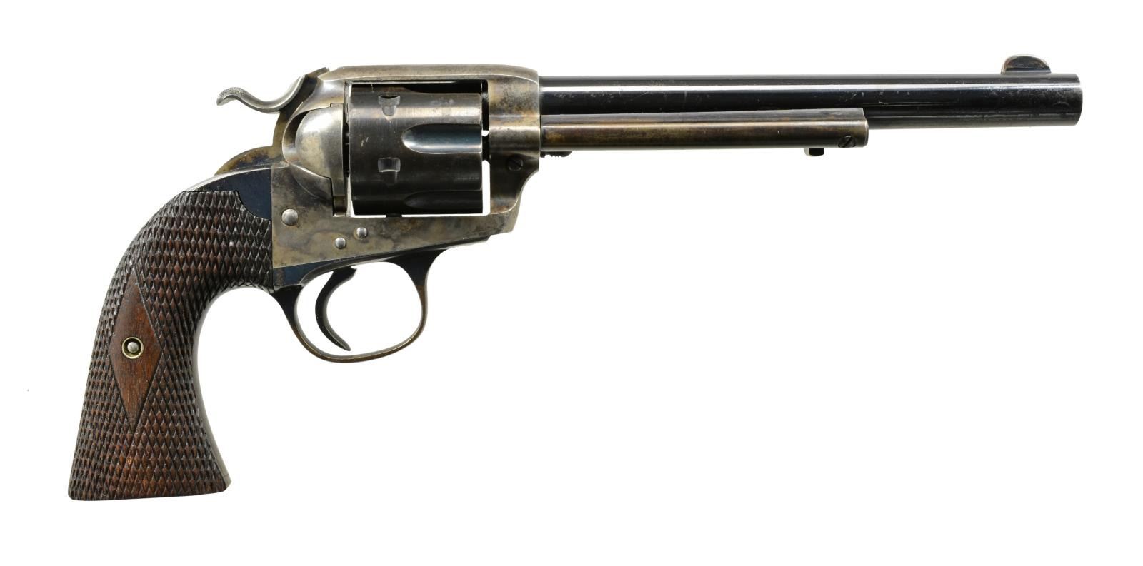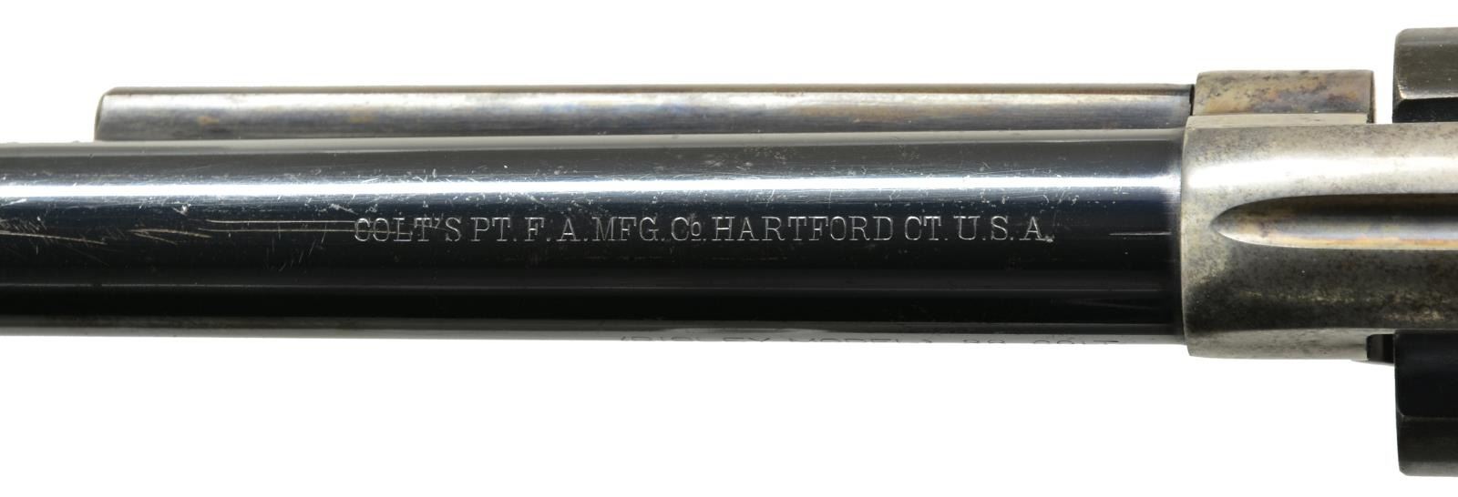 Cal. 38 Colt. S# 327110. Bbl. 7 1/2" w/ semicircular sight. 6 Shot fluted cyl. Blue finished bbl., cyl. & grip straps w/ case colored frame & hammer. 2 Piece diamond checkered walnut grips. UNATTTACHED ACCESSORIES: Colt Mfg. Co. Inc. letter stating the following information: Caliber: .38 Colt / Barrel Length: 7 1/2". / Finish: Blue / Type of Stocks: Wood / Shipped To: J.S. Fickling / Address: Unavailable / Date of Shipment: June 12, 1913 / Number of Same Type Guns in Shipment: 1". CONDITION: bbl. retains 90% blue showing scattered light marks. Ejector housing, grip straps & cyl. retains 80% lightly faded blue showing spots of fading. Grips retain sharp checkering showing sm. handling marks w/ sm. chip at toe of right panel. Crisp mechanics. Bore has lightly frosted appearance retaining strong rifling showing sm. spots of pitting. (20-1744). CURIO. $6,500-8,000.