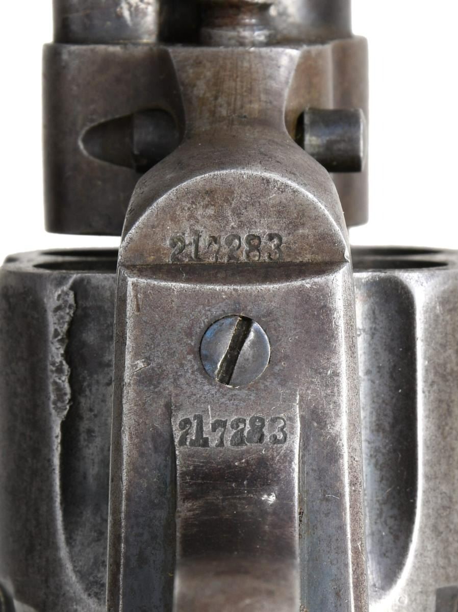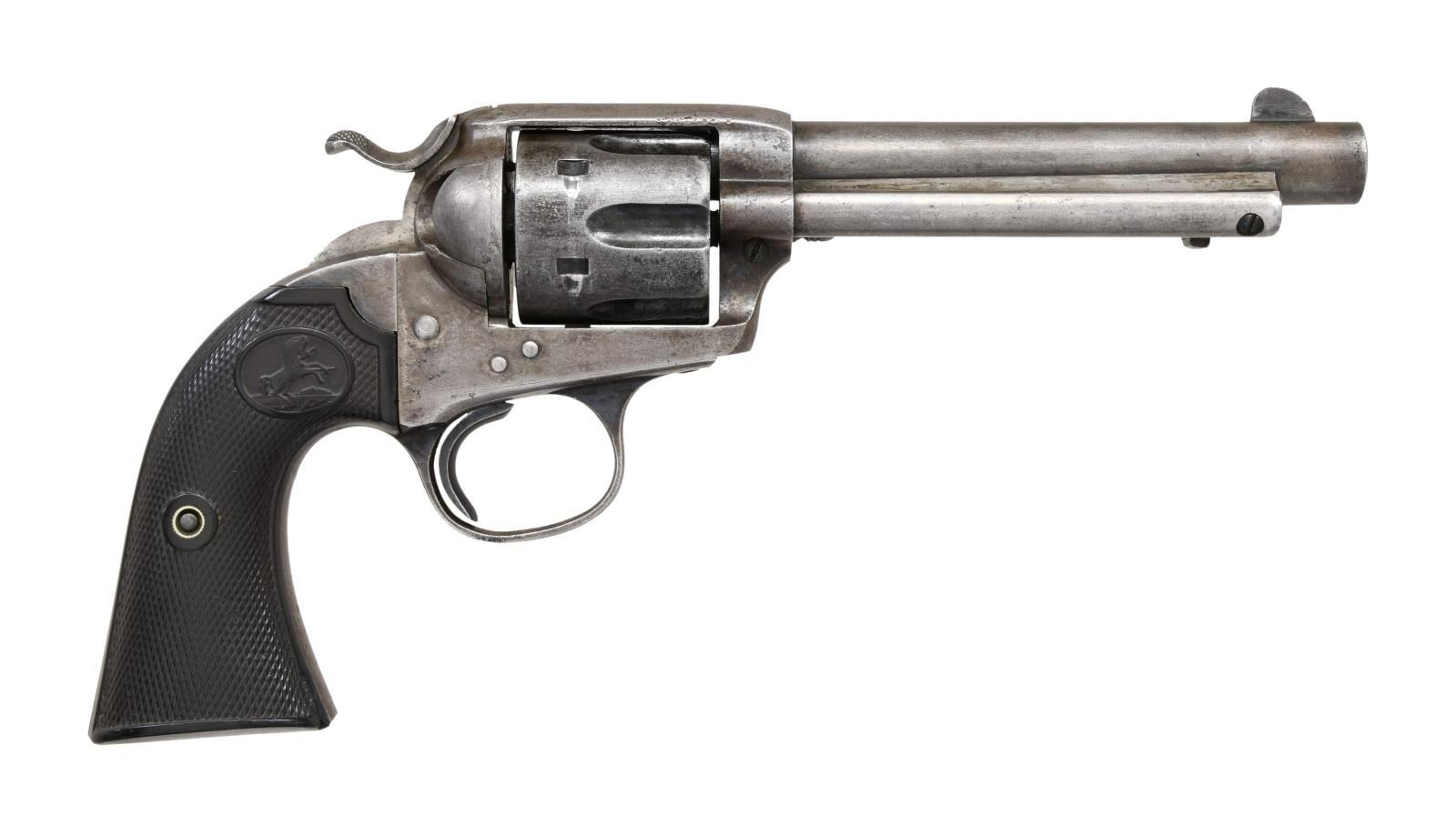 Cal. 38 WCF (38-40). S# 217283. Bbl. 5 1/2". Six shot fluted cyl. Blue & case colored finish. 2 piece checkered hard rubber rampant colt grips. Mfg. 1901. CONDITION: metal finish has faded to gray w/ small amounts of finish remaining in protected areas. Grips show light wear. Action is tight. Hammer retains 4 clicks. Bore has scattered pitting w/ worn rifling. (24-826/DS). CURIO. $1,200-1,800.