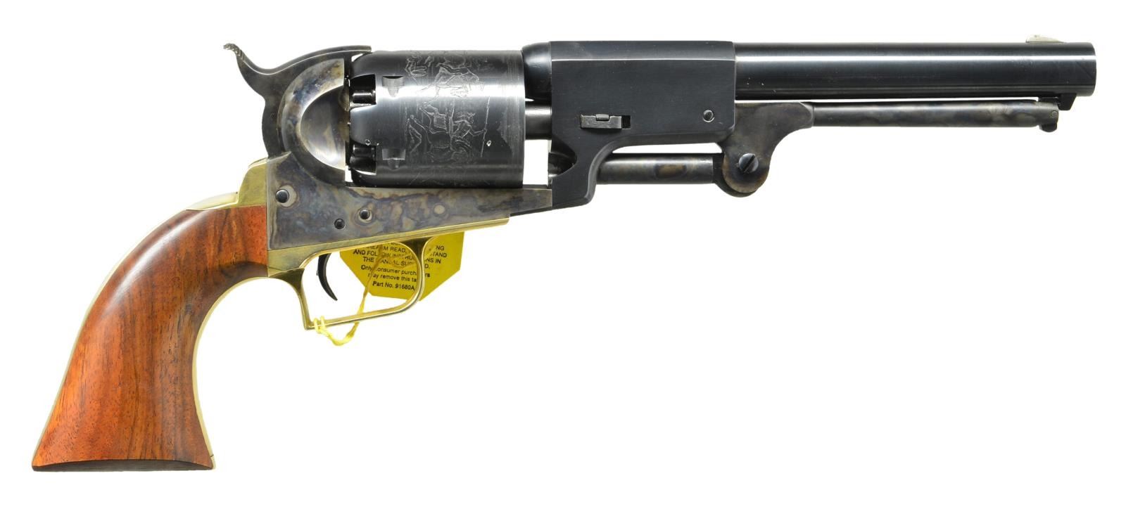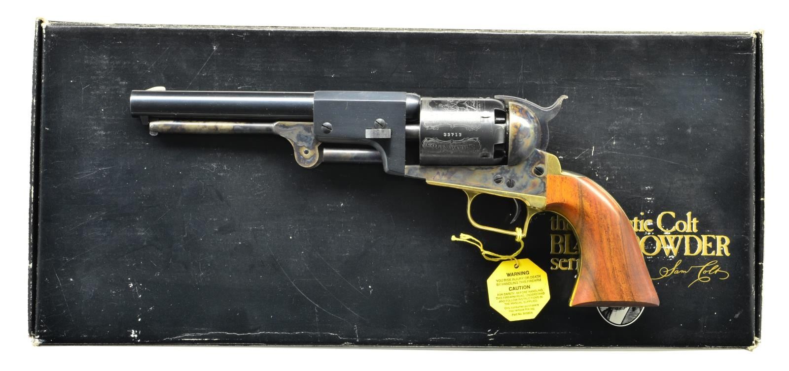Cal. 44. S# 33713. Bbl. 7 1/2" (box label says 8") w/ brass blade sight. Mfg. 1980-1982; 2,700 units in F series having non fluted cyl. w/ Texas Ranger / Indian scene. Matching numbers on cyl., frame, backstrap, trigger guard, wedge & cyl. pivot. One piece walnut grip on 2 piece Dragoon style brass grip frame. Case colored frame, loading assembly & hammer. Desirable 2nd series known for their quality & authentic detail. UNATTACHED ACCESSORIES: very good original black box w/ foam interior having proper paperwork. CONDITION: all aspects near excellent w/ new, unfired appearance. PROVENANCE: Estate Collection of Kenneth Horn (Grandson of JC Higgins). (01-20663/NW). ANTIQUE. $500-750.