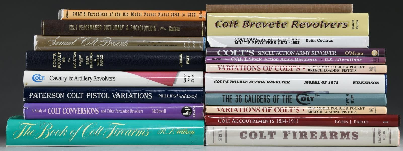 This lot consists of 19 books relating to Colt firearms. 1) COLT CAVALRY & ARTILLERY REVOLVERS A CONTINUING STUDY. Hardcover by John Kopec & H. Sterling Fenn. 304 pgs. Very good condition. 2) THE BOOK OF COLT FIREARMS. Hardcover by R.L. Wilson. 608 pgs. Fair condition w/ dust jacket wear. 3) COLT CAVALRY, ARTILLERY AND MILITIA REVOLVERS (1873-1903). Hardcover by Keith Cochran. 288 pgs. Good condition. 4) VARIATIONS OF COLT'S NEW MODEL POLICE & POCKET BREECH LOADING PISTOLS. Hardcover by John D. Breslin, William Pirie & David Price. Good condition w/ some creasing & writing on inside pages. 5) SINGLE ACTION ARMY REVOLVERS U.S. ALTERATIONS. Hardcover by C. Kenneth Moore. 110 pgs. Good condition w/ some highlighting on pages. 6) THE 36 CALIBERS OF THE COLT SINGLE ACTION ARMY. Hardcover by David Brown. 206 pgs. Good condition. 7) COLT"S SINGLE ACTION ARMY REVOLVER THE LEGEND, THE ROMANCE & THE RIVALS. Hardcover by "Doc" O'Meara. 160 pgs. Fair condition. 8) SAMUEL COLT PRESENTS. Hardcover by R.L. Wilson. 293 pgs. Good condition w/ a handwritten inscription the inside, laminated cover on dust jacket & some shelf wear. 9) COLT FIREARMS FROM 1837. Hardcover by James Serven. 399 pgs. Good condition. 10) PATERSON COLT PISTOL VARIATIONS. Hardcover by Philip Phillips & R.L. Wilson. 232 pgs. Fair condition w/ shelf wear & moderate tears on dust jacket. 11) THE HISTORY AND IDENTIFCATION OF COLT ACCOURTEMENTS 1834-1911 PATERSON TO AUTOMATIC. Hardcover by Robin Rapley. Good condition w/ a personalized hand written inscription from author. 12) VARIATIONS OF COLT'S NEW MODEL POLICE & POCKET BREECH LOADING PISTOLS. Hardcover by John Breslin, William Pirie & David Price. Good conditon w/ handwritten personalized inscription from William Pirie on inside. 13) COLT PEACEMAKER DICTIONARY & ENCYLOPEDIA. Hardcover by Keith Cochran. 256 pgs. Good condition. 14) A STUDY OF COLT CONVERSIONS AND OTHER PERCUSSION REVOLVERS. Hardcover by R. Bruce McDowell. 463 pgs. Good condition w/ some wear to dust jacket & writing on the inside. 15) COLT'S POCKET '49 IT'S EVOLUTION. Hardcover by Robert Jordan & Darrow Watt. 304 pgs. Good condition w/ hand written personalized inscription on the inside from Darrow Watt. No dust jacket present. 16) COLT'S VARIATIONS OF THE OLD MODEL POCKET PISTOL 1848 TO 1872. Hardcover by P.L. Shumaker. 150 pgs. Fair condition w/ notable dust cover wear & some tears. 17) COLT'S DOUBLE_ACTION REVOLVER MODEL OF 1878. Hardcover by Don Wilkerson. 431 pgs. Very good condition. 18) COLT COMMEMORATIVE FIREARMS. Hardcover by R.L. Wilson. 123 pgs. Good Condition. 19) COLT BREVETE REVOLVERS. Hardcover by Roy Marcot & Ron Paxton. 361 pgs. Good condition. PROVENANCE: From the Collection of James B. Taylor. (02-19918-2/MJC). $500-800.