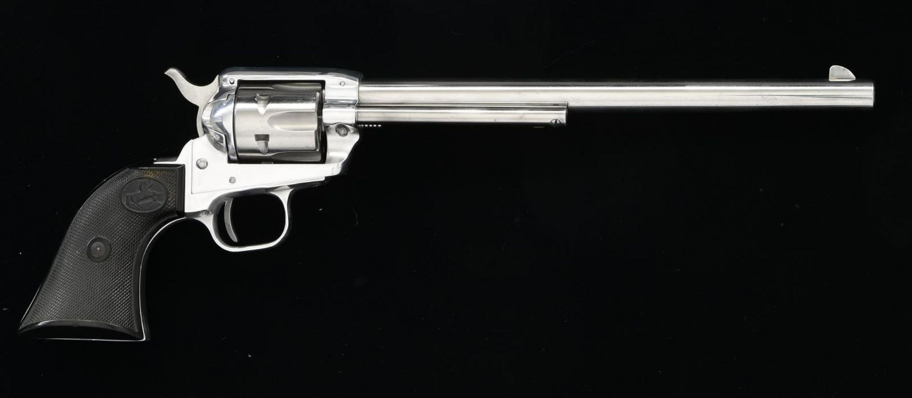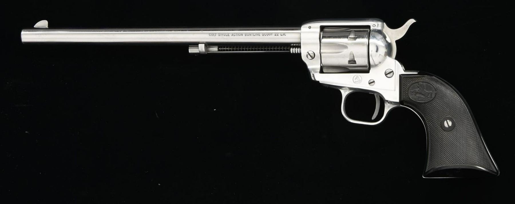 Cal. 22 LR. S# 185750F. Bbl. 9 1/2". Buntline Scout SA revolver mfg. by Colt in 1965. The left side of the bbl. is marked "COLT SINGLE ACTION BUNTLINE SCOUT .22 L.R.", with Colt's single line address across the top. Left side of frame is marked with the encircled Rampant Colt standing atop a globe logo. Metal components exhibit a nickel plated finish, with the frame being mounted with 2 piece Colt checkered black plastic grips. CONDITION: metal components retain bountiful amounts of their original factory applied finish, exhibiting some scattered superficial marks from handling and storage, with some spots of light surface oxidation. Cyl. exhibits some light spots of surface oxidation and a couple concentrated spots of light pitting. Mirror bore, exhibiting well defined rifling throughout. Grips show some scattered marks and impressions from handling and storage, but otherwise remain sturdy and serviceable. PROVENANCE: The Collection of Gun Sport Ltd owned by Jon R. Thomas. (23-4185/MLW). CURIO. $500-800.