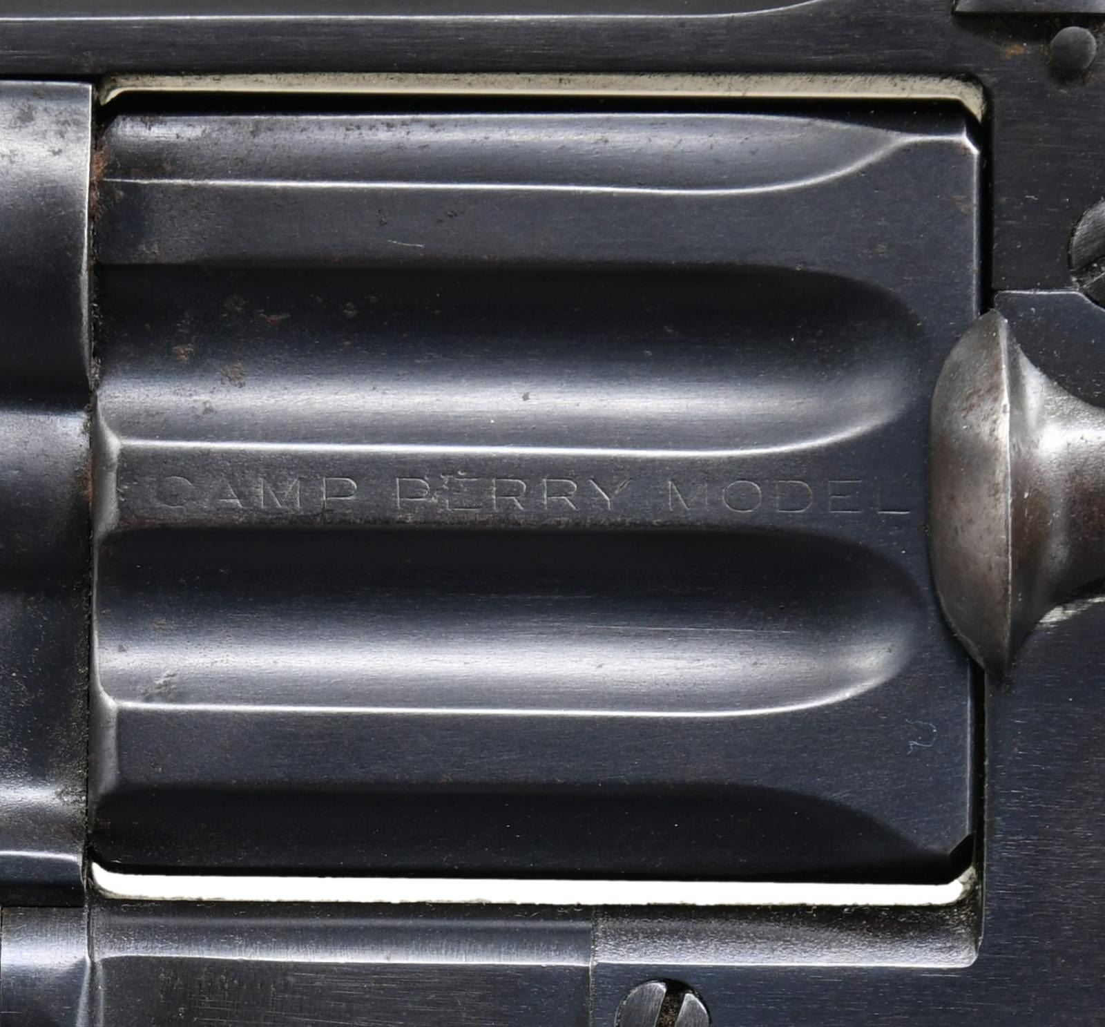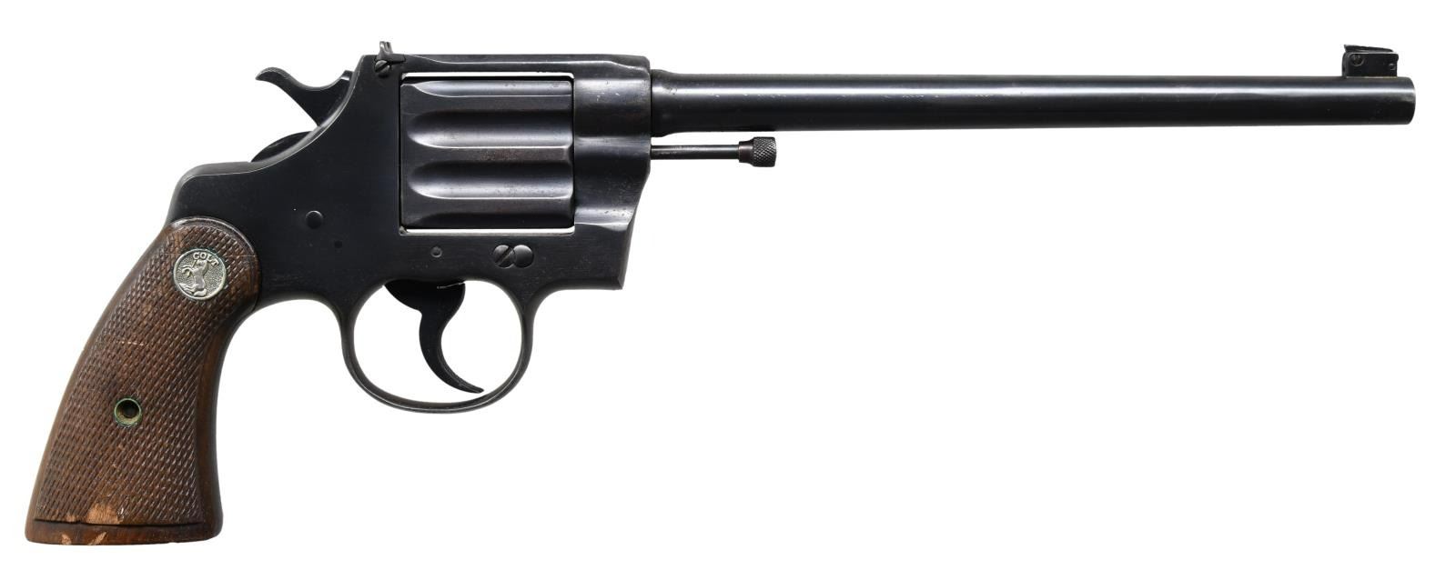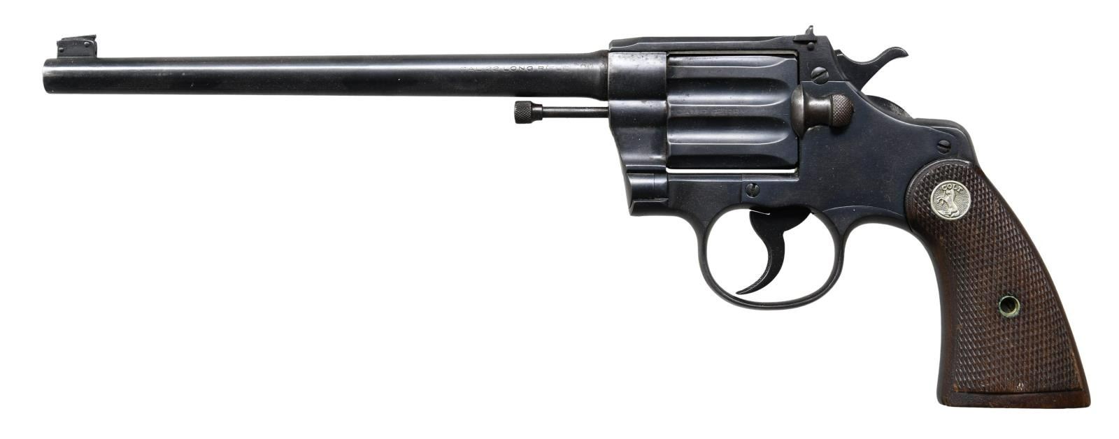 Cal. 22 LR. S# 787. Bbl. 8 1/4" rnd. Elevation adj. front sight w/ windage adj. square notch rear sight. Left side of chamber block is marked "CAMP PERRY MODEL". 2 Piece checkered walnut grips w/ silver rampant colt medallions. Unique single shot pistol built on a revolver frame. Total production of 2,525 mfg. 1926-41. CONDITION: metal retains 95% reblued finish showing scattered spots of corrosion & handling marks. Grips show moderate wear w/ chips, dents & handling marks. Functioning action. Bore is bright retaining lightly worn rifling. (23-5568/DS). CURIO. $800-1,200.