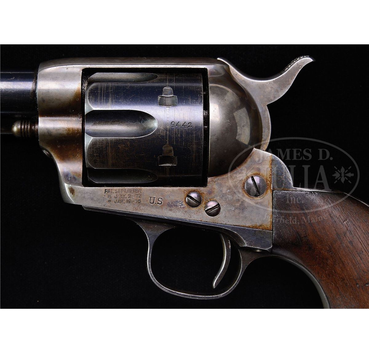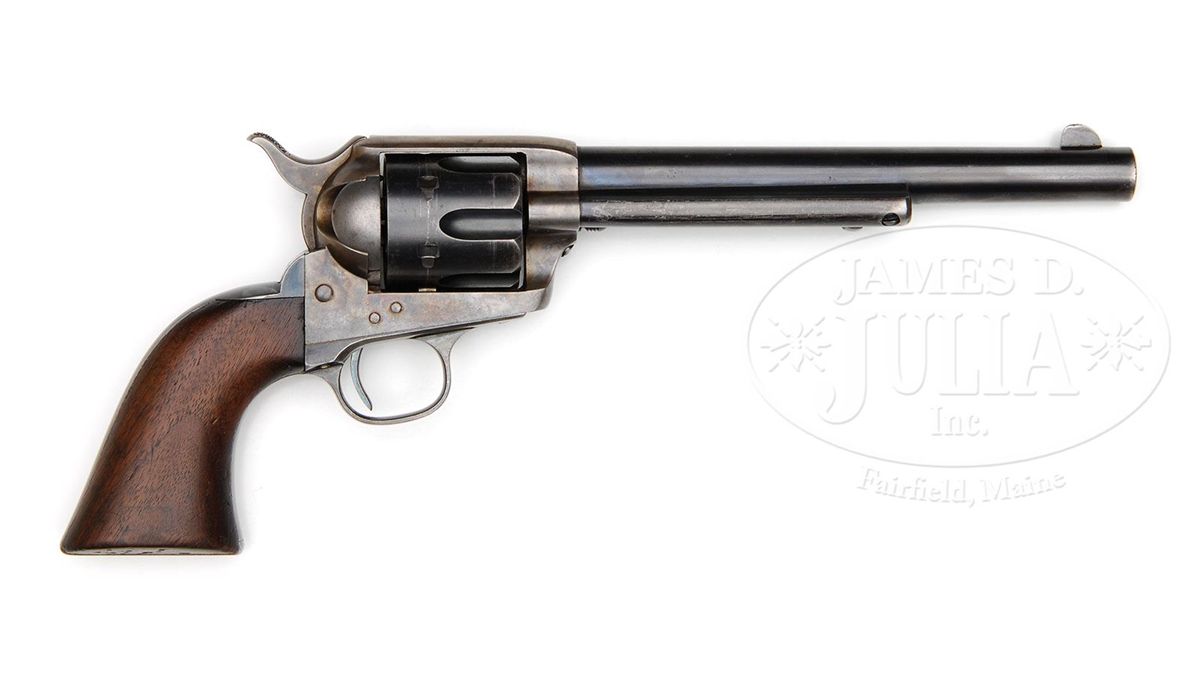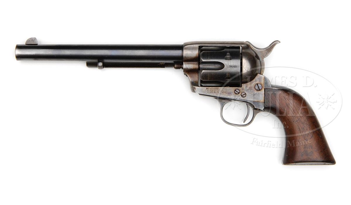 SN 119442. Cal. 45 Colt. Blue and color cased hardened with 7-1/2" bbl, slightly dinged front sight and block letter 1-line address. Left side of frame has 3-line patent dates and "U.S". Ejector housing is 3rd type with half-moon ejector rod head. Mounted with the correct 1-pc walnut grip whose SN in backstrap channel is obscured. Left side of grip has the legible cartouche "JGB" (Capt. John G. Butler) under the date 1887 and the right side has the outline of the "DFC" (David F. Clark) sub-inspector cartouche. This revolver originated in the 11th contract signed Nov 4, 1886 for 2,000 revolvers, which was completed by March 24, 1887. Capt. Butler was the only inspector whose cartouche is without a border, the reason for which is unknown. The "DFC" inspector initials are also found on left bottom edge of grip, frame, bottom of bbl and cyl. Revolvers of this series were generally issued to the cavalry regiments stationed on the American Frontier and generally saw hard and continuous service during the Indian Wars, and afterwards, and are rarely found with high orig finish. CONDITION: Very fine, all matching except grip, as noted. Bbl retains 96-97% strong orig blue with strong feathers on both sides of front sight and both sides of ejector housing stud; ejector housing retains strong orig blue in gullets, moderately thinned on outer radius; frame and hammer retain strong case colors, moderately faded on the left recoil shield and front sides of frame; loading gate is a gray metal patina; cyl retains about 90% thin blue, stronger in the flutes; trigger guard and backstrap retain strong blue in sheltered areas with a gray frontstrap and center of the backstrap; bottom of grip shows numerous nicks and dings with no corresponding damage on buttstrap, indicating that this may be a period of use orig equipment replacement; grip has a slightly chipped left heel, otherwise is sound, showing a heavy hand worn patina; mechanics are crisp; bright shiny bore. 4-47539