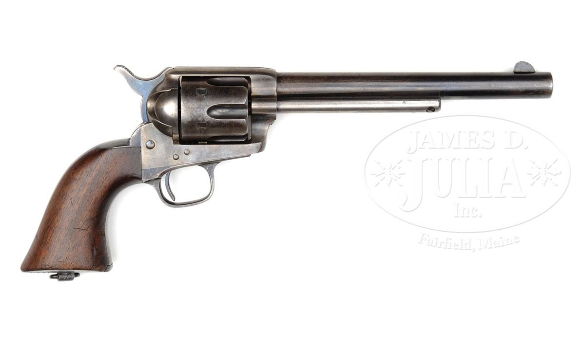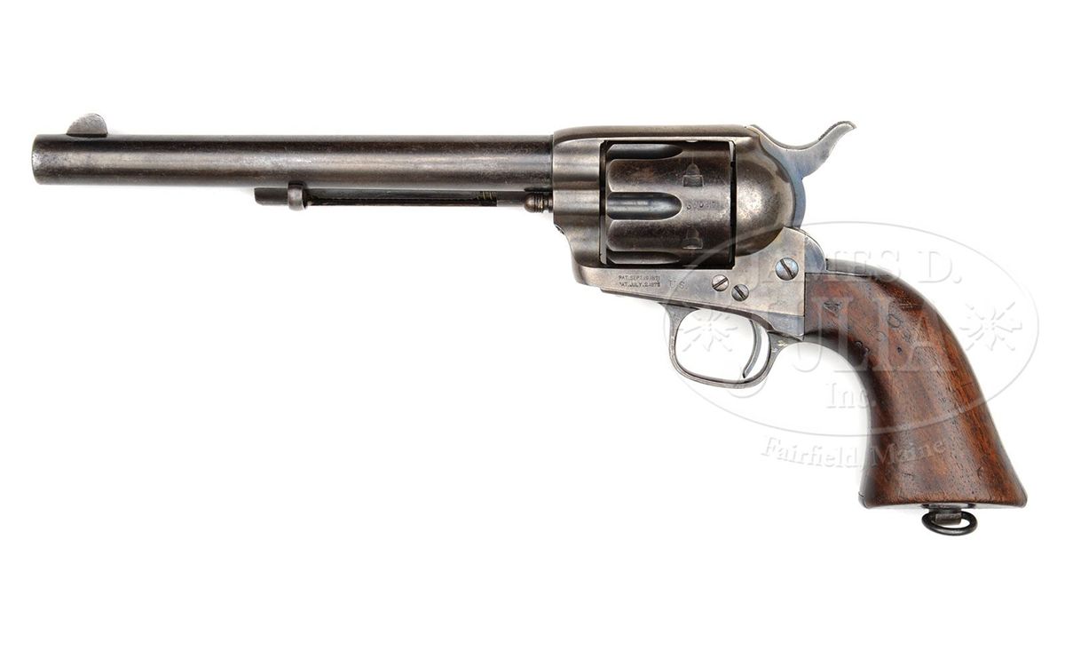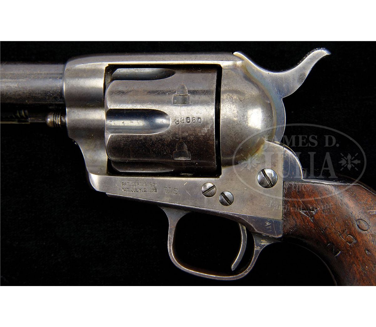 SN 33060. Cal. 45 Colt. Blue & color case hardened with 7-1/2" bbl, full front sight and 1-line block letter address. Left side of frame has 2-line, 2-patent dates and a small "U.S.". Mounted with 1-pc walnut grip that is stamped on left side "A / 250" which is Batallion A of the New York Militia and rack #250, and has matching SN in backstrap channel. Buttstrap is fitted with a swivel as found on a number of New York Militia revolvers. Frame has the sub-inspector initials "J.T.C." (John T. Cleveland) which are also found on bottom of bbl & cylinder. Grip is marked on bottom right edge "RAC" (Rinaldo A. Carr) whose inspector mark was applied during the Colt restoration in 1895. During the restoration process two additional matching numbers were added to the bbl SN and cyl number. It also appears that the middle "0" on the cylinder is stamped over another number. This revolver is listed by SN on p. 49 of Colt Cavalry and Artillery Revolvers...A Continuing Study, Kopec & Fenn, as having been issued to the New York Militia. CONDITION: About fine, all matching including grip. Bbl retains about 70% orig blue, strong in sheltered areas, thin and turning to a plummy blue patina elsewhere; frame retains about 60% faded case colors, a little stronger in sheltered areas; hammer retains 60-70% fire blue; cyl retains 50-60% thin blue; trigger guard & backstrap retain strong blue in sheltered areas, blue/brown patina elsewhere. Grip has a chipped right toe and shows moderate to heavy wear and retains a hand worn patina. Hammer is not solid in half-cock notch, otherwise mechanics are fine, strong bore with moderate to heavy pitting. 4-48788 JR345