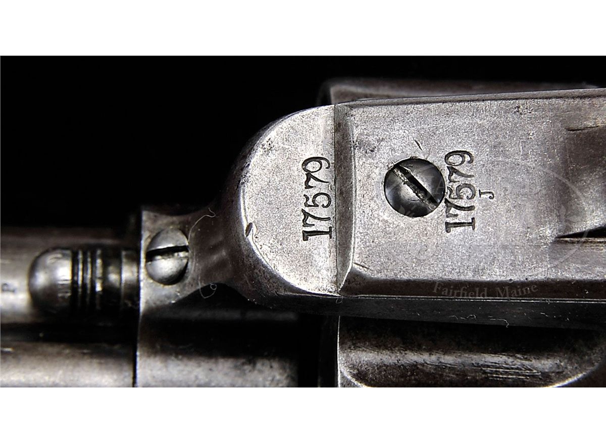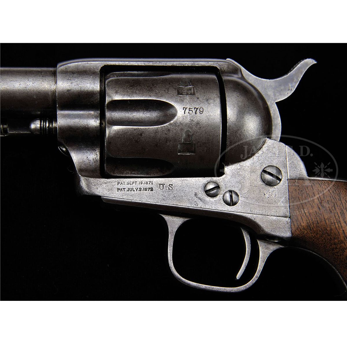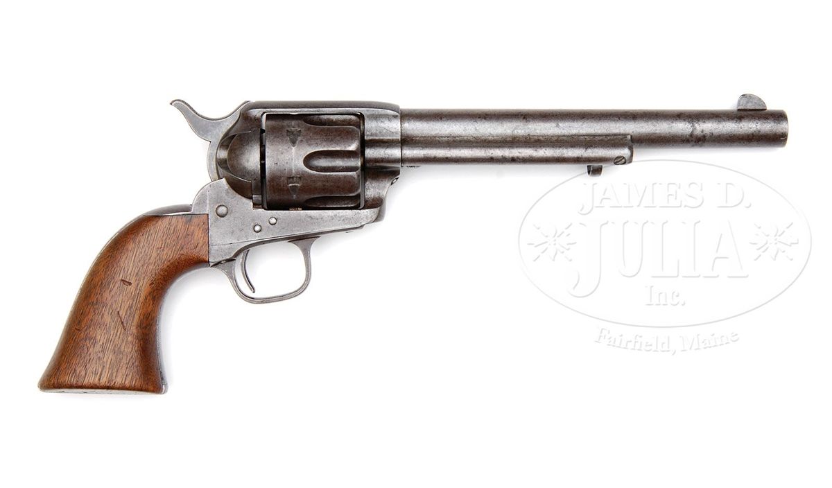 SN 17579. Cal. 45 Colt. Usual configuration with bbl slightly reduced to 7-3/8", full front sight and 1-line script letter address with serifs. Left side of frame has 2-line patent dates and a small "U.S". Mounted with a 1-pc, period of use replacement walnut grip. Bottom of the bbl, trigger guard, back strap & cyl are all marked with a tiny "J" (believed to be W.W. Johnson) sub-inspector initials. Ejector housing is first type with bull's eye ejector rod head and base pin is orig type with dimpled ends. Grip is without inspector cartouches or initials and if there was a SN in the back strap channel it is obscured by oil staining. Regardless, grip appears to be a period of use replacement that fits nearly perfectly. This revolver was produced in 1875, at the height of the Indian Wars and almost certainly would have seen service with a front line cavalry unit on the American frontier. The fact that it escaped the recalls of the 1890s and early 1900s attests to the theory that it may have been lost in battle, stolen or possibly assigned to a militia unit. During those recalls most cavalry revolvers were reworked to artillery configuration with 5-1/2" bbls. This revolver is listed, by SN, on p. 43 of Colt Cavalry and Artillery Revolvers...A Continuing Study, Kopec & Fenn, in a group of known revolvers with "J" sub-inspector initials. Several other revolvers from this series are known to have been 7th Cavalry replacement revolvers after the Battle at Little Big Horn. CONDITION: Very good, all matching, except grip as noted. Traces of orig finish remain in the most sheltered areas being mostly a clean gray metal patina with some fine pitting near the muzzle on the right side; hammer retains strong case colors. Grip is sound showing heavy wear and a hand worn patina. Mechanics are solid, strong bright bore with a few scattered spots of light pitting. 4-48238