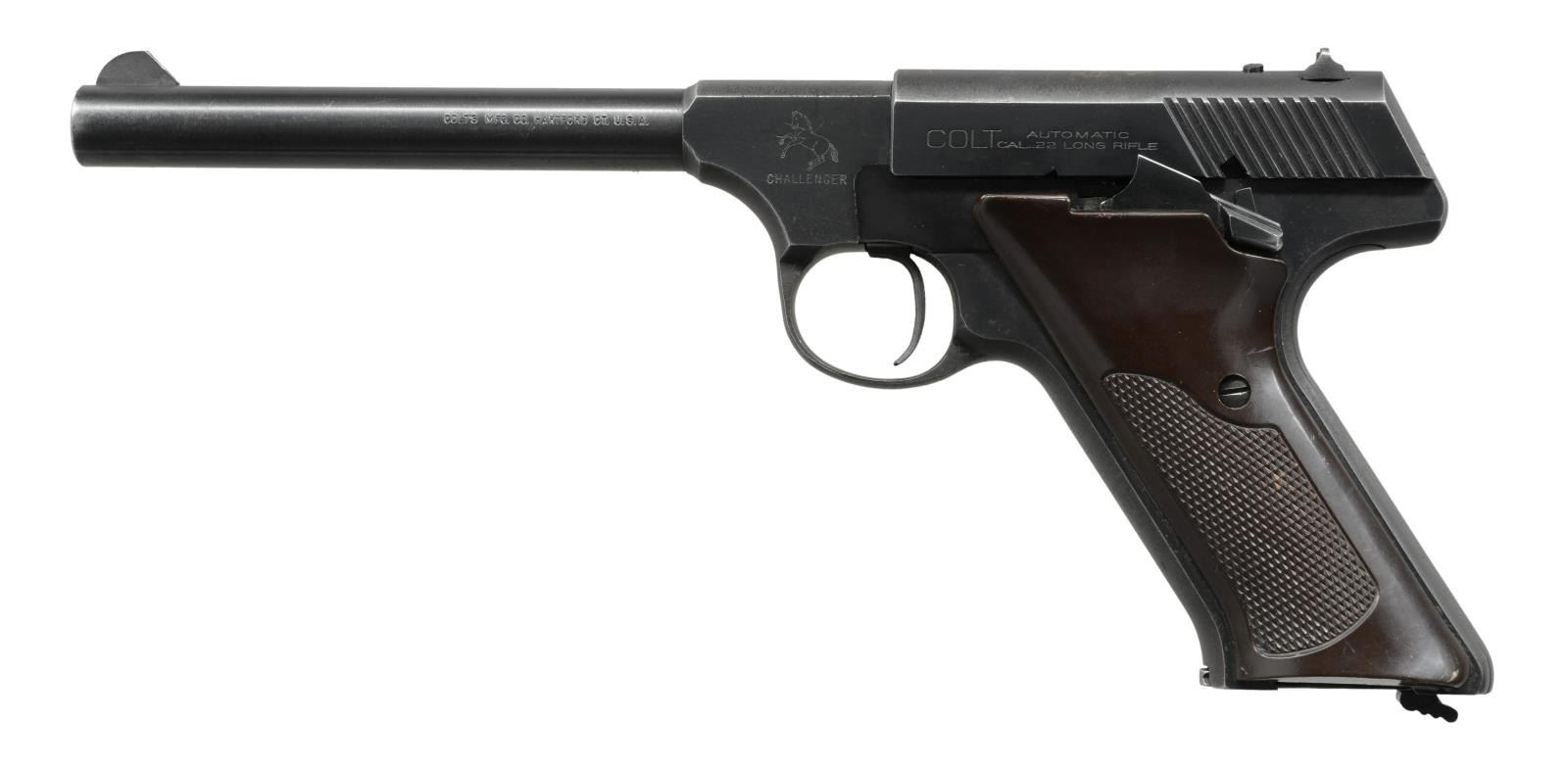 Cal. 22 LR. S# 67580-C. Bbl. 6" with serrated blade plus drift adjustable rear sight on slide. Mfg. 1953 (1950-1955; approx. 77,000 units) with brown checkered plastic grips and bottom mag. release. Grooved trigger and made without auto hold open latch. MAGS: factory all blue 10 rd. with two line base. CONDITION: good plus with thinning of finish, occasional faint marks and some very light peppery oxidation. Very good grips with light separation at top front of left due to replacement sideplate screw having thicker than normal head. Near excellent bore. (23-1496/NW). CURIO. $300-450.