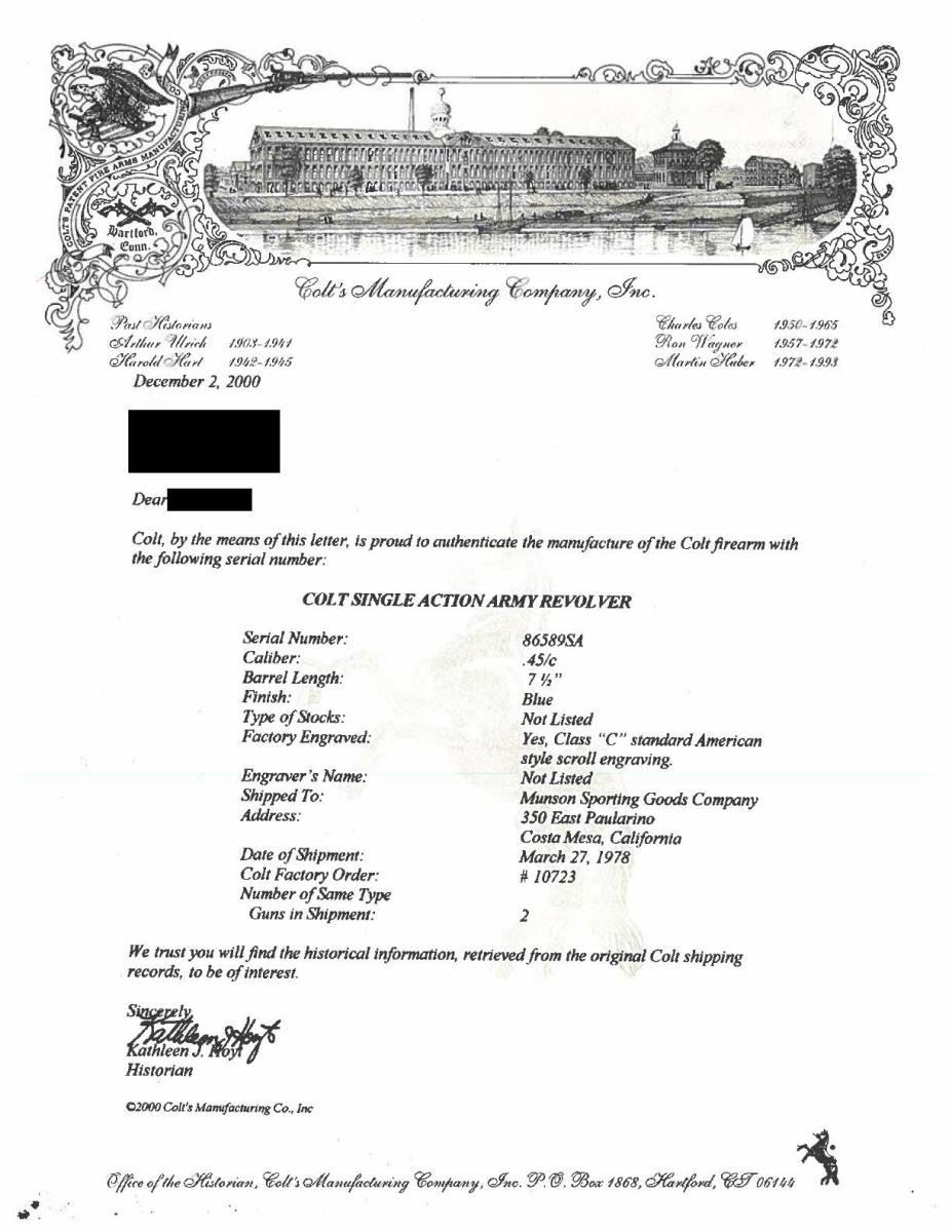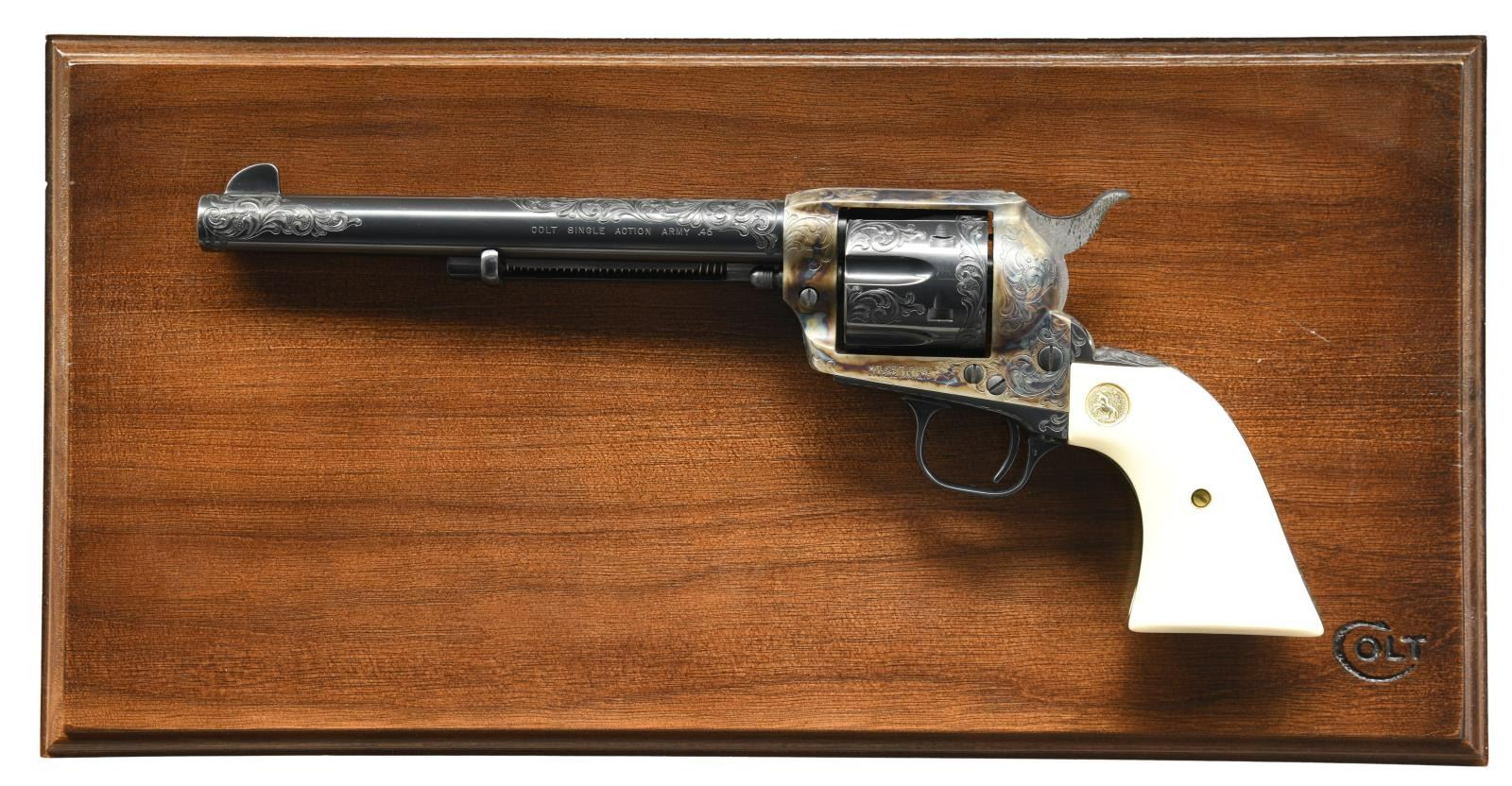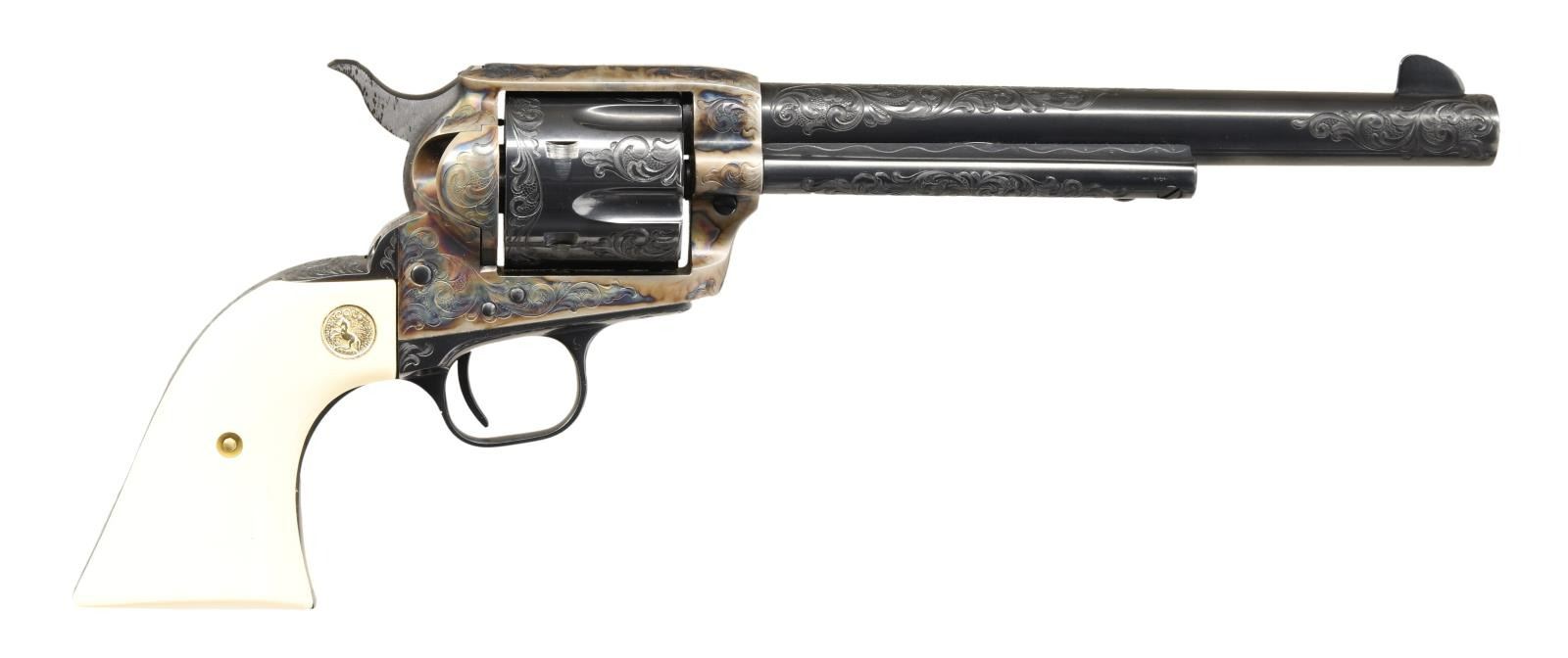 Cal. 45 Colt. S# 86589SA. Bbl. 7 1/2". Six shot fluted cyl. blue & case colored finish. Class C standard American style scroll factory engraving. 2 piece Ivory grips w/ gold rampant Colt medallions. UNATTACHED ACCESSORIES: letter from Colt's Manufacturing Company, Inc. detailing the following information, "Serial Number: 86589SA. / Caliber: .45/c / Barrel Length: 7 1/2" / Finish: Blue / Type of stocks: Not Listed / Factory Engraved: Yes, Class "C" standard American style scroll engraving. / Engraver's Name: Not Listed / Shipped To: Munson Sporting Goods Company / Address: 350 East Paularino Costa Mesa, California / Date of Shipment: March 27, 1978 / Colt Factory Order: #10723 / Number of Same Type Guns in Shipment: 2". Housed in a wood presentation case w/ red velour fitted interior & case key. CONDITION: near excellent retaining 99% blue & case colored finish. Polished sides of hammer have acquired a spotted tarnish. Bright near excellent bore. Near excellent grips. PROVENANCE: from The Collection of Gun Sport Ltd owned by Jon R. Thomas. (23-3896/DS). MODERN. $4,500-6,500.